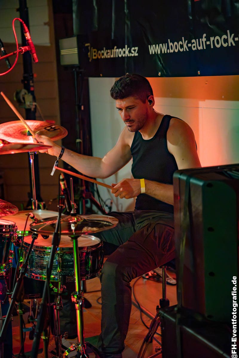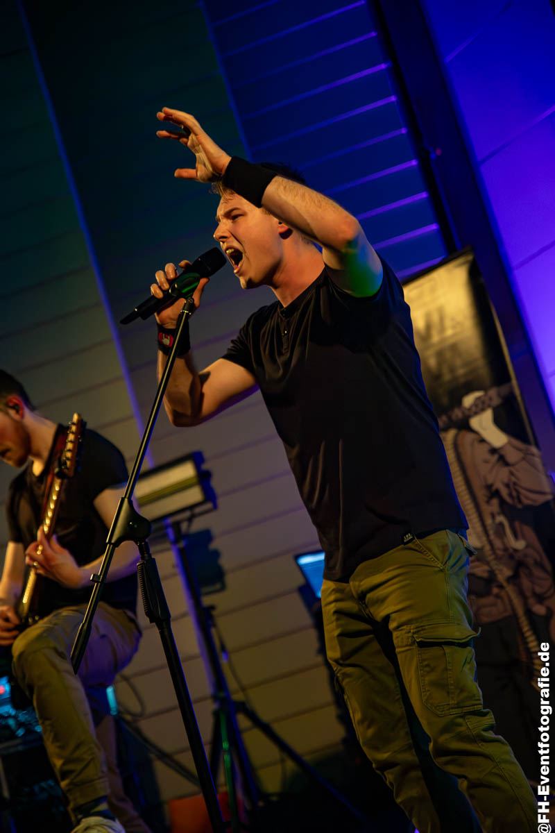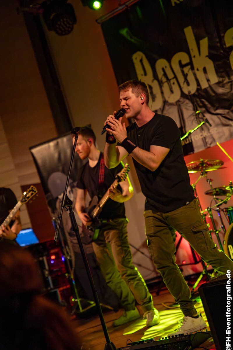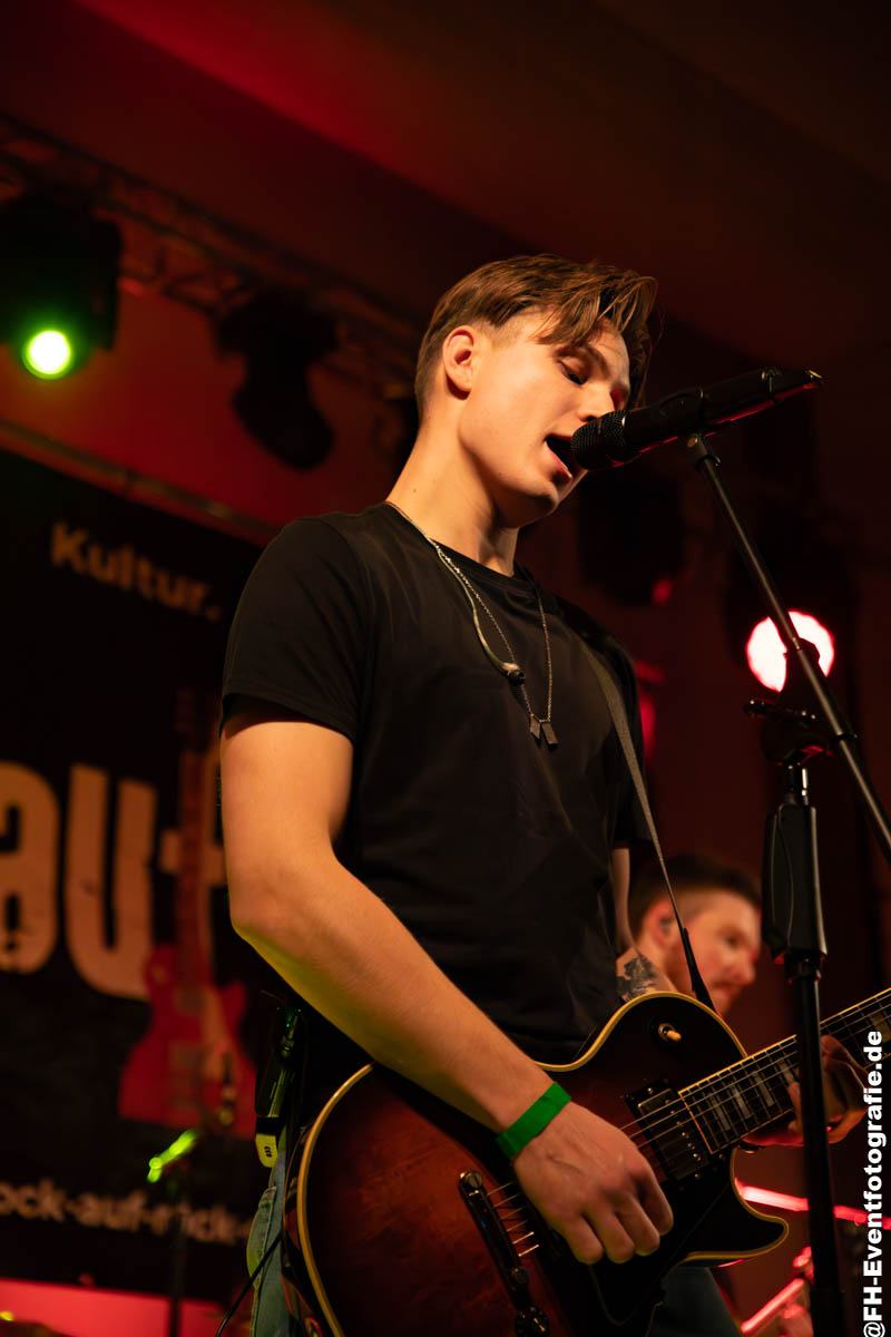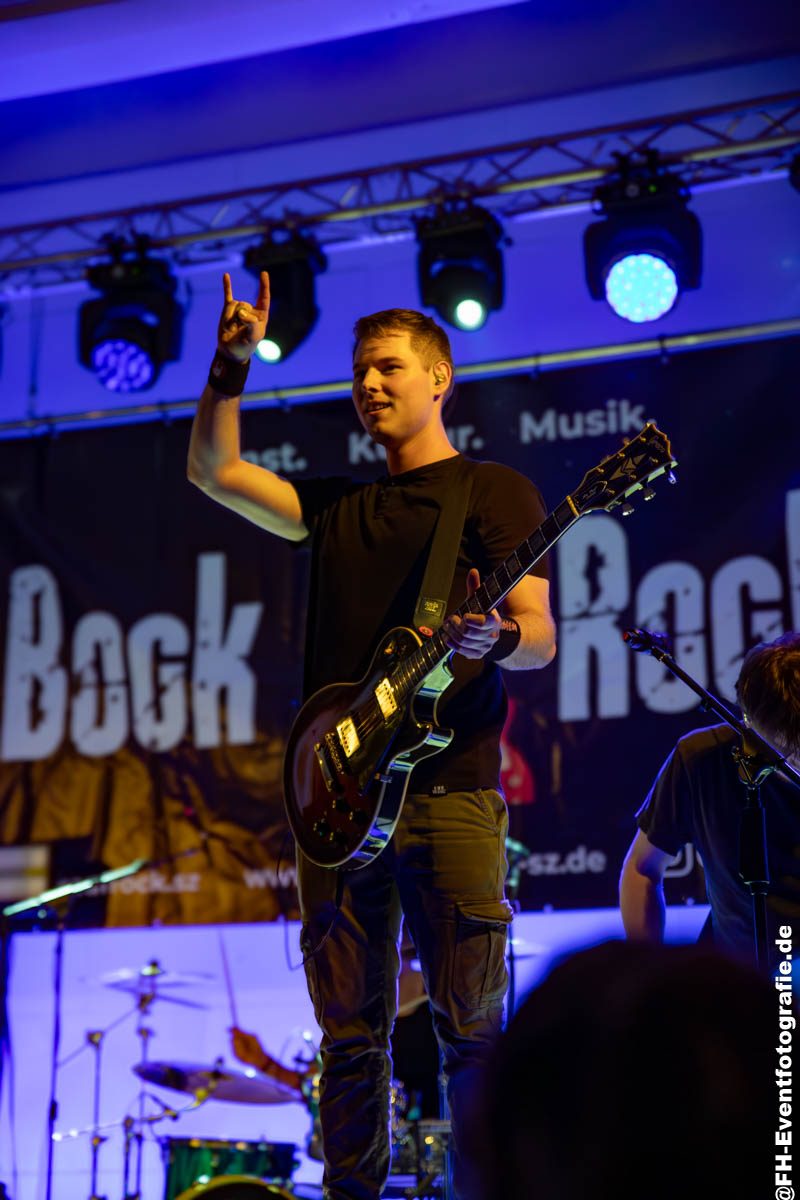 Das haben die Organisatoren von Bock auf Rock geschafft. Die Seitenbühne ist eine kleine schön ausgeleuchtete ebenerdige Fläche. Dort spielten in den Umbaupausen junge Musiker und Musikerinnen. Die ersten Pausen und die erste musikalische Begrüßung machten die beiden jungen Damen Jana Krupp und Kiara. Die beiden sangen teils Solo, teils im Duett zu aktuellen Songs im Stile von Karaoke. Klingt jetzt wirklich weniger gut, als es war. Die beiden haben wirklich gut geklungen und für die gegebene Technik, die dort für die kleine ›Bühne‹ zur Verfügung stand, war das eine tolle Idee der Veranstalter. Die letzten drei Umbaupausen spielte Oskar. Der junge Mann machte es wie viele Singer-Songwriter. Barhocker, Gitarre und Stimme, das reicht. Für Oskar auf jeden Fall. Ich habe selten so kurzweilige Umbauphasen erlebt wie dort.