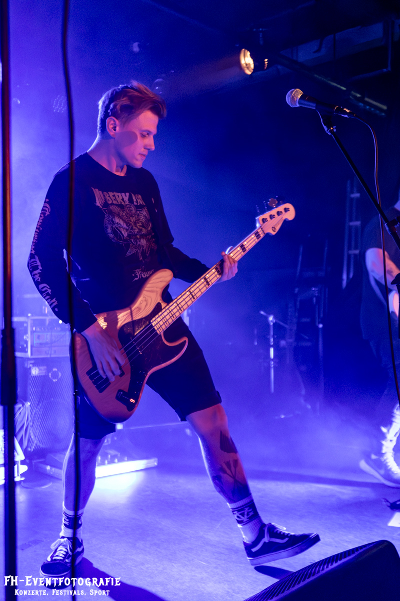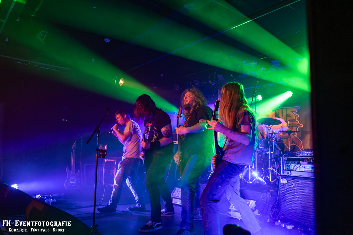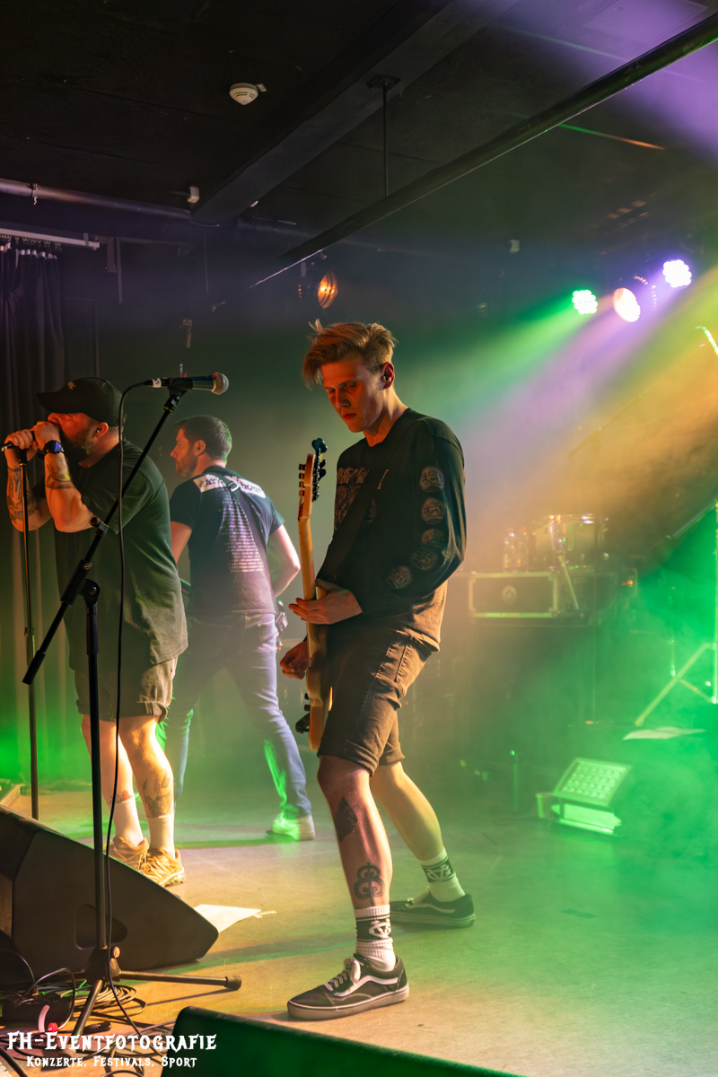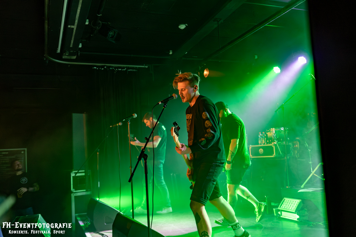 Die Magdeburger Untergangspropheten starteten den Abend mit dem erhobenen Zeigefinger und einem imaginären Mittelfinger an die Irren dieser Welt. An die Scheiße, die in der Vergangenheit der Welt passiert ist, kann und muss erinnert werden. Tinnitus Attack haben ihren ganz eigenen brachialen Weg gewählt, um zu ermahnen und aus der Vergangenheit zu lernen. Geiler aggressiver Scheiß und das schon als erste Band des Abends. Da war ich musikalisch ja schonmal voll dabei. Musik, die bei mir nur live geht und genau dafür ist sowas Kleines wie das Kino im Hallenbad perfekt.