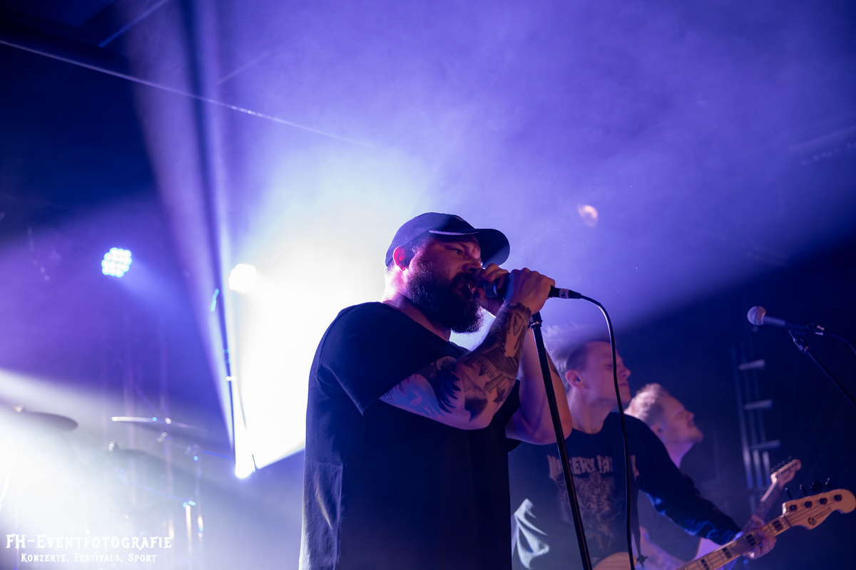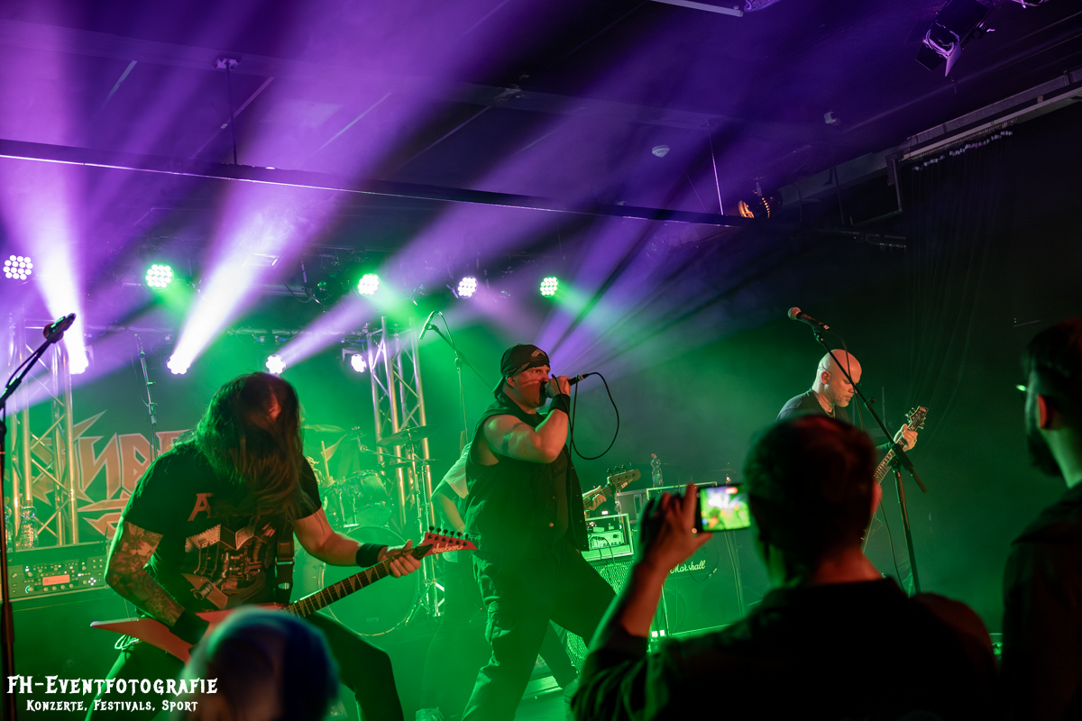 Nach einem soliden Anstehen für den bayerischen Gerstensaft ging es zurück in den mittlerweile reichlich warmen und vollen Kinosaal. Surgical Strike erwarteten unsere Aufwartung. Wer ruft, wird erhört. Diese Band und auch die Headliner Hiraes waren sicher einer der Gründe, weshalb auch viele Besucher aus dem weiten Umland den Weg nach Wolfsburg angetreten hatten. Die Jungs aus Hannover sind nun mal über die Jahre zu so einer Größe geworden, dass sie fast so viel Bühnenpräsenz haben, wie die vielen Bands, mit denen sie bereits auf den Festivals dieser Welt die Bühnen geteilt haben. Mit Band drei begann dann auch das erste Eskalieren. Unfassbar, was die für eine Power von der kleinen Bühne in die Fans pumpten.