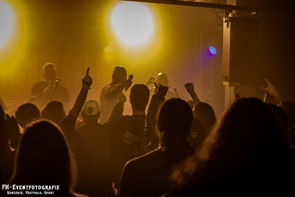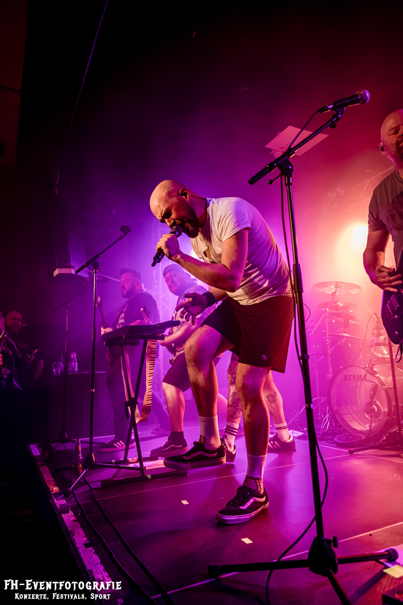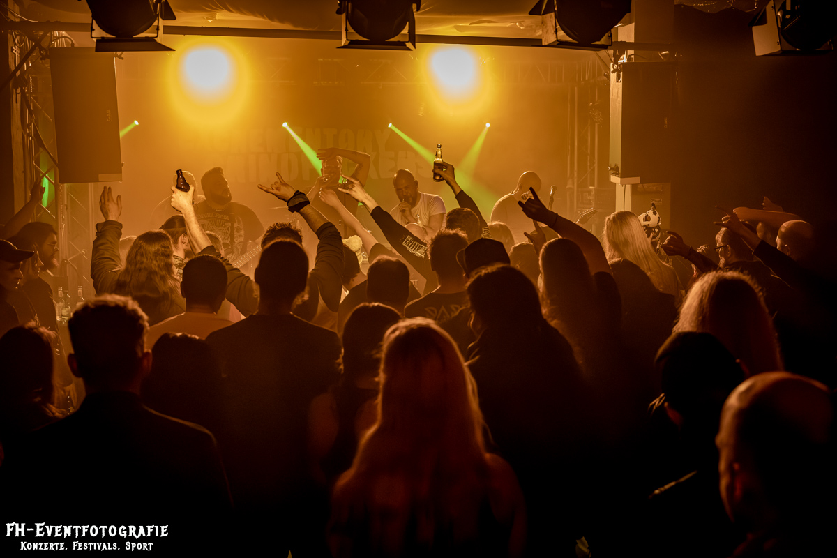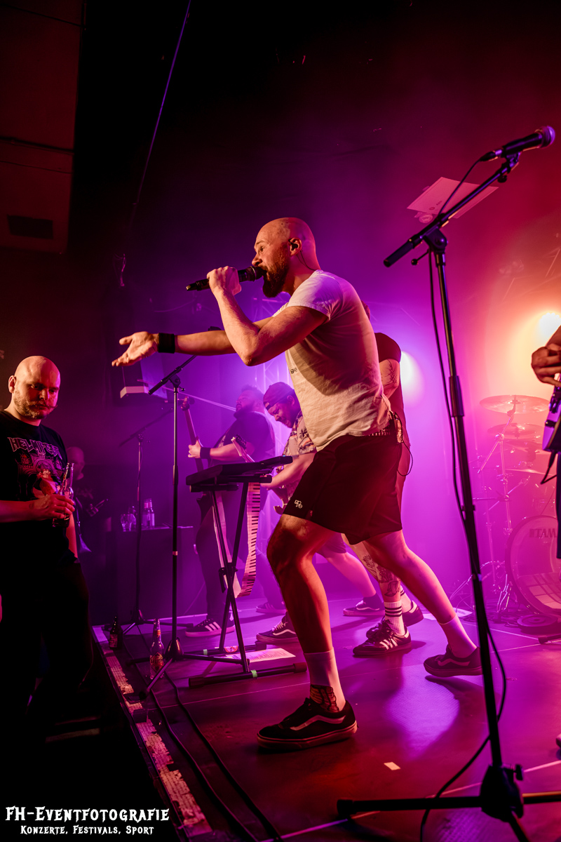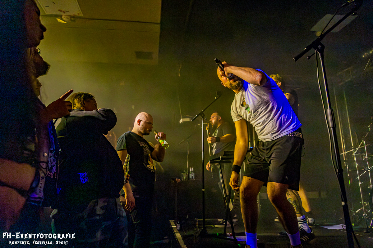 Den zweiten Gig des Abends hatten die Wolfsburger von Repulsive Feast. Wozu benötigt man eigentlich eine transparente Bassdrum? Damit man den Schlagzeuger sieht. War hier wirklich hilfreich. Die Bühne, mit Nebel und einem fiesen Violett geflutet, standen dort die drei Musiker der Band. Ich korrigiere mich, zwei standen, der Dritte saß natürlich. Barfuß an seinem Schlagzeug und spielte nicht nur die Drums, sondern sang auch. Ich bin mir ziemlich sicher, dass ich bisher noch nie eine Band erleben durfte, wo jedes Mitglied auch seinen Part am Gesang hatte. Die haben auch echt Spaß gemacht und dabei bin ich eigentlich gar kein Death- und Grindcore Fan.