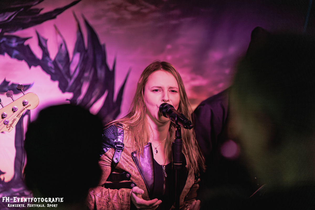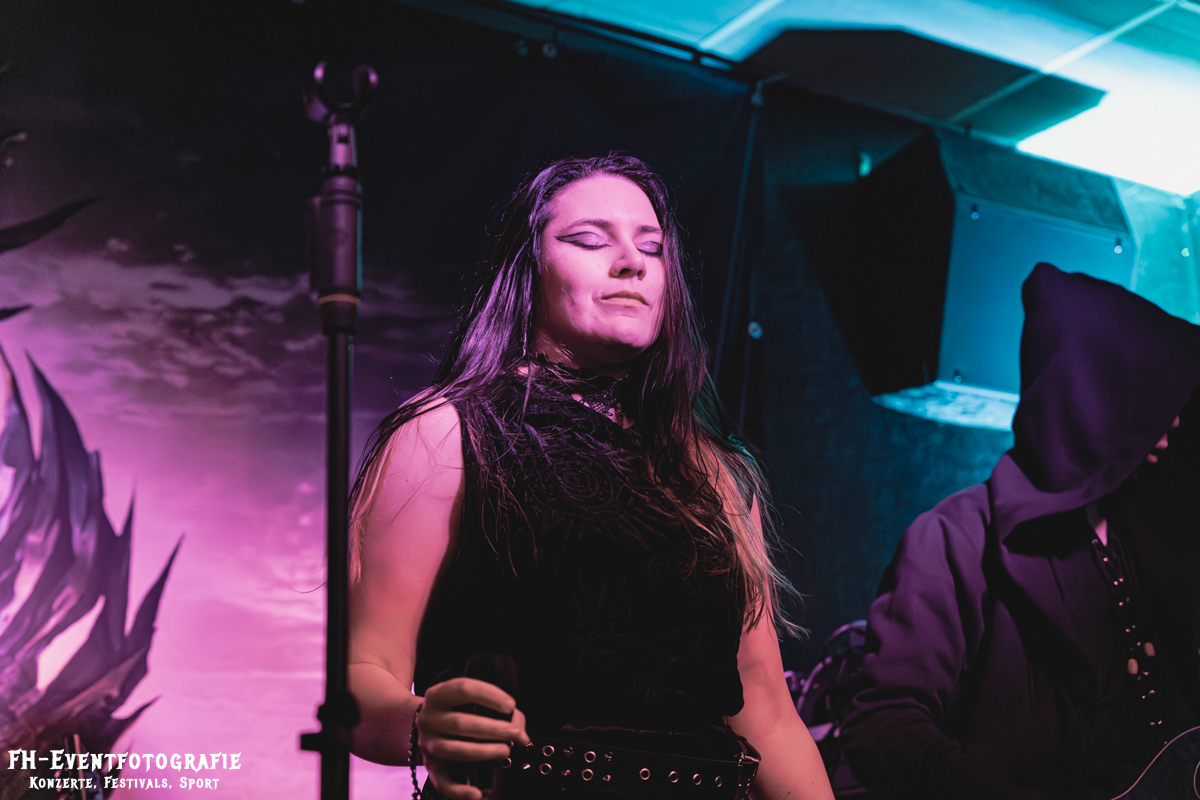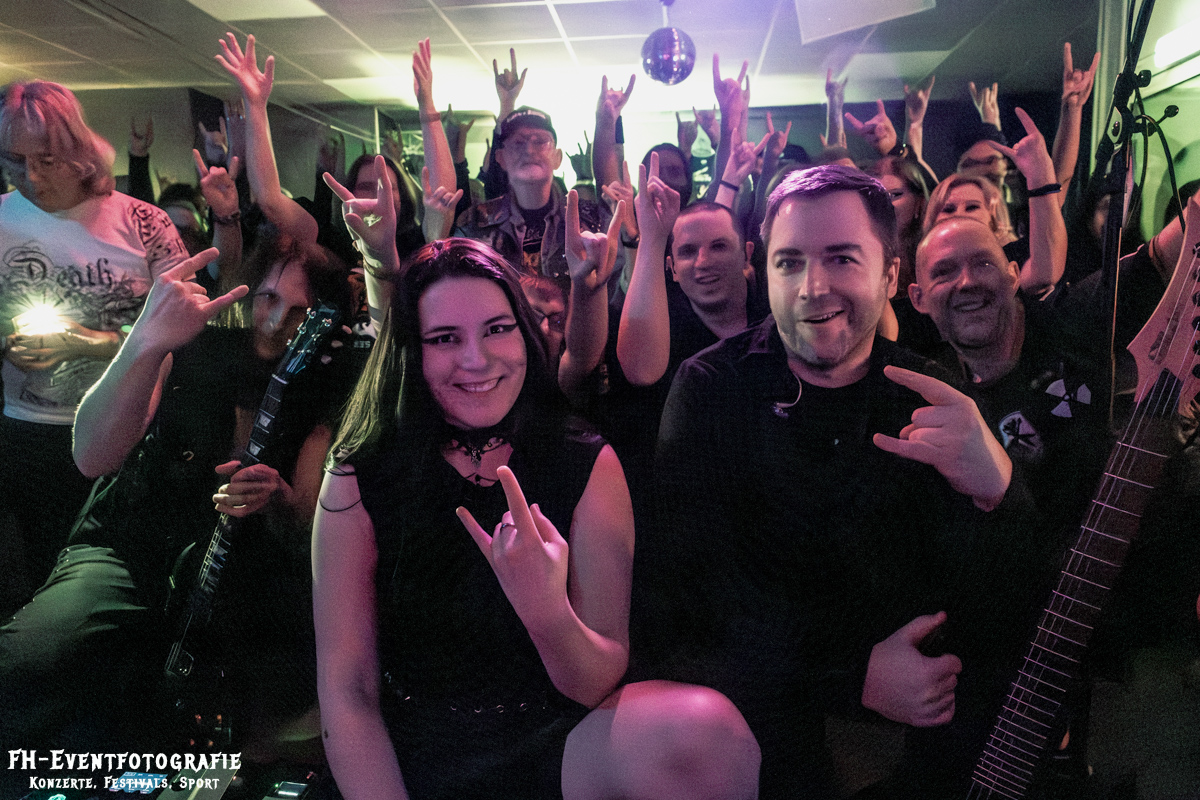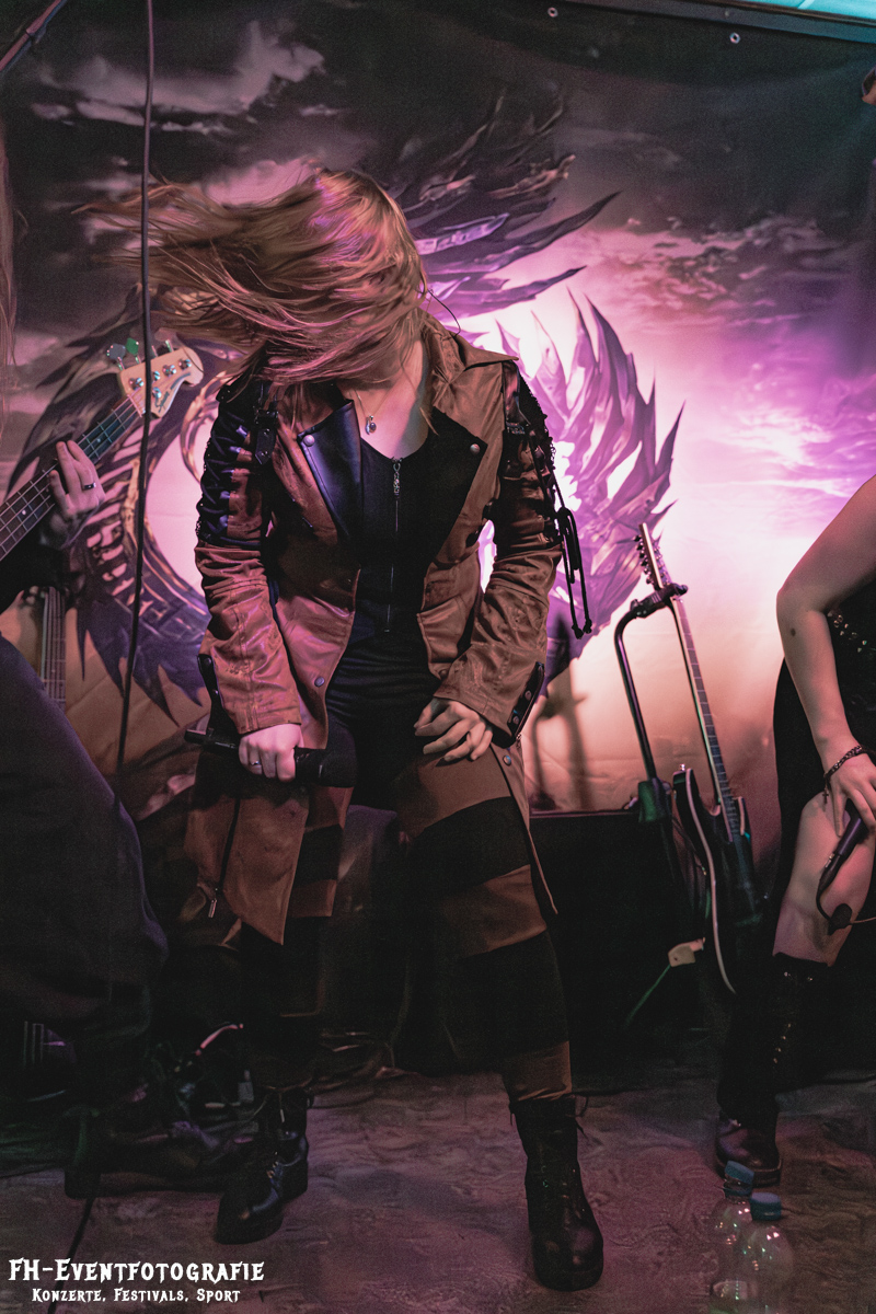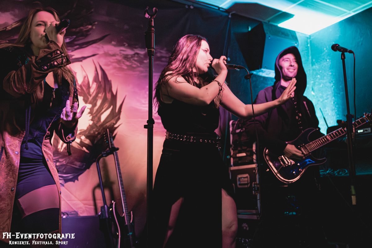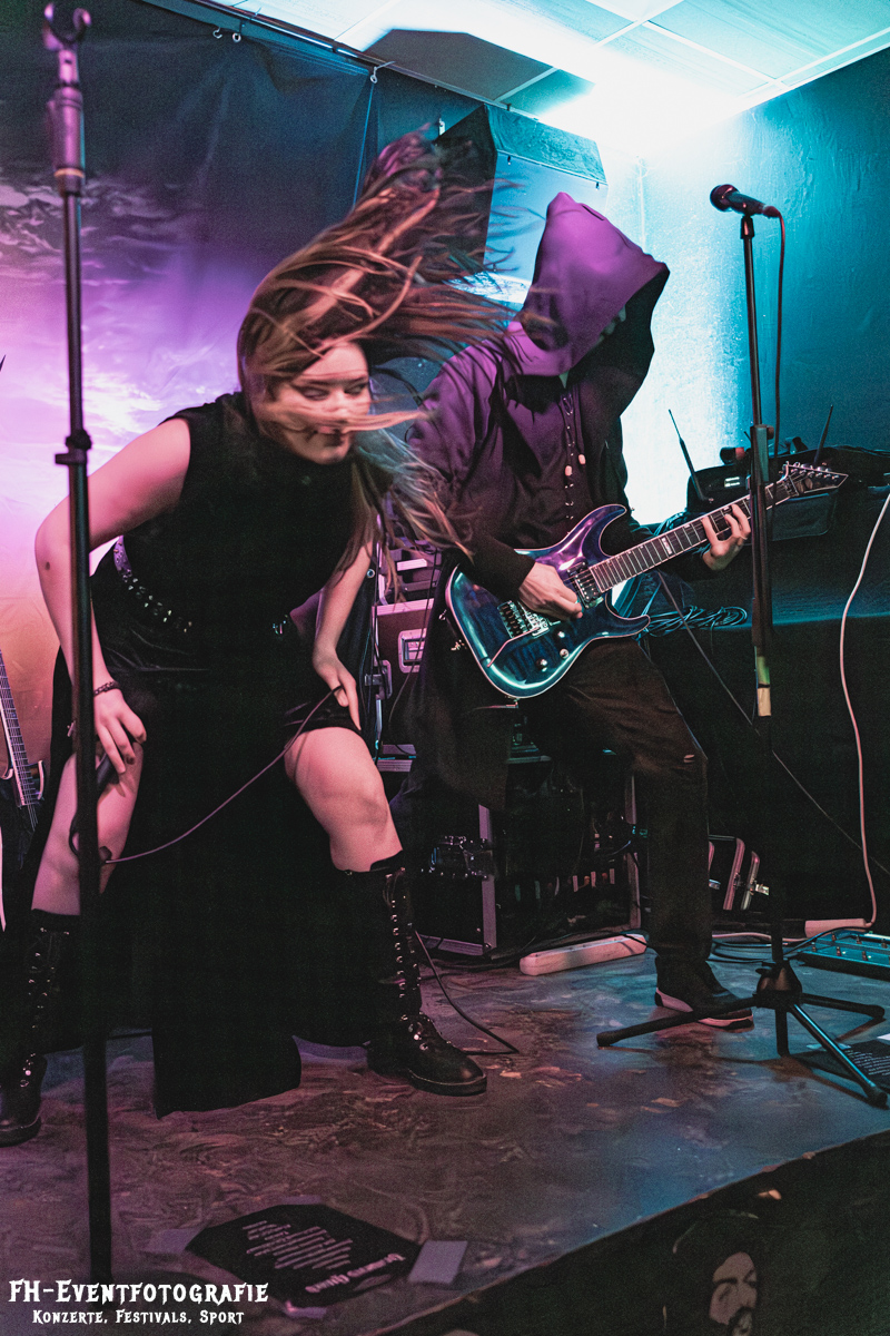 Die nächste Band ist, sowie alle Bands des Abends, mit dem Prädikat, unbedingt anschauen und anhören zu versehen. Auf die Bühne kamen »Dark Lightning«. Nach Melodic Metal kam nun Synphonic Metal. Nach ein klein wenig Ruhe an der Live-Front sind diese Musiker wieder zurück. Der »neue« Gitarrist ist nun Familienmitglied und, wie ich vor einiger Zeit schon schrieb, eine Verstärkung, die sich gewaschen hat. Neben »Metatron« an den Tasten haben alle Musiker in der Band eine Dynamik auf der Bühne, die sich wunderbar ergänzt. Allesamt spannen einen instrumentalen Teppich auf, den die beiden Stimmen der Band wunderbar tragen. Lea als die Hauptstimme und Frank, der neben dem Bass auch einige der Growls für die Ohren liefert.