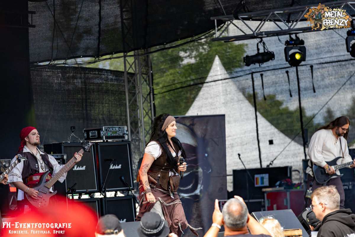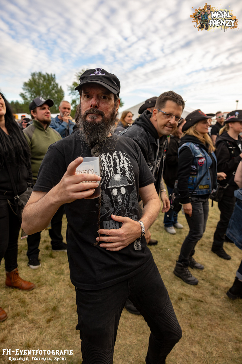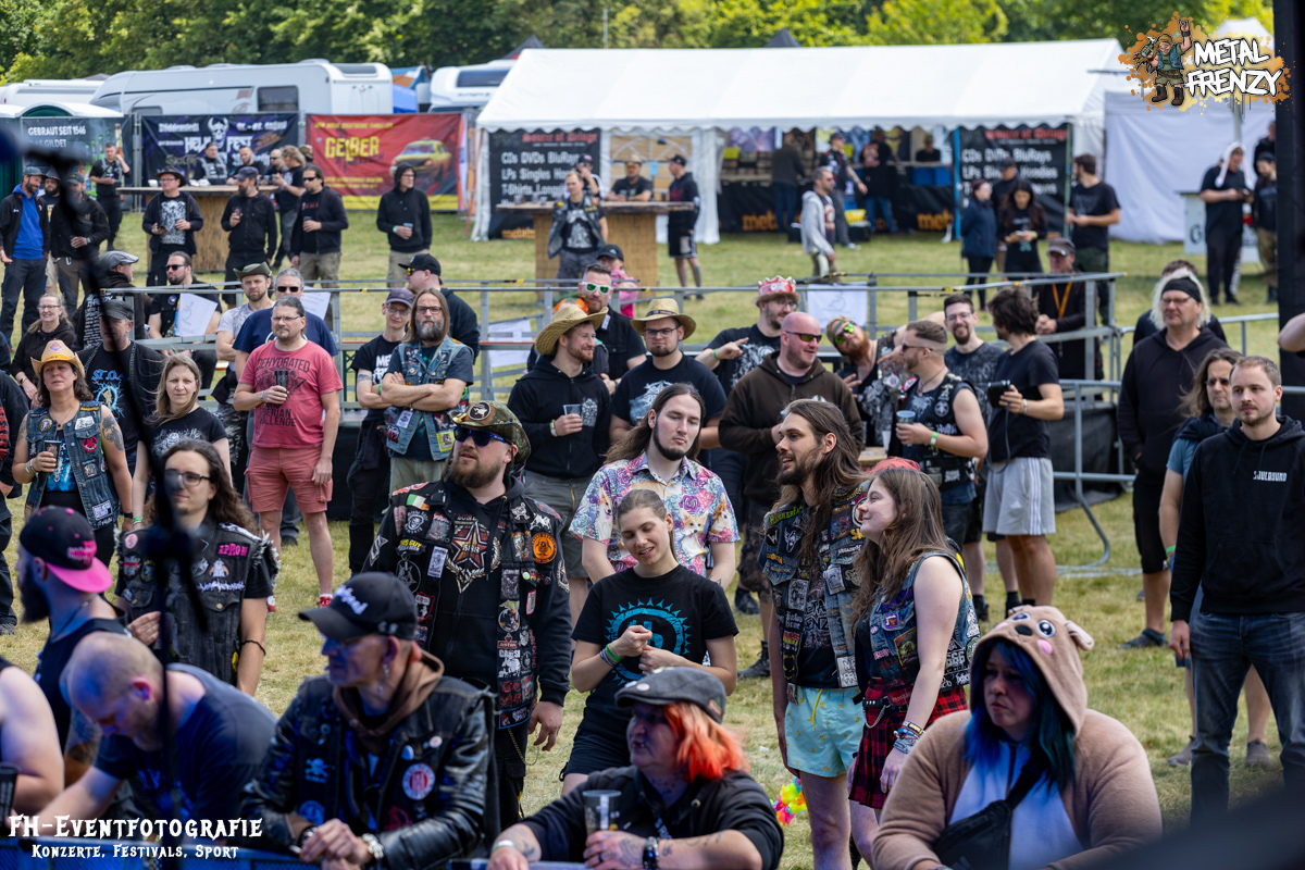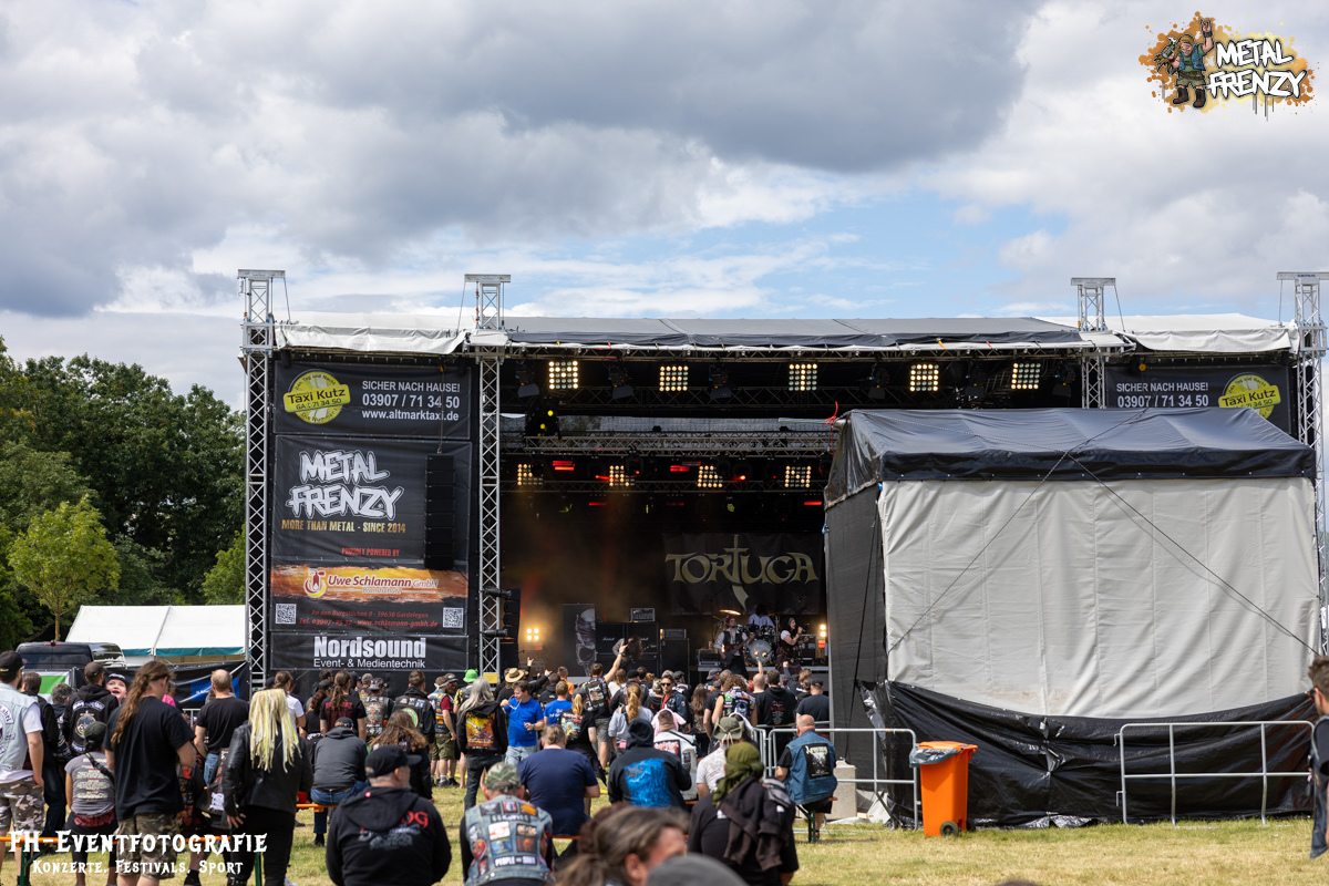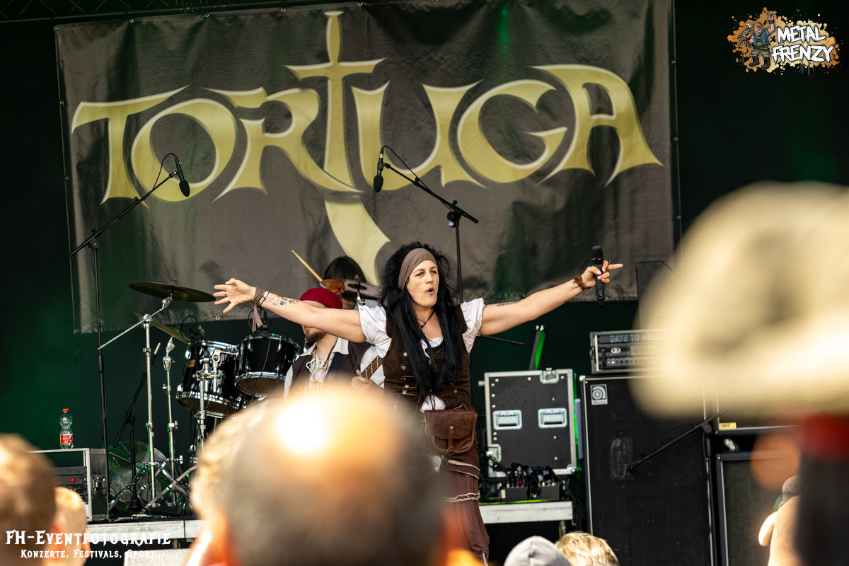 Nach diesem geilen Auftakt ging es musikalisch auf die schwere hohe See. Tortuga mit ihrem Heavy Pirate Sound fegten über die neue Bühne. Habe ich ja noch gar nicht erwähnt, die Bühne des Metal Frenzy war zum Jubiläum gebührend erweitert worden. 20 × 12 Meter, die für die Bands die Welt bedeuteten. Die „alte“ Bühne war schon für ein kleineres Festival ne ordentliche Größe. Aber diese nun, war echt für größeres bestimmt. Bei so einer Bühne kann nun alles, was Rang und Namen hat, kommen und wird genug Platz finden. Bin gespannt, was die kommenden Jahre so bringen werden. Nachdem ich mir bei den erstaunlich krassen Klängen der Piraten das Gelände anschaute und so auch die erste Gerstenkaltschale genoss, verbrachte ich viel Zeit damit, weiter Freunde zu begrüßen. Ist halt alles eine liebgewonnene große Familie.