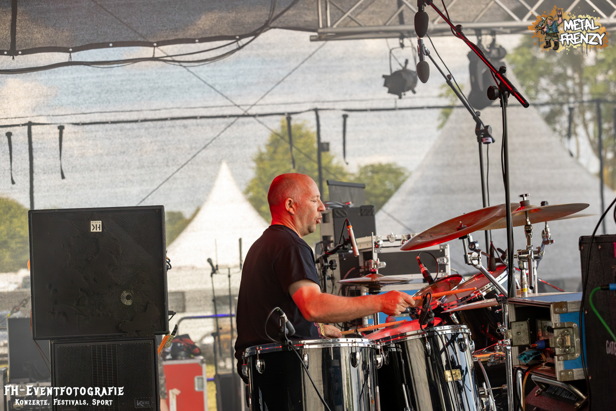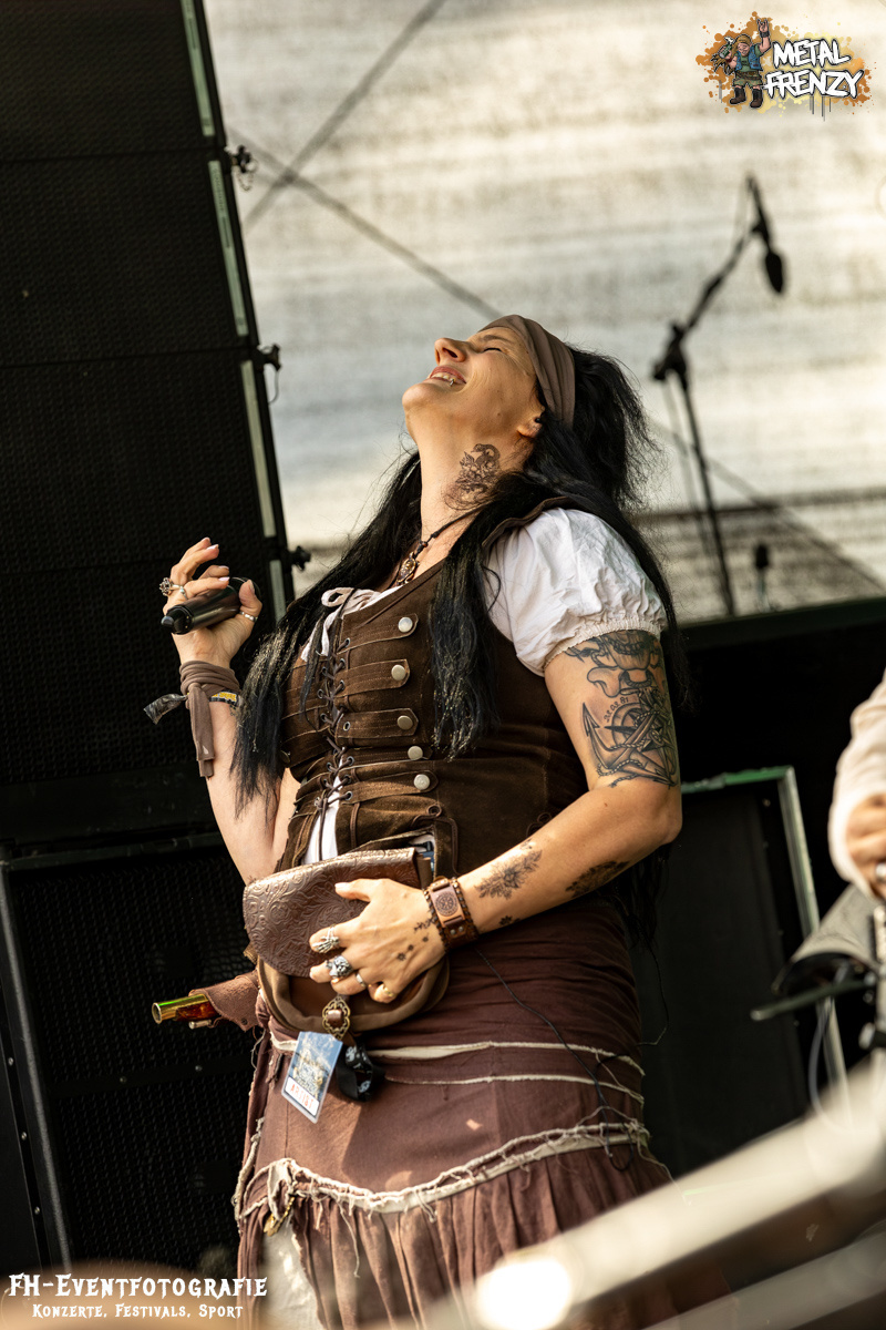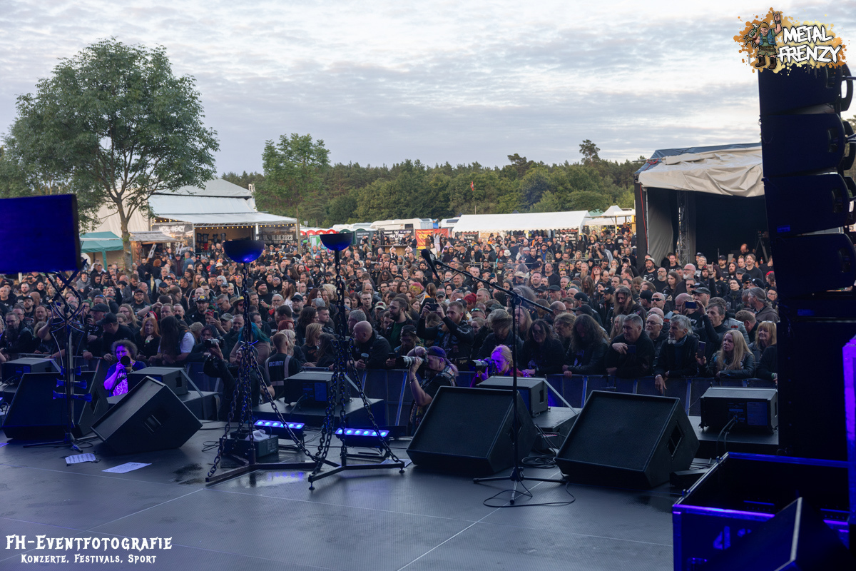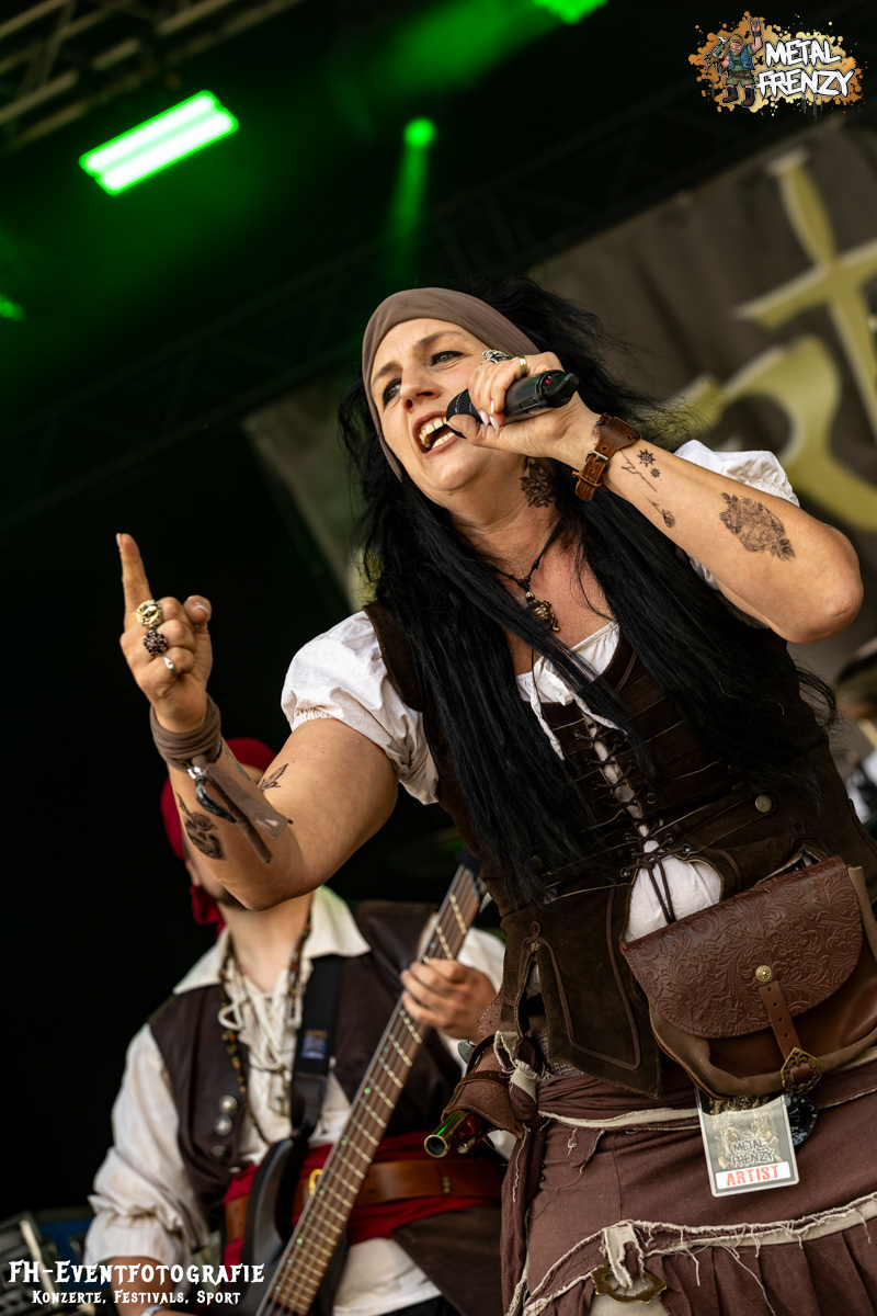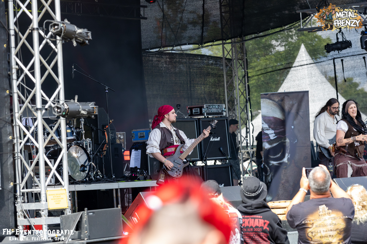 Nach diesem geilen Auftakt ging es musikalisch auf die schwere hohe See. Tortuga mit ihrem Heavy Pirate Sound fegten über die neue Bühne. Habe ich ja noch gar nicht erwähnt, die Bühne des Metal Frenzy war zum Jubiläum gebührend erweitert worden. 20 × 12 Meter, die für die Bands die Welt bedeuteten. Die „alte“ Bühne war schon für ein kleineres Festival ne ordentliche Größe. Aber diese nun, war echt für größeres bestimmt. Bei so einer Bühne kann nun alles, was Rang und Namen hat, kommen und wird genug Platz finden. Bin gespannt, was die kommenden Jahre so bringen werden. Nachdem ich mir bei den erstaunlich krassen Klängen der Piraten das Gelände anschaute und so auch die erste Gerstenkaltschale genoss, verbrachte ich viel Zeit damit, weiter Freunde zu begrüßen. Ist halt alles eine liebgewonnene große Familie.