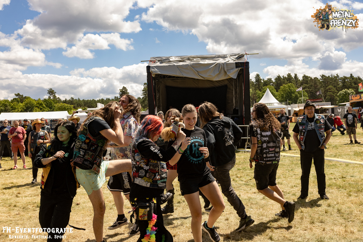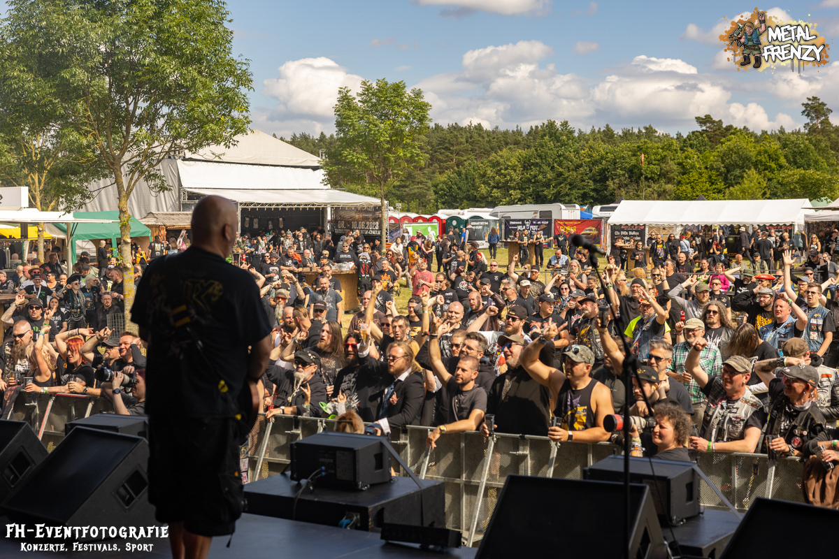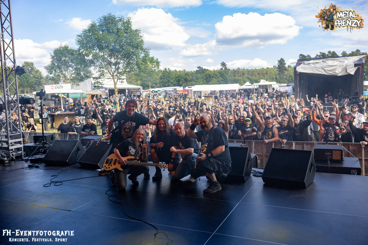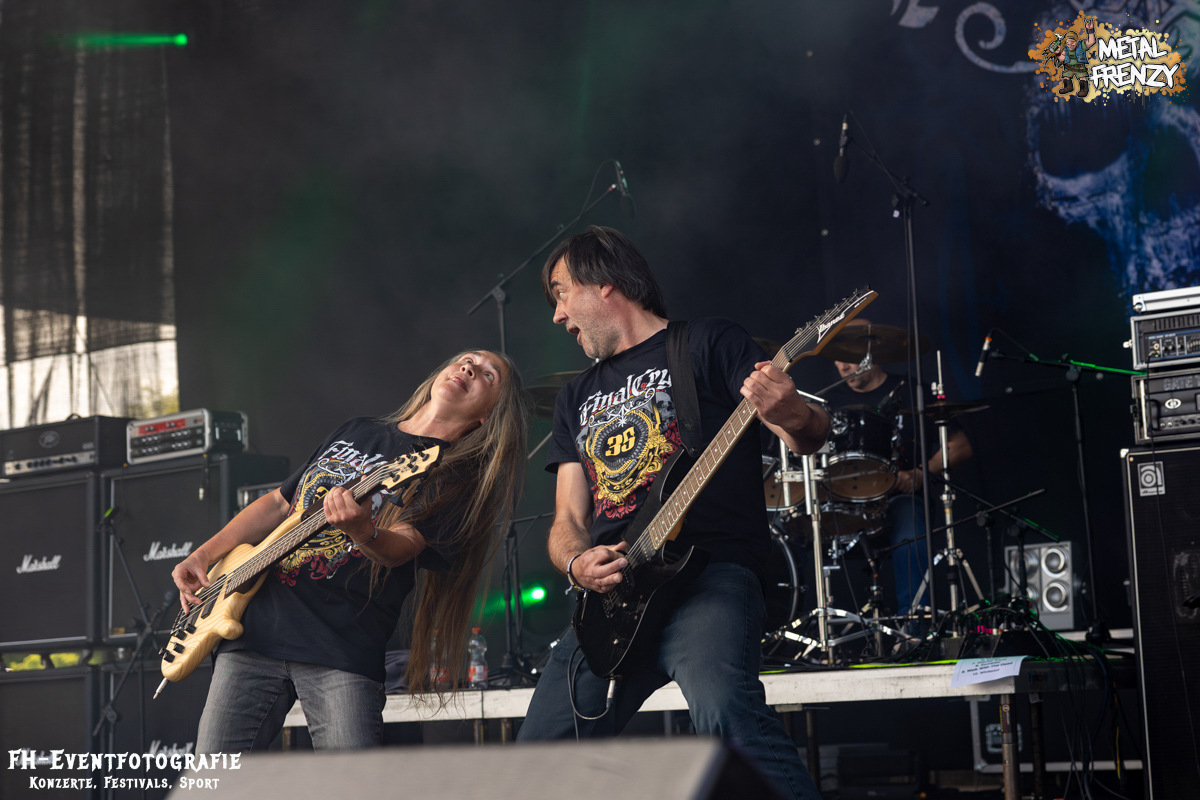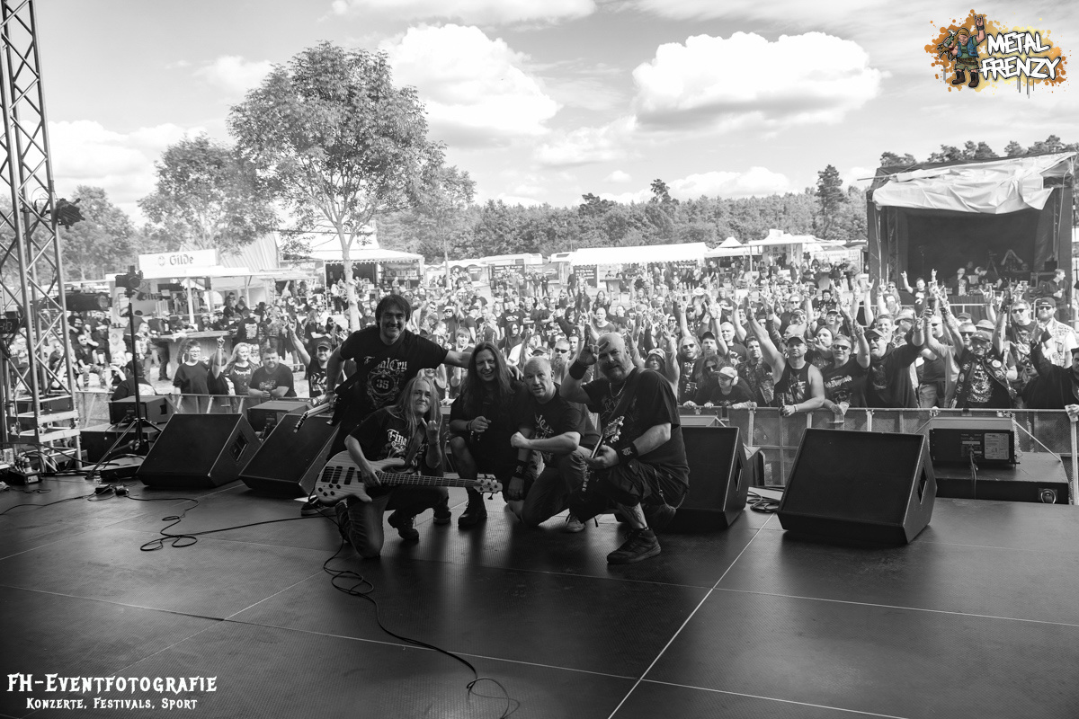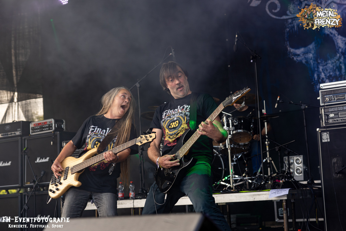 Bis zu diesem Zeitpunkt war ich schon mal begeistert, was die Bandauswahl für dieses Jubiläum anging. Aber ich kannte da noch ein paar Perlen nicht und so oder so waren ja auch Bands da, die ich eh feier. Nach diesem unerwarteten Nachmittagswachmacher kamen Final Cry auf die Bühne. Final Cry hatte ich das Jahr zuvor bereits auf dem Helmfest genießen dürfen und nun feierten sie ihr 35-jähriges Bestehen unter anderem auf dem Metal Frenzy Festival. Von solchen Jubelarien sollte es noch einige geben und zu all diesen Bands kamen die Metalmöhren auf die Bühne. Jedes Mal mit einer Torte bewaffnet.