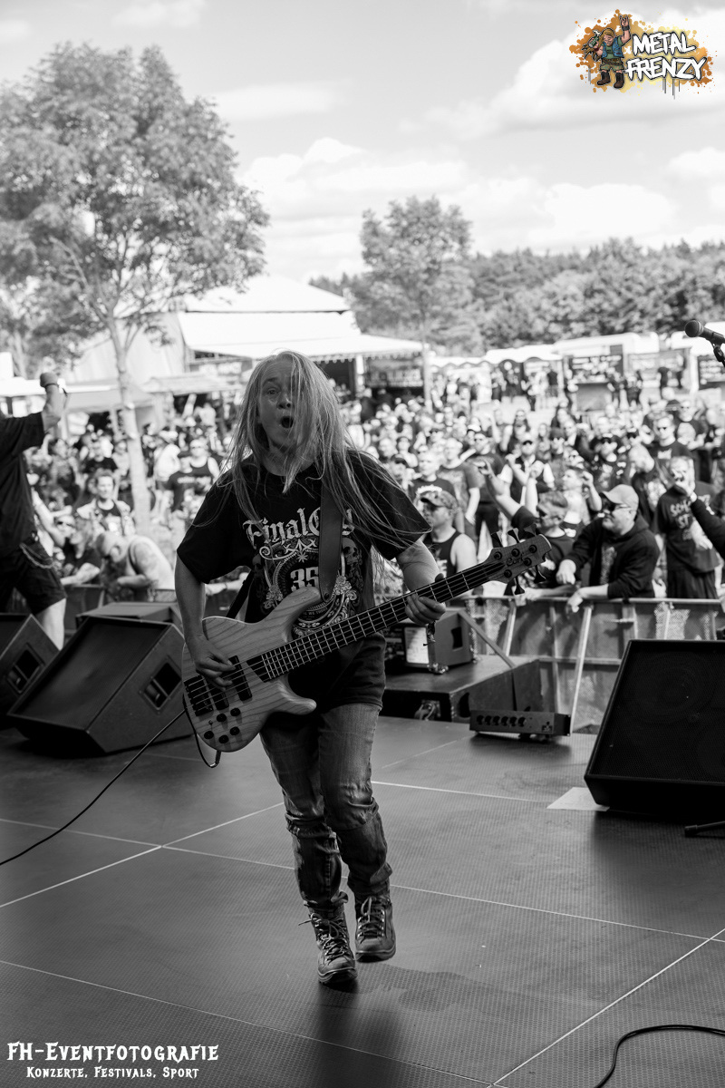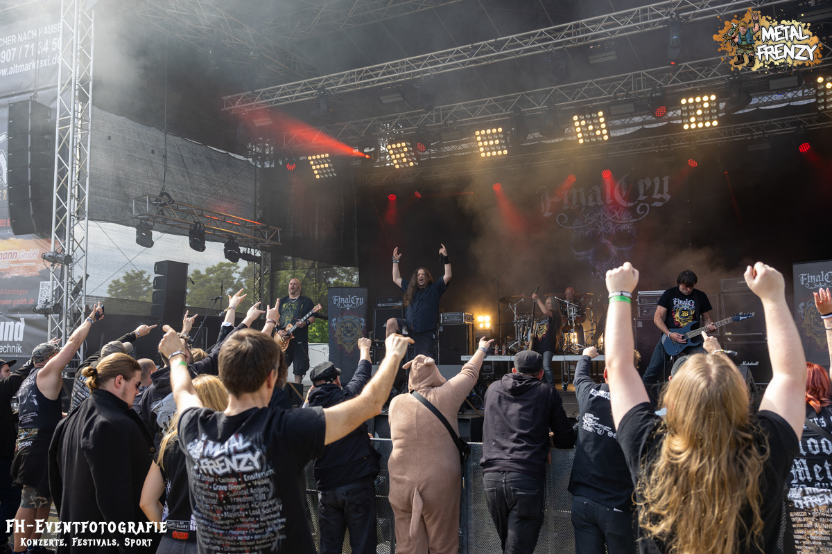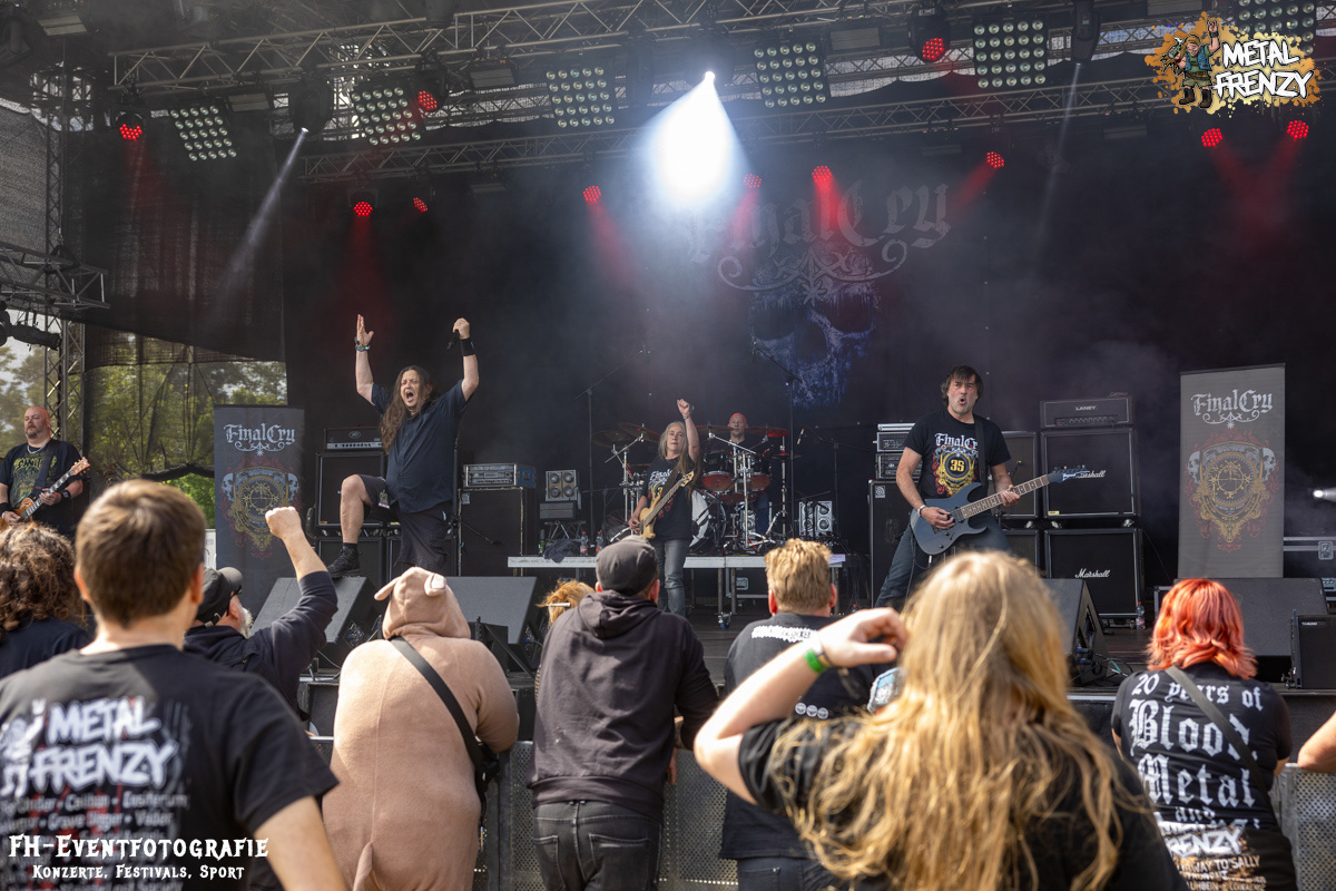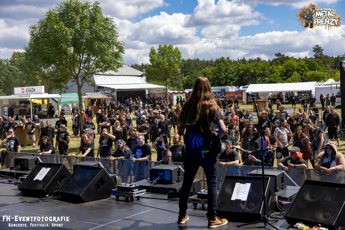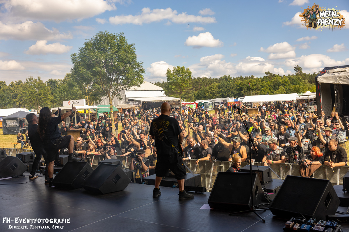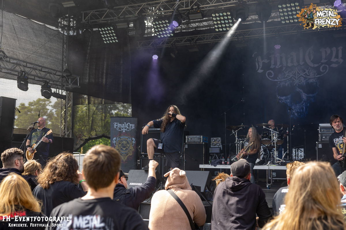 Bis zu diesem Zeitpunkt war ich schon mal begeistert, was die Bandauswahl für dieses Jubiläum anging. Aber ich kannte da noch ein paar Perlen nicht und so oder so waren ja auch Bands da, die ich eh feier. Nach diesem unerwarteten Nachmittagswachmacher kamen Final Cry auf die Bühne. Final Cry hatte ich das Jahr zuvor bereits auf dem Helmfest genießen dürfen und nun feierten sie ihr 35-jähriges Bestehen unter anderem auf dem Metal Frenzy Festival. Von solchen Jubelarien sollte es noch einige geben und zu all diesen Bands kamen die Metalmöhren auf die Bühne. Jedes Mal mit einer Torte bewaffnet.