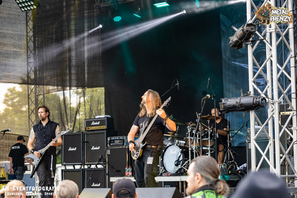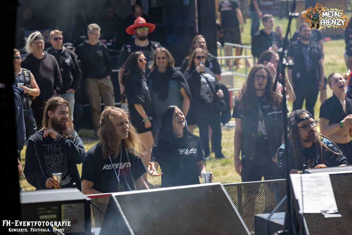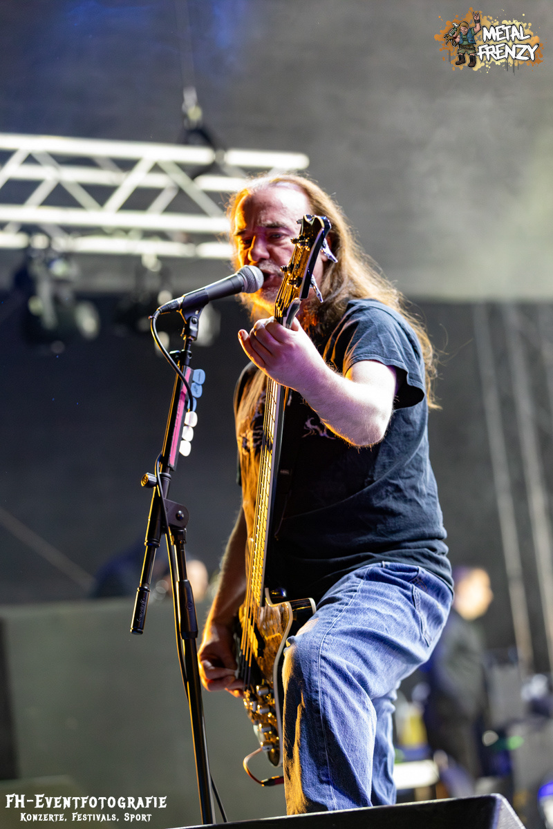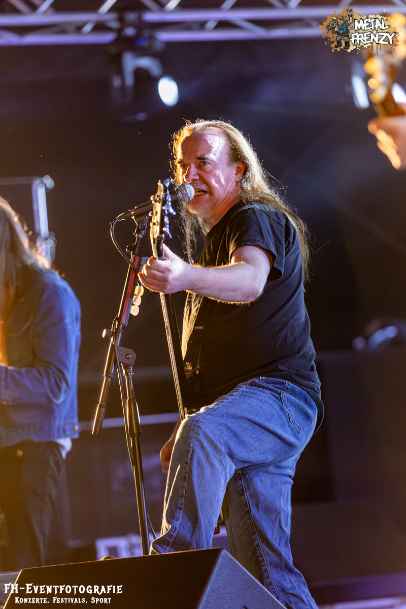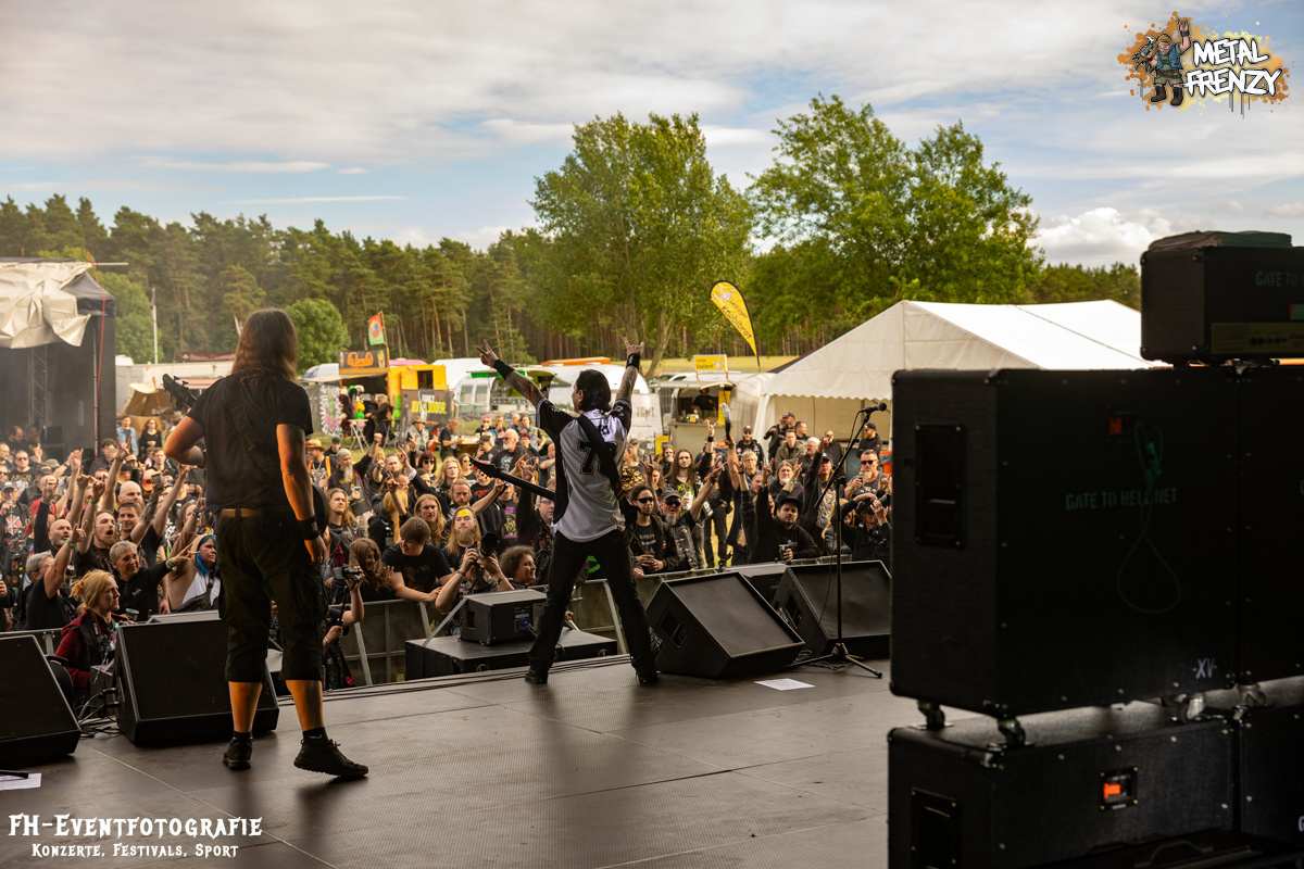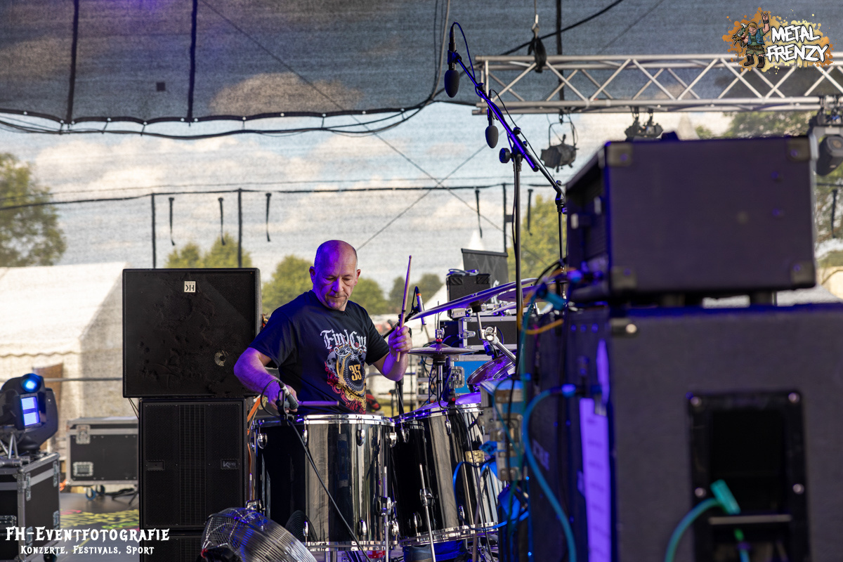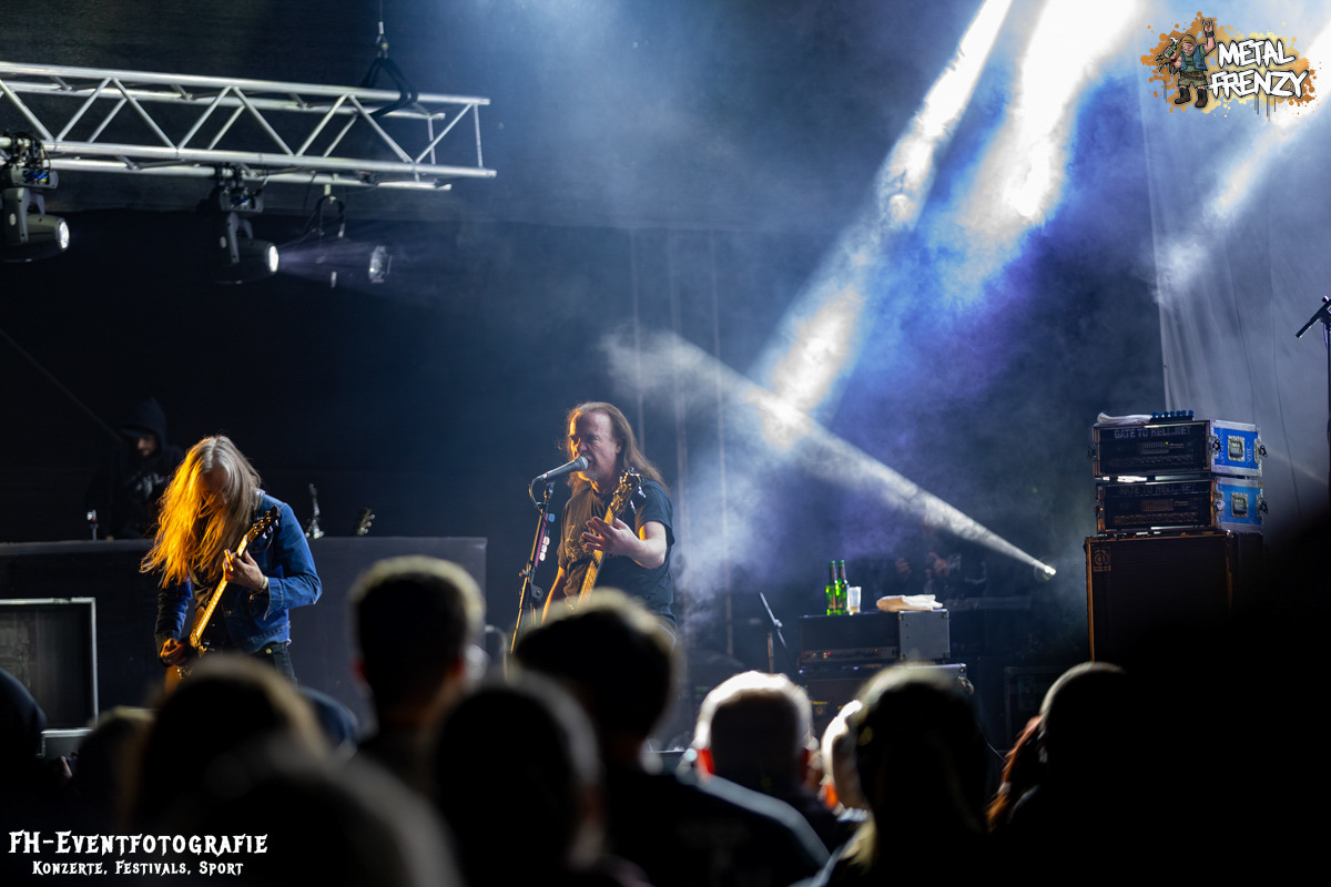Bis zu diesem Zeitpunkt war ich schon mal begeistert, was die Bandauswahl für dieses Jubiläum anging. Aber ich kannte da noch ein paar Perlen nicht und so oder so waren ja auch Bands da, die ich eh feier. Nach diesem unerwarteten Nachmittagswachmacher kamen Final Cry auf die Bühne. Final Cry hatte ich das Jahr zuvor bereits auf dem Helmfest genießen dürfen und nun feierten sie ihr 35-jähriges Bestehen unter anderem auf dem Metal Frenzy Festival. Von solchen Jubelarien sollte es noch einige geben und zu all diesen Bands kamen die Metalmöhren auf die Bühne. Jedes Mal mit einer Torte bewaffnet.