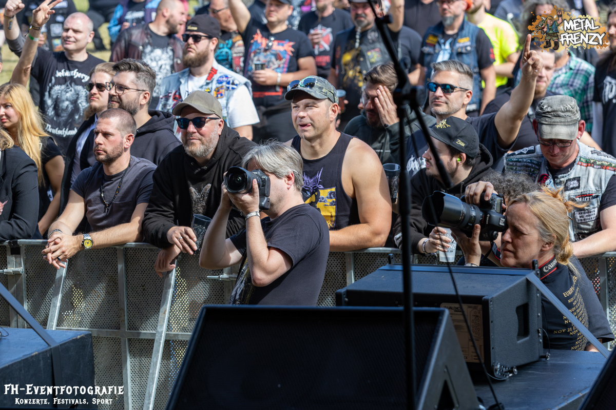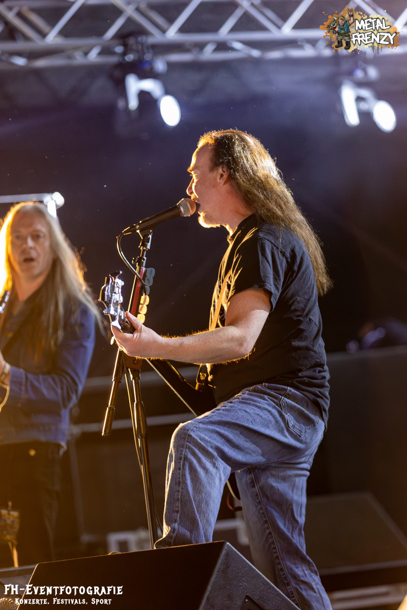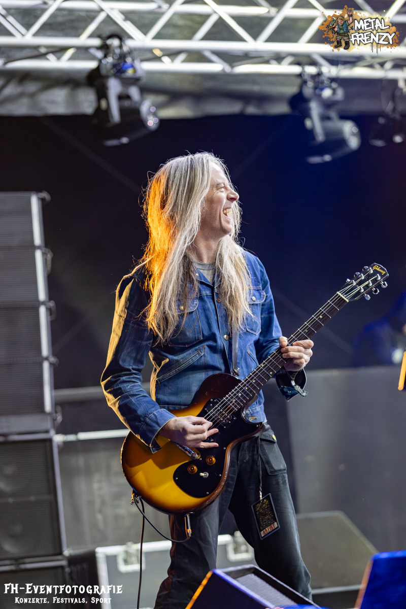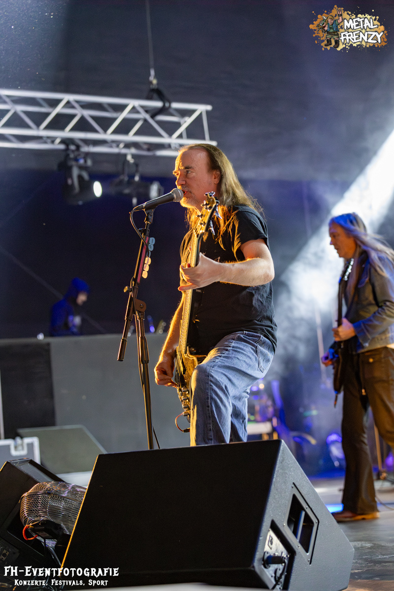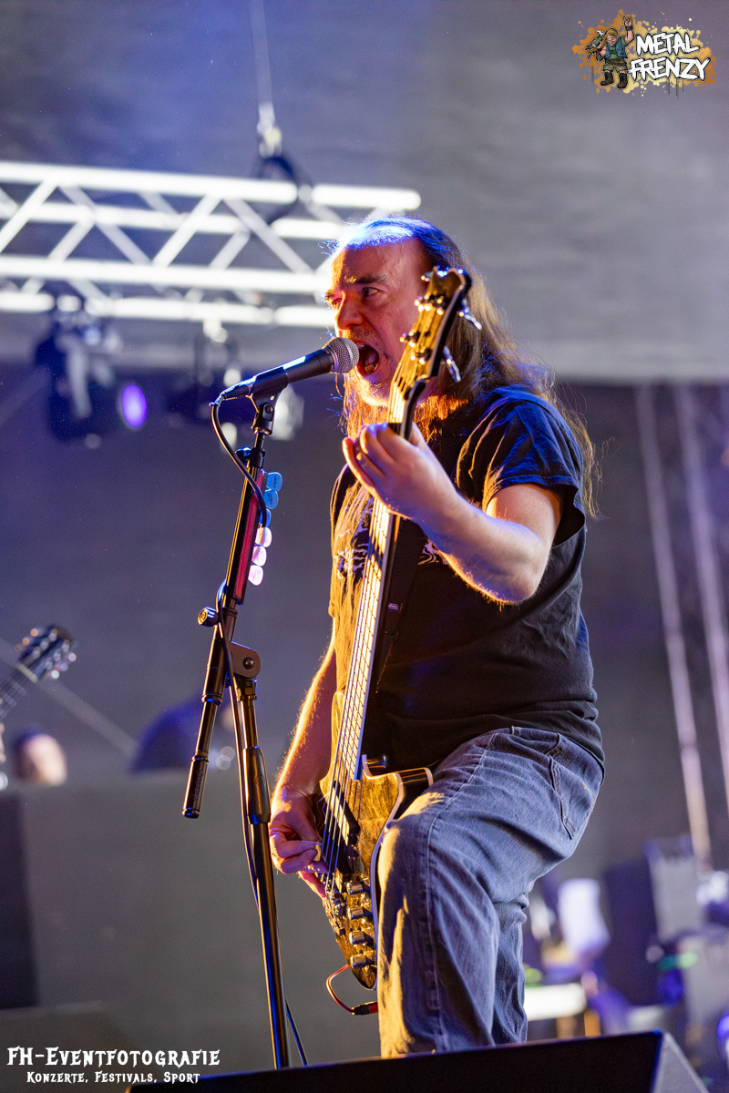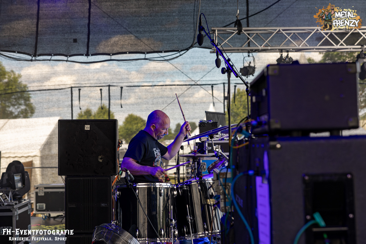 Bis zu diesem Zeitpunkt war ich schon mal begeistert, was die Bandauswahl für dieses Jubiläum anging. Aber ich kannte da noch ein paar Perlen nicht und so oder so waren ja auch Bands da, die ich eh feier. Nach diesem unerwarteten Nachmittagswachmacher kamen Final Cry auf die Bühne. Final Cry hatte ich das Jahr zuvor bereits auf dem Helmfest genießen dürfen und nun feierten sie ihr 35-jähriges Bestehen unter anderem auf dem Metal Frenzy Festival. Von solchen Jubelarien sollte es noch einige geben und zu all diesen Bands kamen die Metalmöhren auf die Bühne. Jedes Mal mit einer Torte bewaffnet.