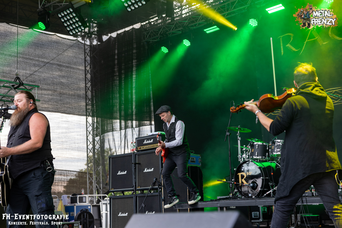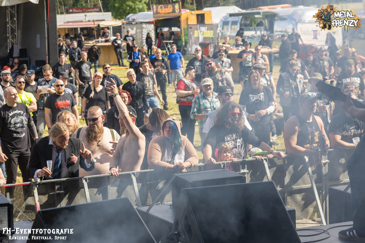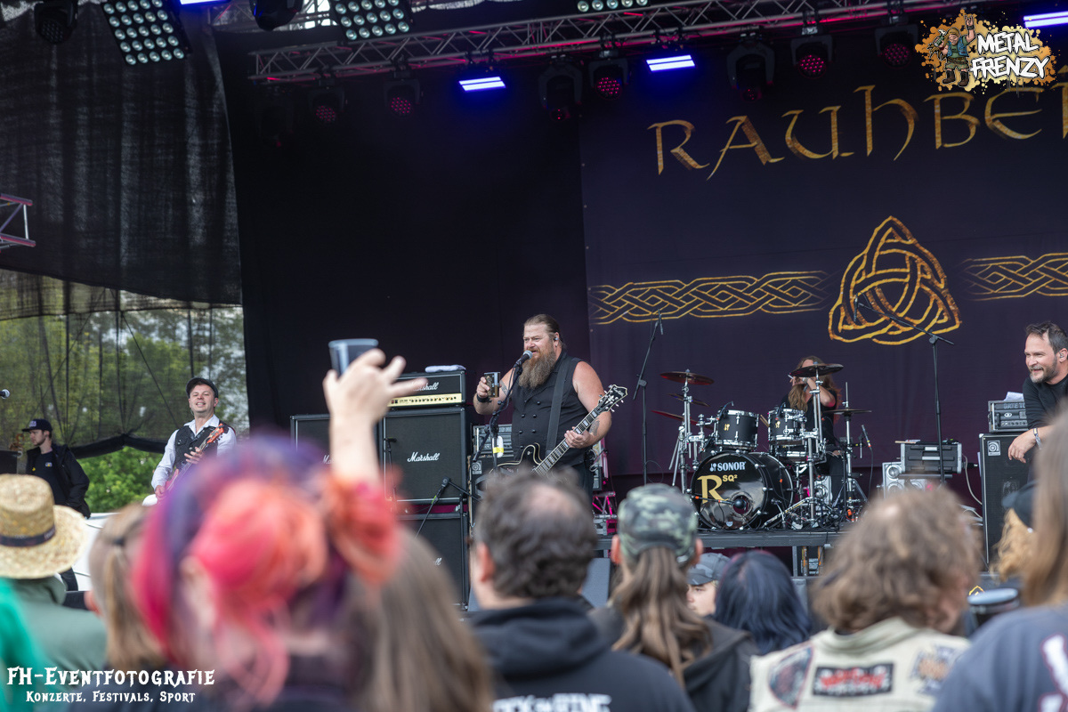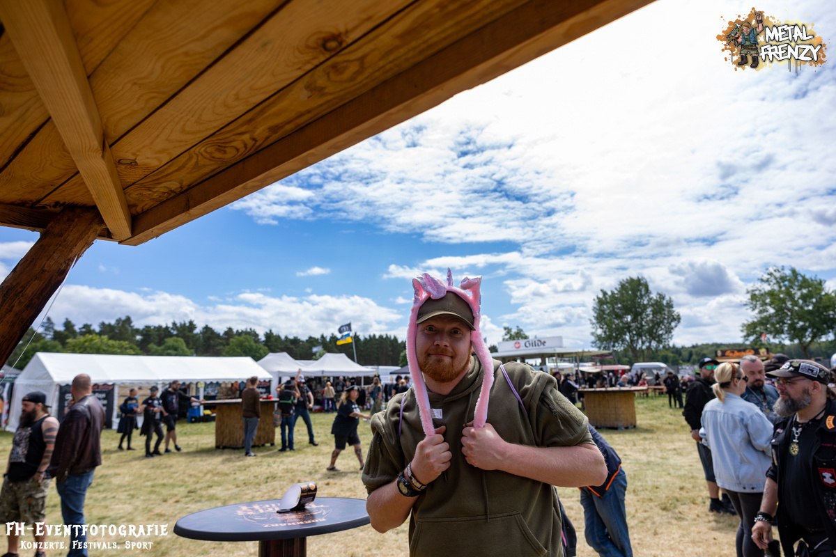 Danach wurde es dann etwas gemütlicher. Ein wunderbar unauffälliger Brummbär, der auch als Namensgeber der kommenden Band fungierte, stand mit seinen Mannen auf der Bühne. Brummbär sei hier seine echt beeindruckende Erscheinung mit Muskeln und Vollbart und auch seiner wunderbar sonoren Stimme. Ihr wisst nun sicher, wen ich meine. Es gab sich Rauhbein die Ehre. Ich habe selten eine so professionelle Band erlebt. Vielleicht sind sie auch gebrannte Kinder. Aber sie hatten wirklich alles mit und sie konnten alles bedienen, als hätten sie nie etwas anderes getan. Gemeint sei damit, dass sie Ihren eigenen Merchstand mit allem zip und zap dabeihatten. Ich hab beim Hinschaffen auf das Infield den Mitarbeitern der Band geholfen und glatt ein Feuerzeug bekommen. Vielen Dank dafür. Das hat mir ungelogen, echt weiter geholfen und den Arsch gerettet. Dazu jede Menge Tontechnik. Der liebe Sharky, der den Monitorsound beim Metalfrenzy machte, hatte bei den Jungs deutlich weniger zu kurbeln, als er es sonst machen musste. Herr Rauhbein persönlich mischte. Habe ich so noch nie gesehen und fand ich mega beeindruckend. Entsprechend zackig ging der Soundcheck. Bis dahin war ich begeistert von ihnen, danach war ich ein Fan. Läuft!