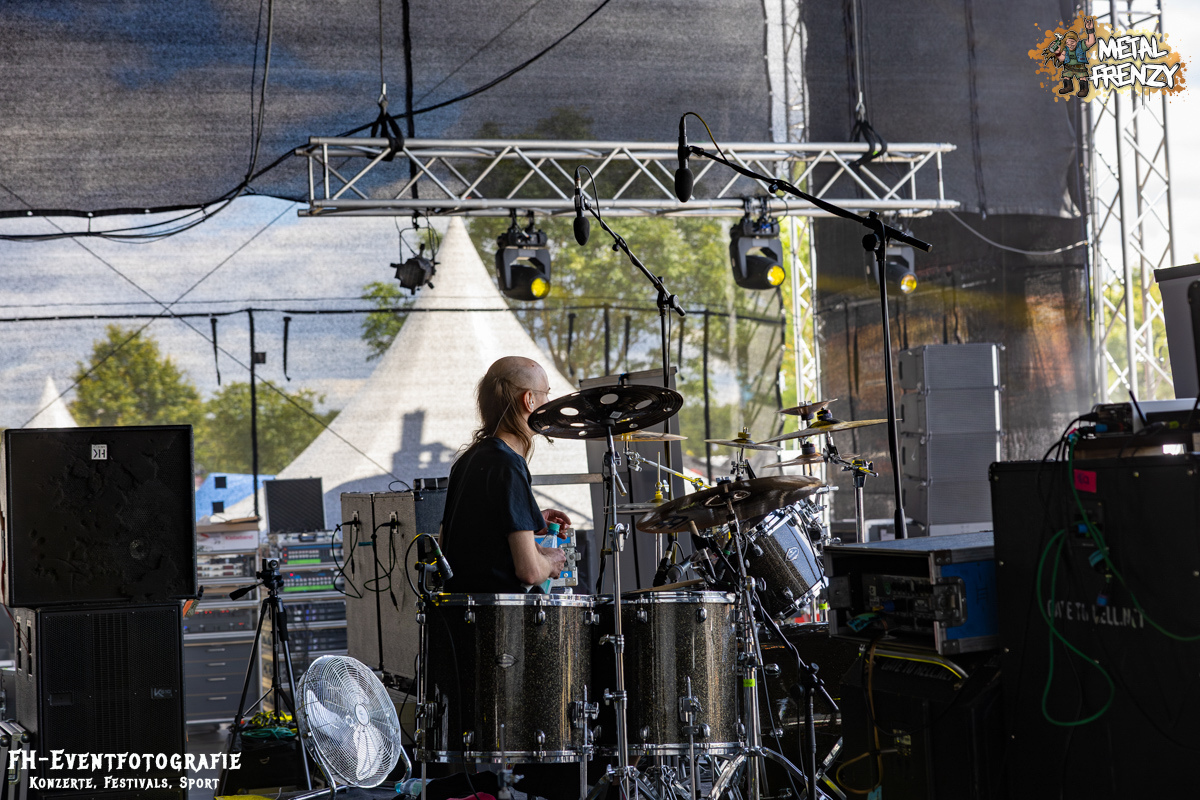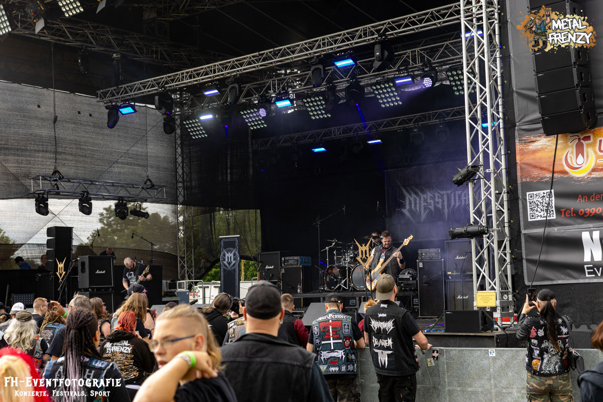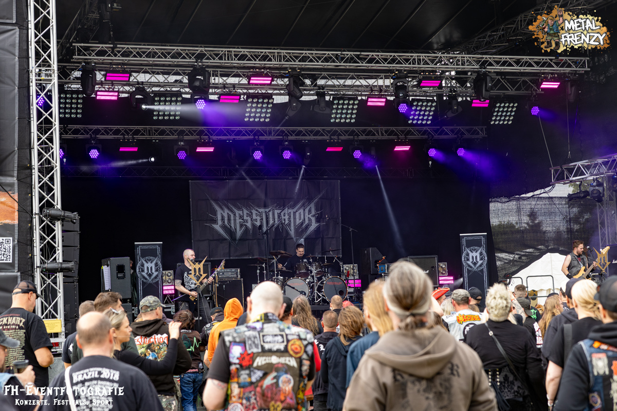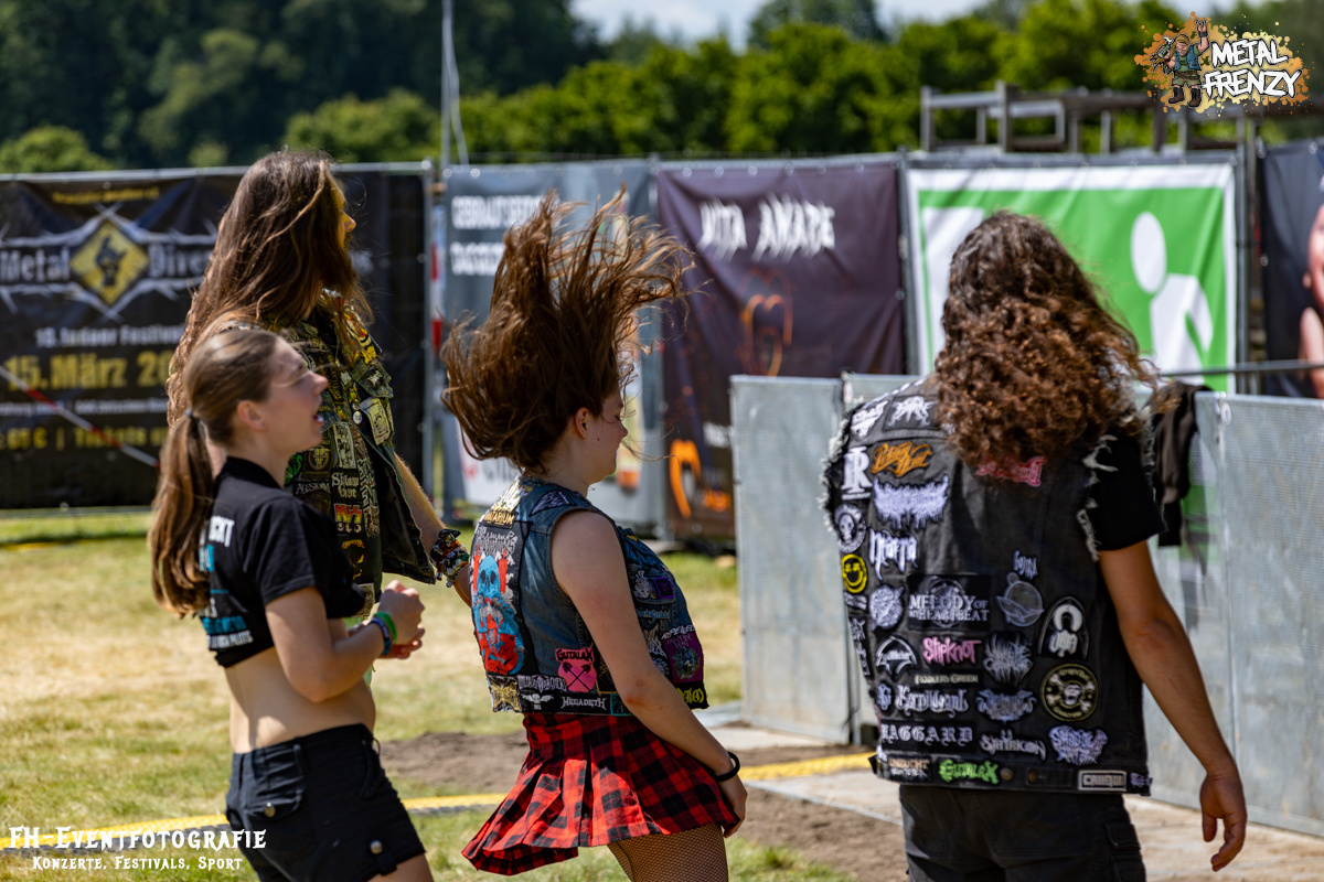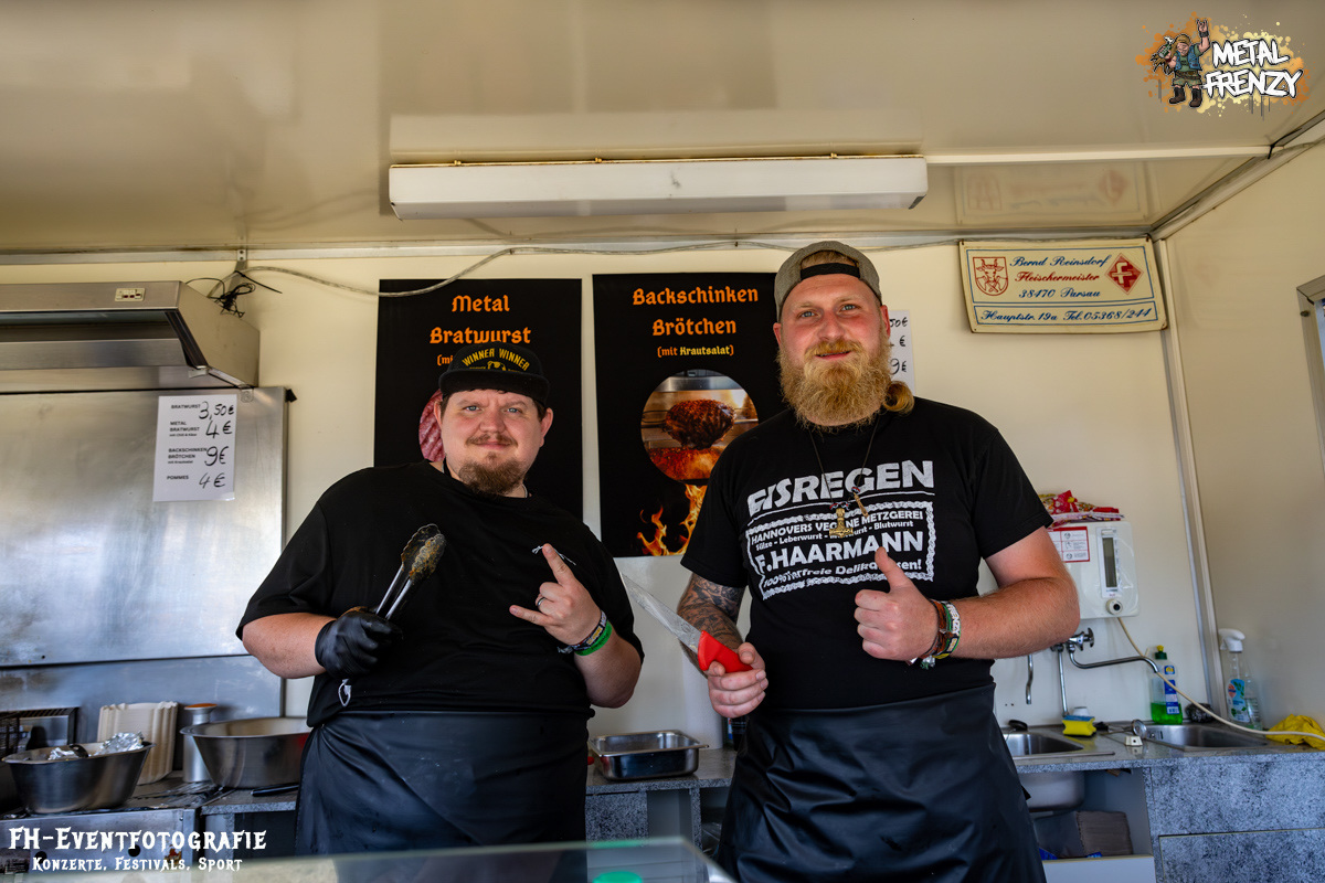 Das Begrüßen wurde später durch etwas für mich Neues unterbrochen. Von der Bühne her kam ein fast schon mazial schneller Sound. Die Hamburger Band Messticator hatte ihren Soundcheck begonnen. Krass, also erstmal wieder vor die Bühne. Ich finde es für meinen Teil immer sehr angenehm, auf dem Backdrop den Namen der Band noch lesen zu können. Die Hamburger haben da zwar schon in die grafische Trickkiste gegriffen, das zweite Bier kann daran ja nicht schuld sein, was ihr Design für den Schriftzug betraf. Wie gesagt, mag das Bier gewesen sein, aber was den Sound anging, war ich ja eh begeistert von Lars Allermann, der dieses Jahr wieder die Regler unter seinen Fittichen hatte. Und der Stil der Band, verdammt, der war sehr cool. Thrash mit Death. Kannte ich so nicht, machte aber einen Heidenspaß. Passend dazu gab es erstmal eine Portion Fritten, damit ich nur ganz kurz von der Bühne abgelenkt war