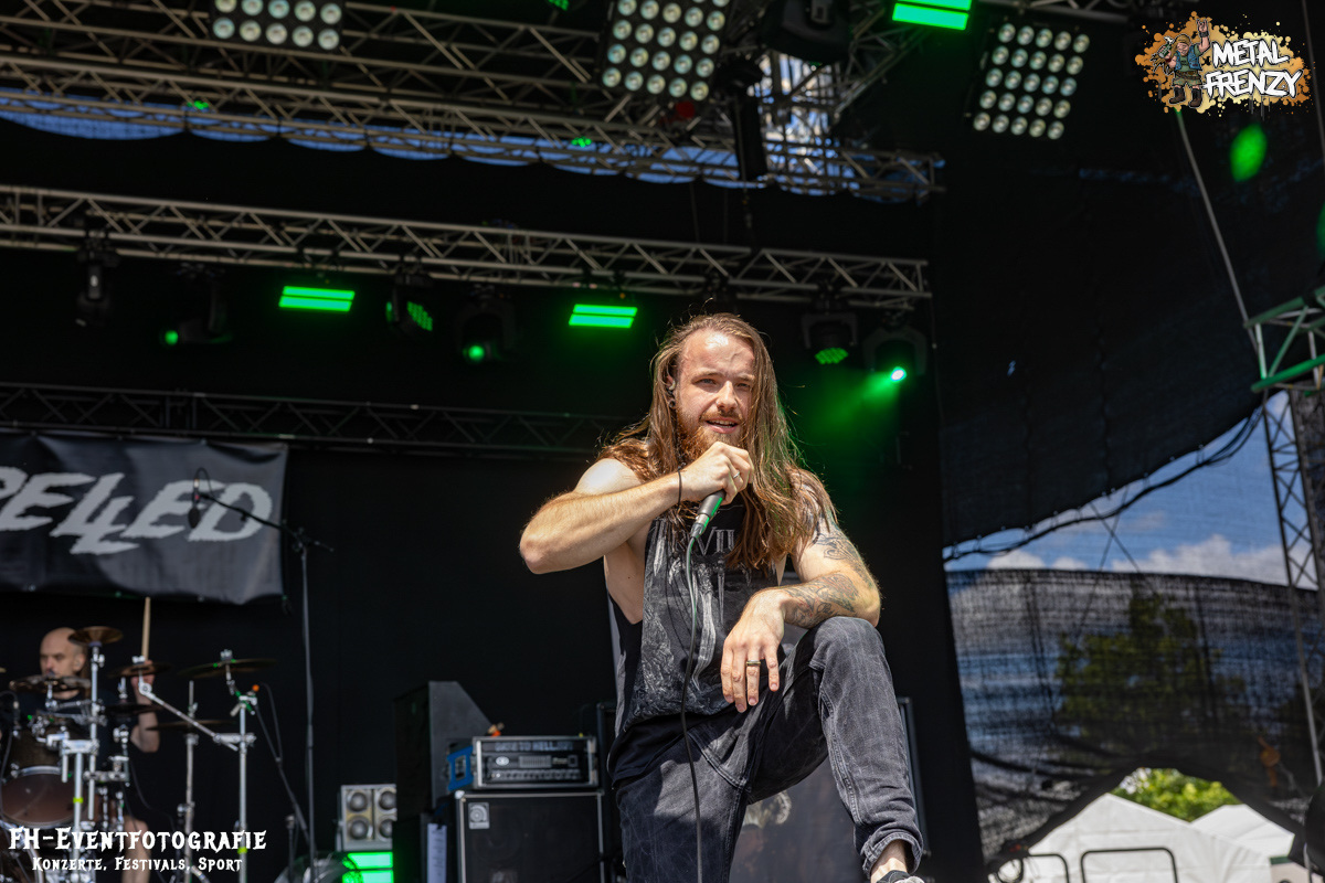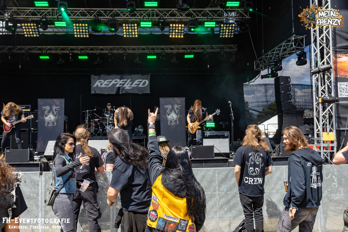 Dass ich dieses Mal so „zeitig“ da war, hatte einen guten Grund. Natürlich die Musik, genauer gesagt Repelled. Diese junge aufstrebende Alternative Metal Band kannte ich noch aus dem Nordsound Showroom und der dortigen Open Stage Night Reihe. Die waren damals so überzeugend und mit Herzblut bei der Sache, dass sie da glatt noch während des Gigs von einem der Macher des Metal Frenzy Festival für selbiges engagiert wurden. Und was kann ich sagen, die Jungs eröffneten den ersten offiziellen Festivaltag fulminant. Diese super angenehmen Typen haben optisch bestimmt die ein oder andere Ecke, an der man sich stoßen mag, aber sie sind so echt und leben ihre Musik, dass sie vom Start weg begeisterte Headbanger vor die Bühne zogen.