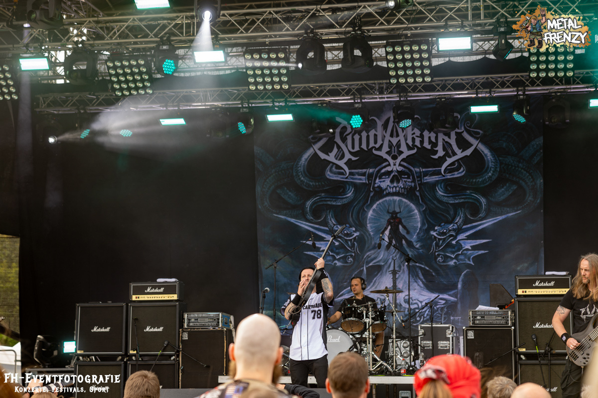 Aber nun ab zurück auf das Infield. Da kam eine Band, die auch mit einer Torte von der Bühne entlassen wurden. Suidakra aus der verrückt reichen Kleinstadt in NRW spielten einen Mega Gig zu ihrem 30. Bandjubiläum. Wer es etwas härter und dennoch klare Passagen suchte, wurde bei den Herren absolut fündig. Nach so vielen Jahren auf der Bühne hat bei den Bandmitgliedern das Privatleben natürlich auch nicht gelitten. Wunderbares Beispiel war, dass der sechsjährige Sohnemann des Sängers und Gründungsmitglied der Band auch da war und Papa begeistert feierte. Mama passte natürlich auf. Die Musik von den Monheimern war eine sehr abgefahrene Mischung aus Celtic, Deathmetal und etwas Folk. Das ist doch ne abgefahrene Mischung. Wenn da dem ein oder anderen dran gelegen ist, sich das mal anzuhören, auf einem der 15 Longplayer, die die Band bisher veröffentlicht hat, werdet ihr sicher fündig.
