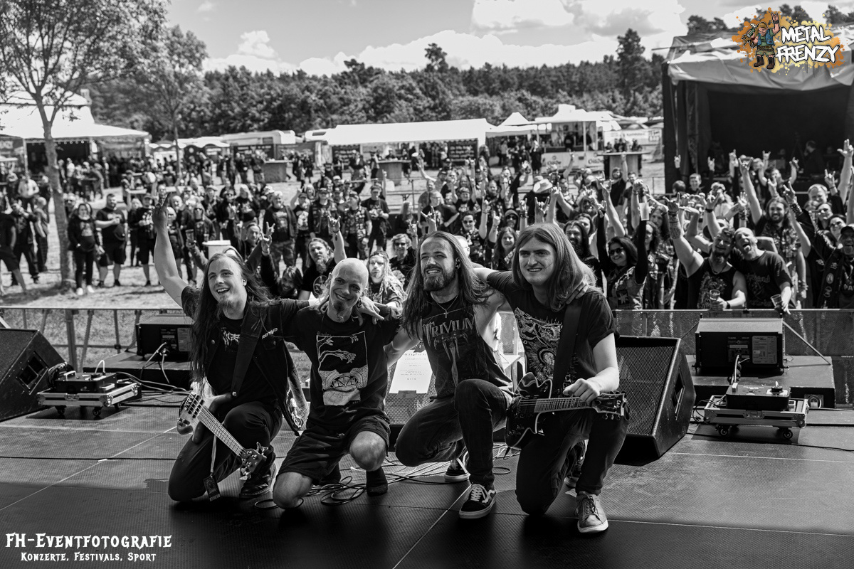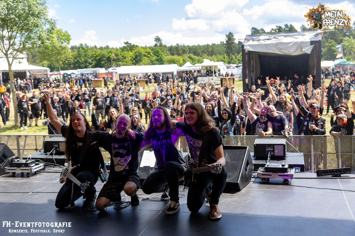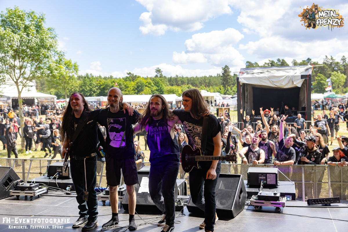 Bis zu diesem Zeitpunkt war ich schon mal begeistert, was die Bandauswahl für dieses Jubiläum anging. Aber ich kannte da noch ein paar Perlen nicht und so oder so waren ja auch Bands da, die ich eh feier. Nach diesem unerwarteten Nachmittagswachmacher kamen Final Cry auf die Bühne. Final Cry hatte ich das Jahr zuvor bereits auf dem Helmfest genießen dürfen und nun feierten sie ihr 35-jähriges Bestehen unter anderem auf dem Metal Frenzy Festival. Von solchen Jubelarien sollte es noch einige geben und zu all diesen Bands kamen die Metalmöhren auf die Bühne. Jedes Mal mit einer Torte bewaffnet.