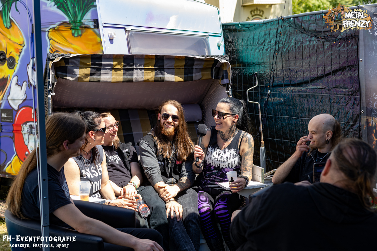 Bei Final Cry betraten die Damen die Bühne allerdings nur mit Mikrofonen bewaffnet und das vor deren Auftritt. Der Grund war einfach. Da die Möhren das Fanvolk immer auf dem Laufenden halten wollten, machten sie ne Menge Interviews. Final Cry waren eine der ersten Bands, die zum Interview erschienen und dort bekamen sie auch prompt die erste Torte des Festivals. Solch eine Tradition muss halt gepflegt werden. Also ließen sich Britta Görtz und Suzen Berlin es sich nicht nehmen, all diesen Jubilaren mit einer Torte den Auftritt zu versüßen. Jetzt wisst Ihr schonmal, dass das häufiger der Fall war. Ich werde es immer mal wieder erwähnen und vor allen Dingen die dazugehörigen Zahlen. Es gab halt nicht nur Musik zu feiern. Und egal wie true oder erschöpft eine Band war, wenn die Möhren die Bühne betraten und eine Torte dabeihatten, gab es immer ein Lächeln und das kam immer von Herzen. Es gab eine Ausnahme, aber das erzähle ich später. Aber selbst die Ausnahme lächelte.