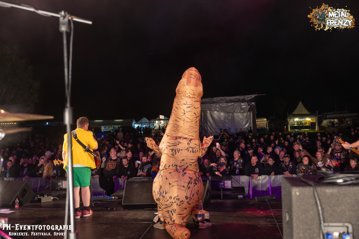 Geiler Scheiß. Anschließend, oder war es davor, alter mein Hirn arbeitet immer noch hart an der Grenze zum Notlauf, wurde Passi Bassman unverhofft mit einem vorübergehenden neuen Outfit eingekleidet. Dazu sei gesagt, eingekleidet wurde live auf der Bühne. Er bekam ein T-Rex-Kostüm, was er mit Assistenz anlegte. Zu der äußerst umtriebigen Dame, Rufname Friggy, komme ich später noch einmal. Passi durfte das Kostüm dann aber auch schnell wieder ausziehen. Wollte und will ja keiner, dass ein so lieber Mensch wie die Dinos damals einfach ausstirbt. Lebendig und mit Bass ist er mir da einfach lieber.