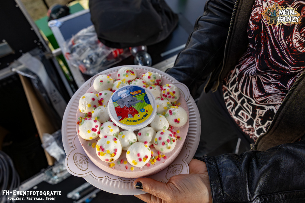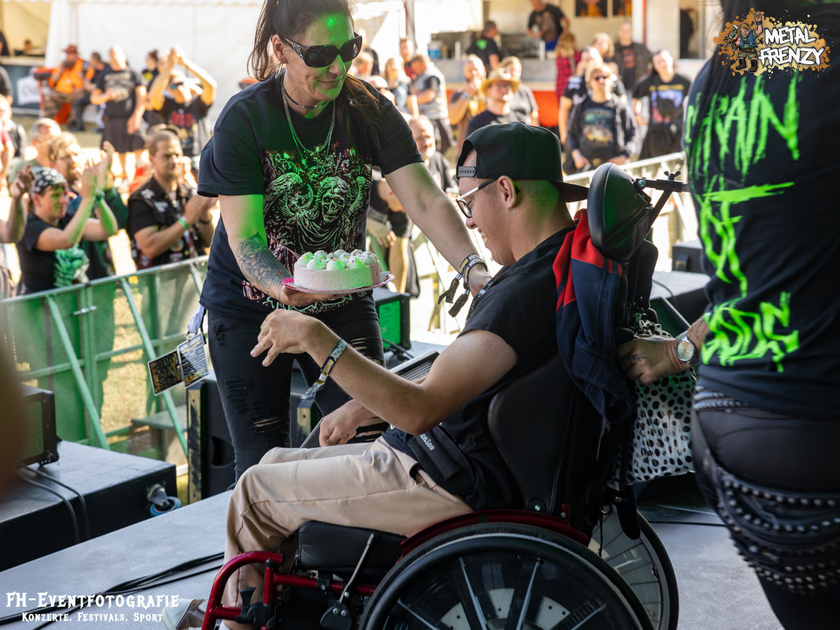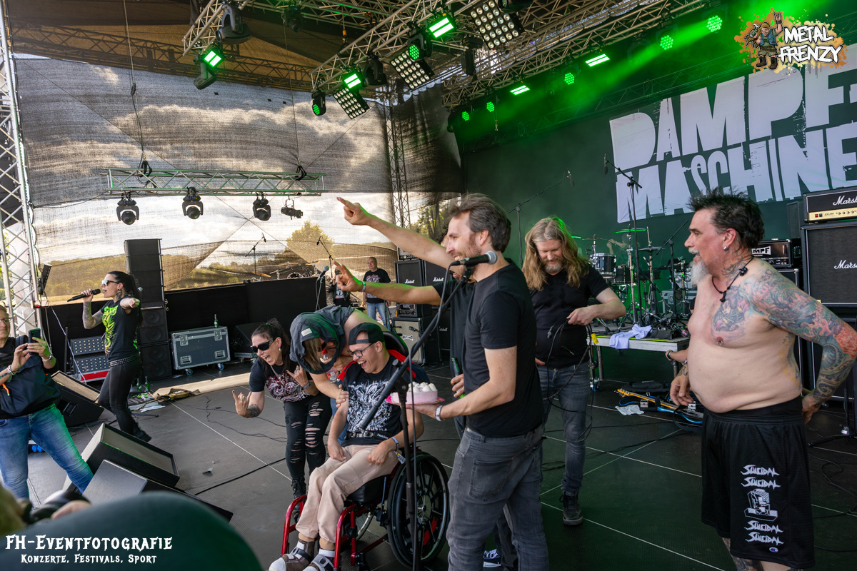 Nachdem die Macher des Festivals sich über die Jahre mit einigen anderen Veranstaltern kurzgeschlossen haben, ist da eine echte Festivalfamilie entstanden. Jeder schaut auf den anderen, gemeinsam und natürlich mit den Fans, wird jedes Jahr das ein oder andere verbessert. Eines der größten Felder, wo sich alle fünf Festivals immer wieder steigern, ist das Thema Inklusion. Eine Rollibühne und diverse Theken und Stände, die immer barrierefreier gestaltet werden, sind da die besten sichtbaren Zeichen. Ein weiterer Punkt, den ich gestern ganz vergessen hatte, war, dass auch die Bühne zur barrierefreien Zone wurde. DAMPFMASCHINE war ja auch eine der Bands, die als Jubilar eine Torte überreicht bekommen hatten. Da Festivals ja für die Fans sind, konnte eine Bitte natürlich nicht abgelehnt werden. Ein Riesen-Fan der Band wollte gerne die Torte übergeben. Also wurde Niklas in seinem Rollstuhl kurzerhand mit den Metal-Möhren auf die Bühne geholt. Ich bin mir sicher, dass er das so schnell nicht mehr vergessen wird.