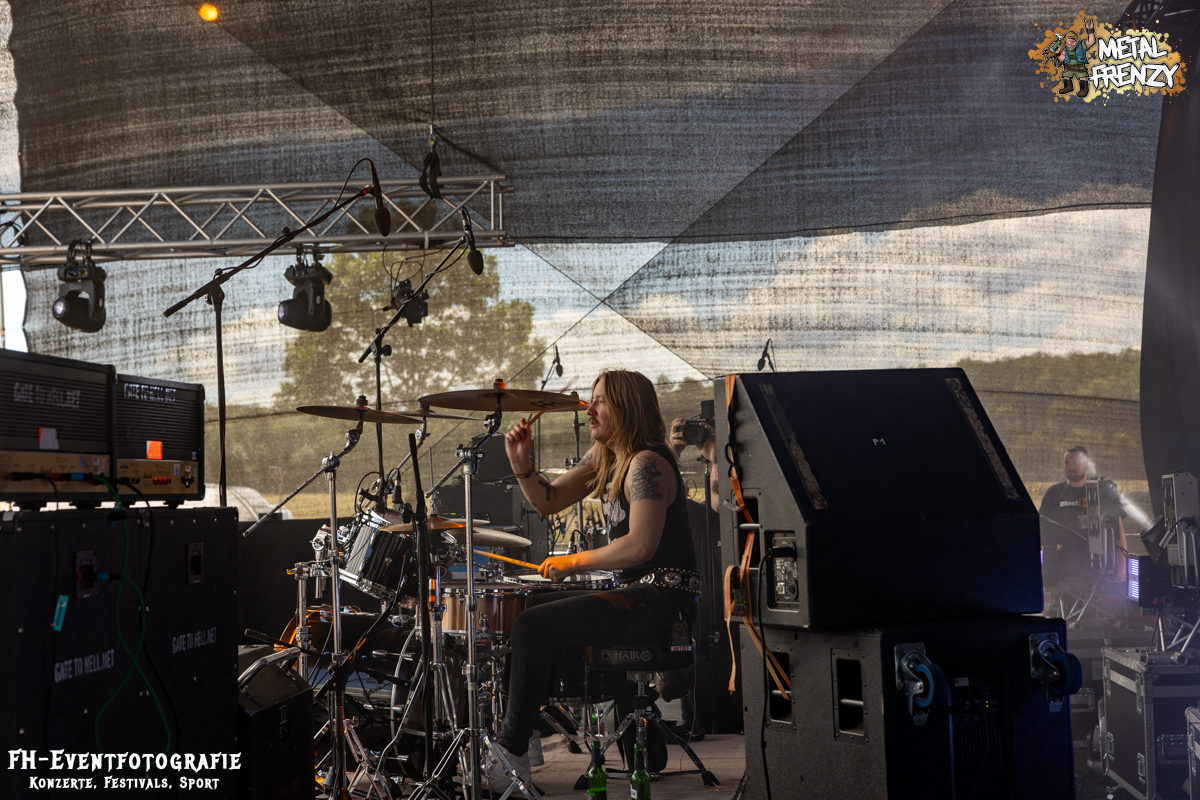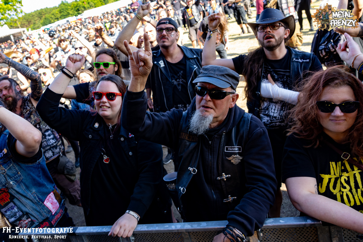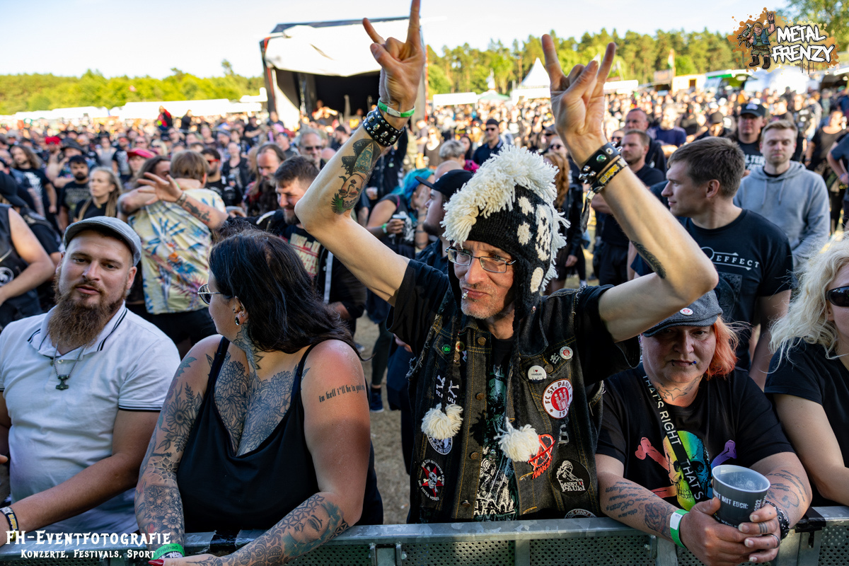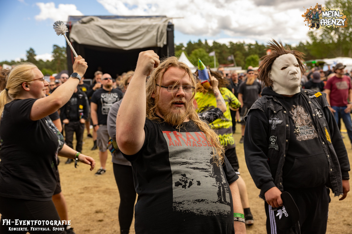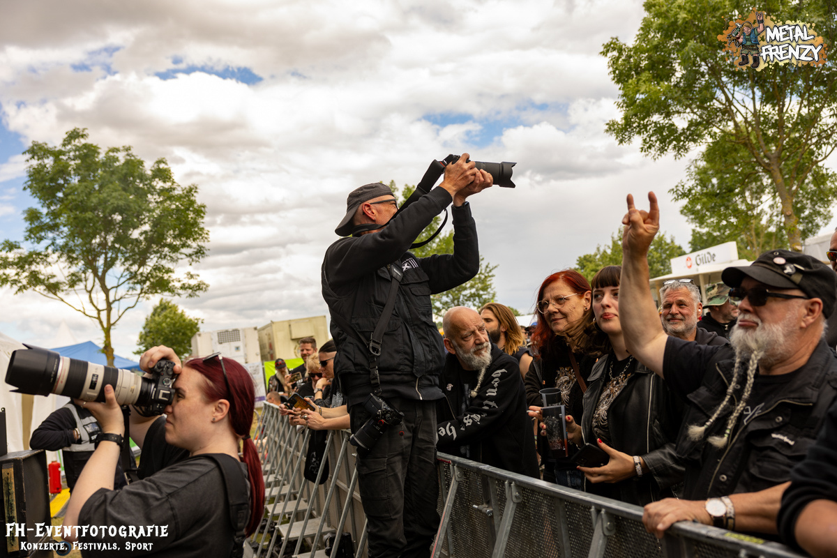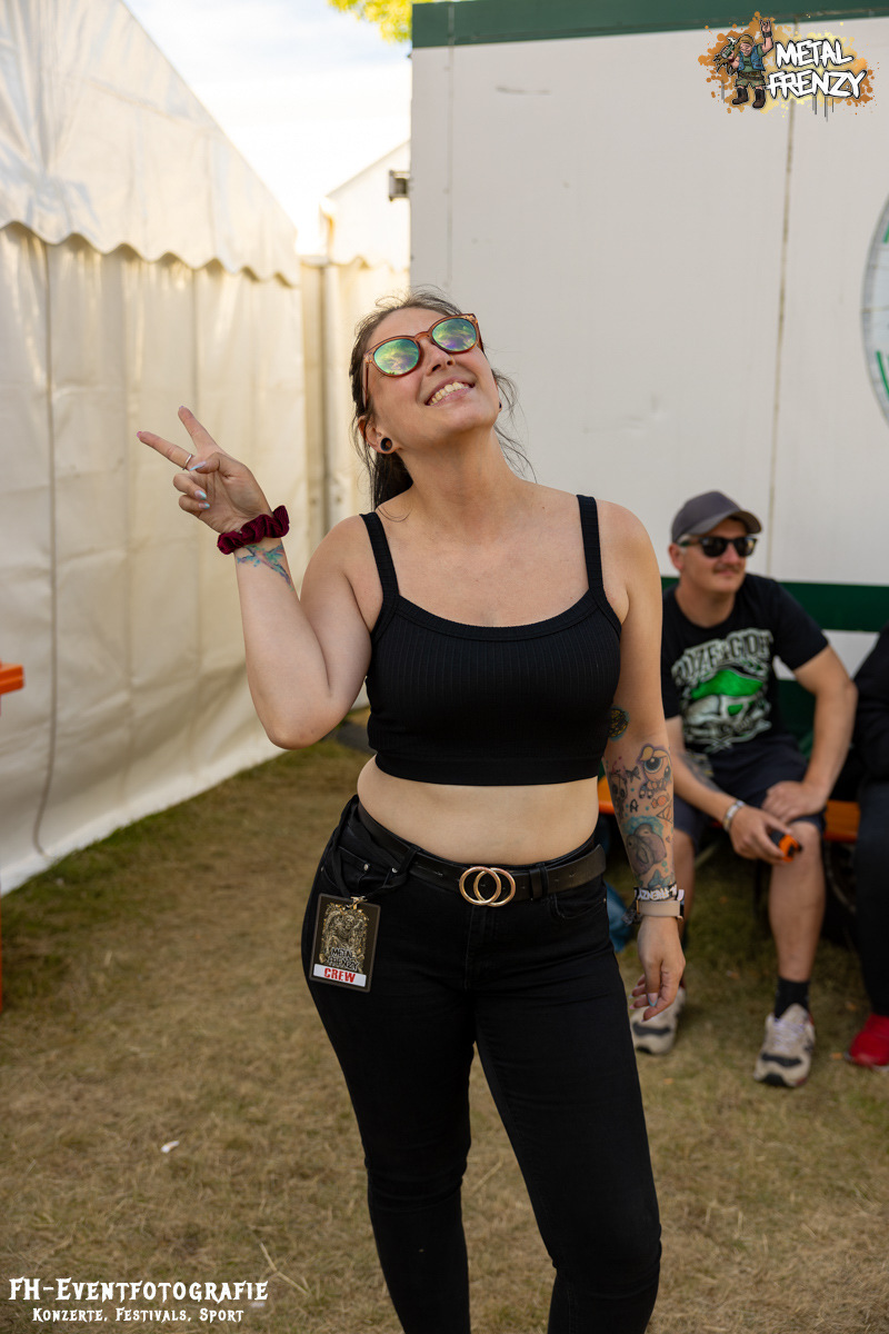 Als Erstes auf der Bühne, noch bevor es eine Band schaffte, ebendiese für sich zu erobern, tauchten viele Menschen mit Schildern auf der Bühne auf. Das Crewfoto stand an. Das ein oder andere Gesicht schaute noch etwas zerknautscht aus, auch den Fotografen vor der Bühne konnte man die vergangenen Tage anmerken. Gleichwohl muss den Machern und Helfern, die da auf der Bühne waren, mein tiefster Respekt gezollt werden. So einige Bands hatten es bereits die Tage über erwähnt. Damit dieses Festival stattfinden konnte und kann, waren und sind über 70, teils ehrenamtliche, fleißige Wichtel am Werke. Schade, dass dieses Bild bei nur wenigen Frühaufstehern im Gedächtnis bleiben wird, aber nur vor den Bands haben sicher all diese Menschen etwas Zeit, um zusammen auf die Bühne kommen zu können. Das Schild, das die allermeisten hielten, zeigte alle Banner der vergangenen Metal Frenzys. Das hätten sicher so einige der Fans auf dem Campground auch. Na ja, ich habe es gesehen und weiß, dass es so etwas gibt. Danke an all die fleißigen Helfer und Macher.
