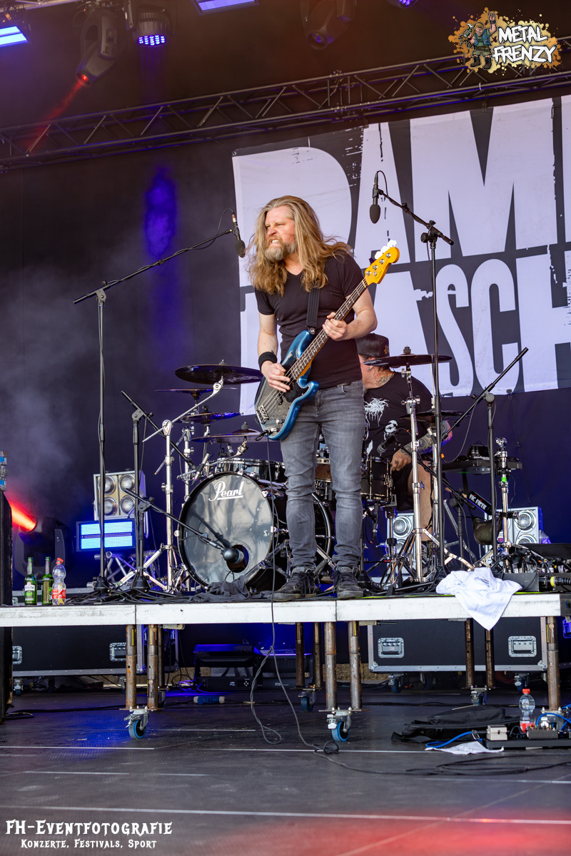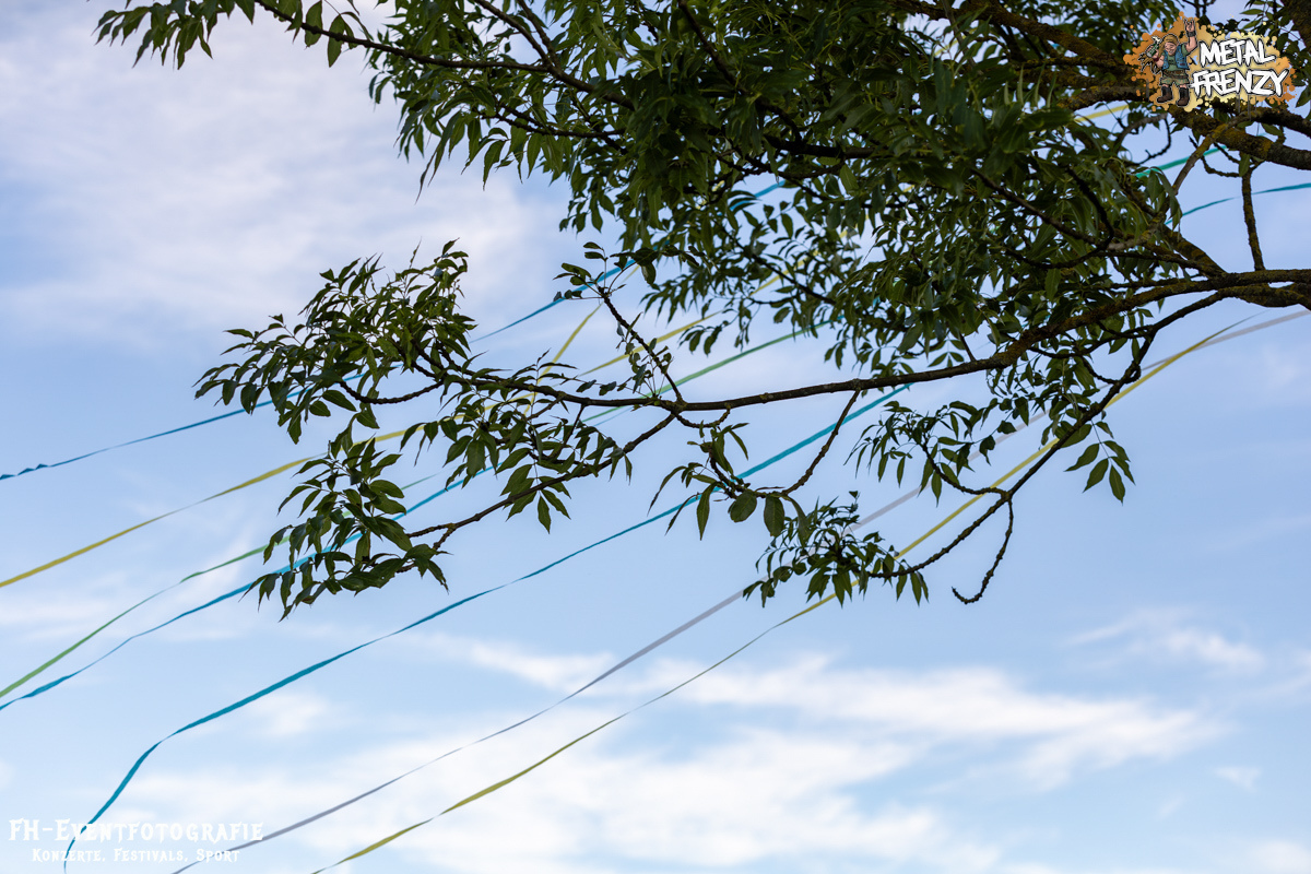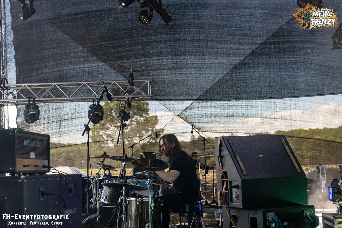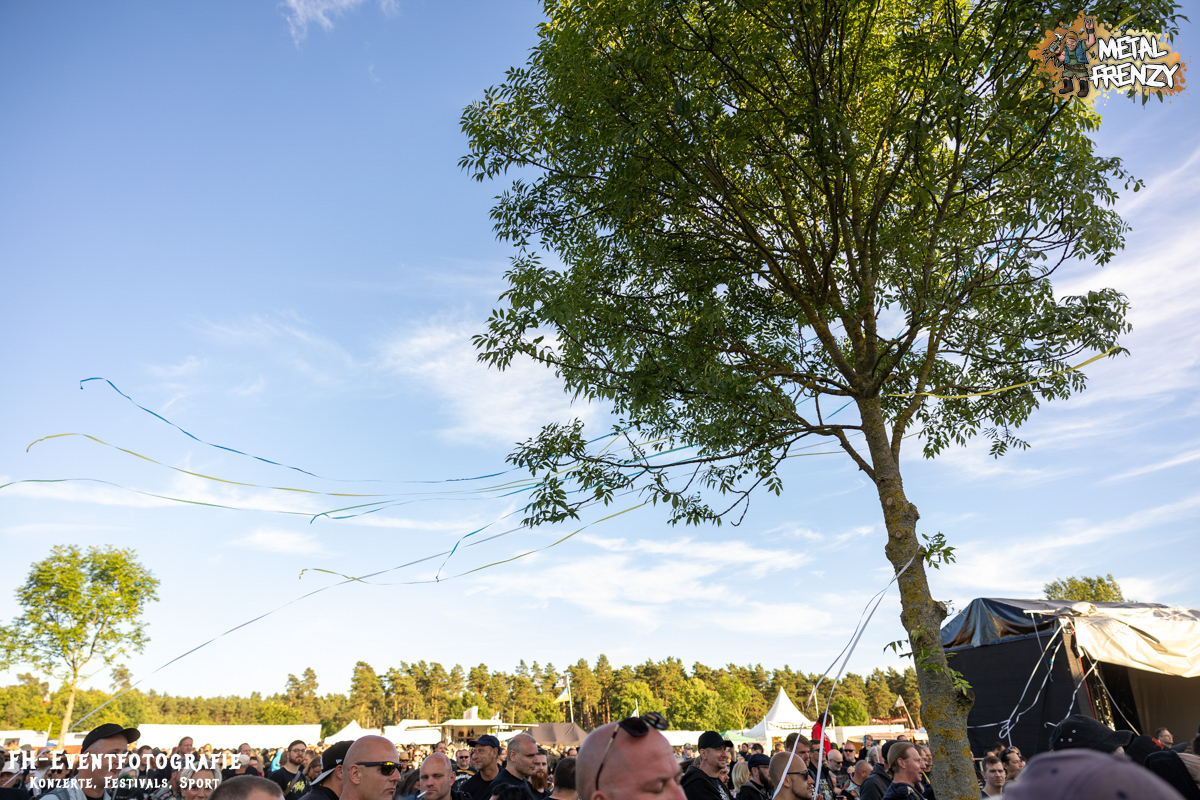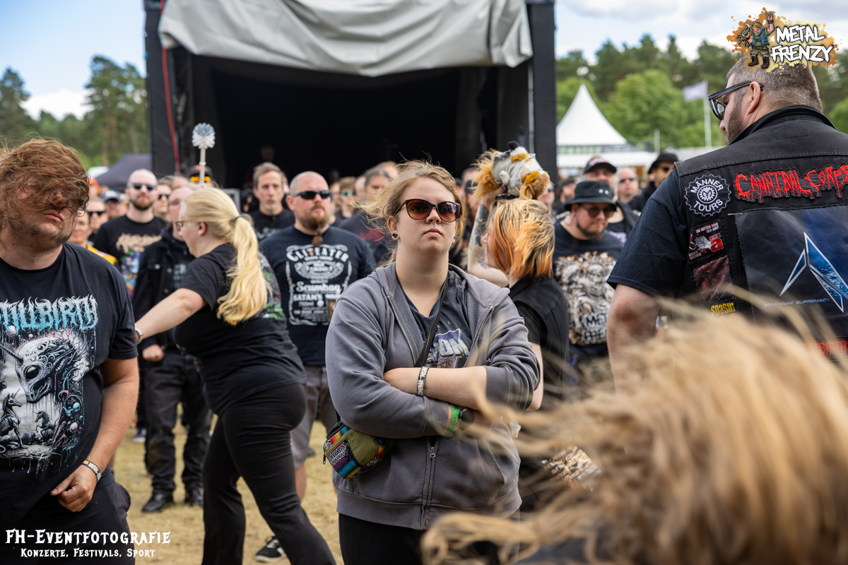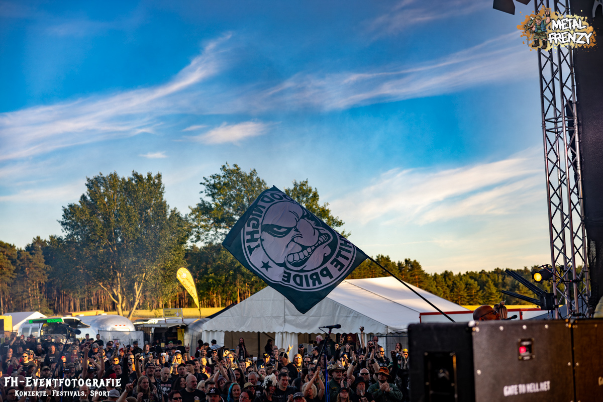 Als Erstes auf der Bühne, noch bevor es eine Band schaffte, ebendiese für sich zu erobern, tauchten viele Menschen mit Schildern auf der Bühne auf. Das Crewfoto stand an. Das ein oder andere Gesicht schaute noch etwas zerknautscht aus, auch den Fotografen vor der Bühne konnte man die vergangenen Tage anmerken. Gleichwohl muss den Machern und Helfern, die da auf der Bühne waren, mein tiefster Respekt gezollt werden. So einige Bands hatten es bereits die Tage über erwähnt. Damit dieses Festival stattfinden konnte und kann, waren und sind über 70, teils ehrenamtliche, fleißige Wichtel am Werke. Schade, dass dieses Bild bei nur wenigen Frühaufstehern im Gedächtnis bleiben wird, aber nur vor den Bands haben sicher all diese Menschen etwas Zeit, um zusammen auf die Bühne kommen zu können. Das Schild, das die allermeisten hielten, zeigte alle Banner der vergangenen Metal Frenzys. Das hätten sicher so einige der Fans auf dem Campground auch. Na ja, ich habe es gesehen und weiß, dass es so etwas gibt. Danke an all die fleißigen Helfer und Macher.