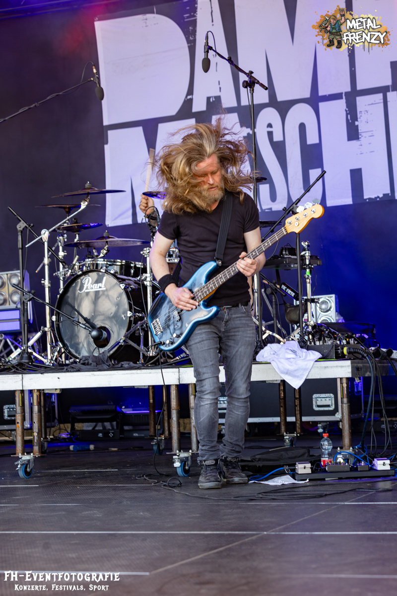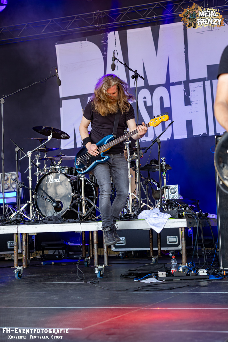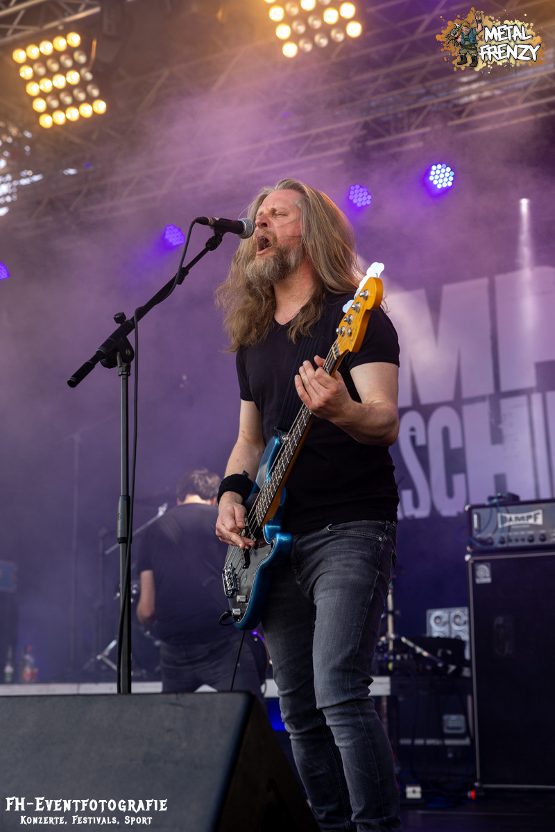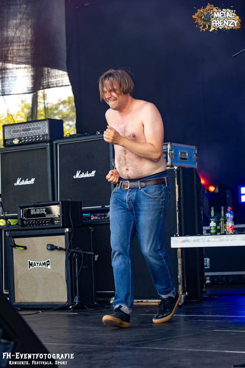 Den Abschluss für heute, also für diesen Bericht, bildet die Osnabrücker Band DAMPFMASCHINE. Neben Bands wie Out the Mouse und den Metal-Möhren scheinen sich über die Jahre noch ein paar Traditionen herauskristallisiert zu haben. Nämlich, dass fast immer eine Band aus dem beschaulichen Osnabrück auf dem Metal Frenzy spielt. Wer weiß, was die da im Wasser haben. Die Dampfmaschine mischte Hardcore mit Stoner und würzte das Ganze dann mit Punk. Alter ist bei denen da das Infield abgegangen. Abgedrehtes Mucke und dazu, als ob die Osnabrücker nicht nur Musiker stellen, die Geiles abliefern, scheinen sie auch Wettervoodoo zu beherrschen, gab die Sonne alles.