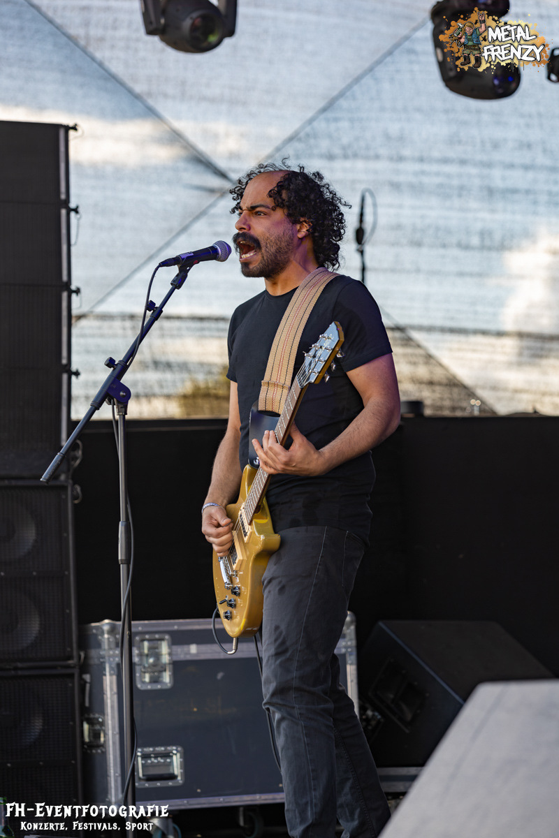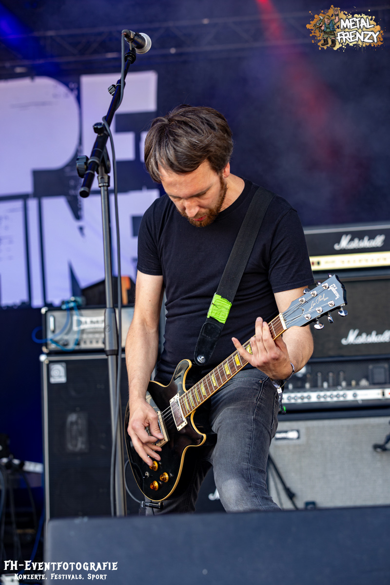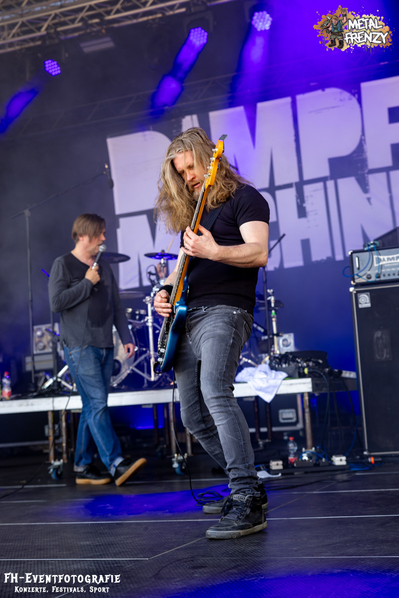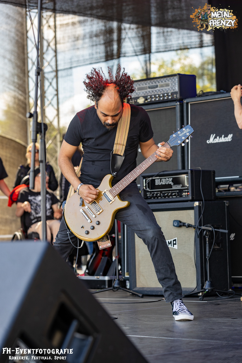 Den Abschluss für heute, also für diesen Bericht, bildet die Osnabrücker Band DAMPFMASCHINE. Neben Bands wie Out the Mouse und den Metal-Möhren scheinen sich über die Jahre noch ein paar Traditionen herauskristallisiert zu haben. Nämlich, dass fast immer eine Band aus dem beschaulichen Osnabrück auf dem Metal Frenzy spielt. Wer weiß, was die da im Wasser haben. Die Dampfmaschine mischte Hardcore mit Stoner und würzte das Ganze dann mit Punk. Alter ist bei denen da das Infield abgegangen. Abgedrehtes Mucke und dazu, als ob die Osnabrücker nicht nur Musiker stellen, die Geiles abliefern, scheinen sie auch Wettervoodoo zu beherrschen, gab die Sonne alles.