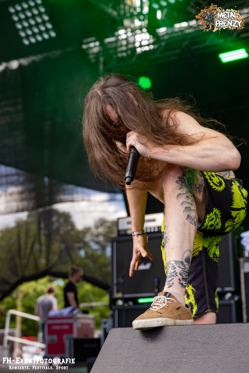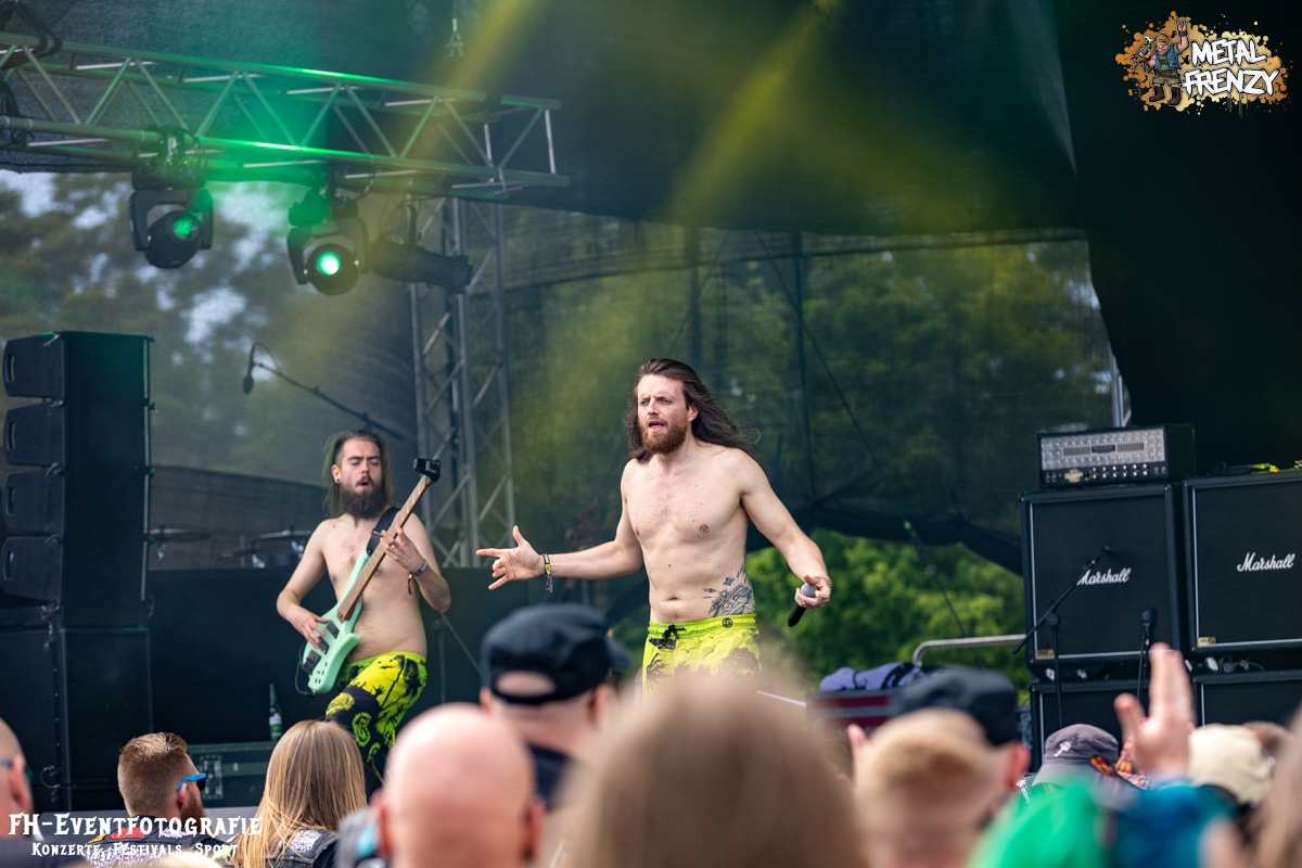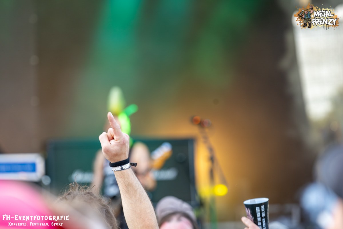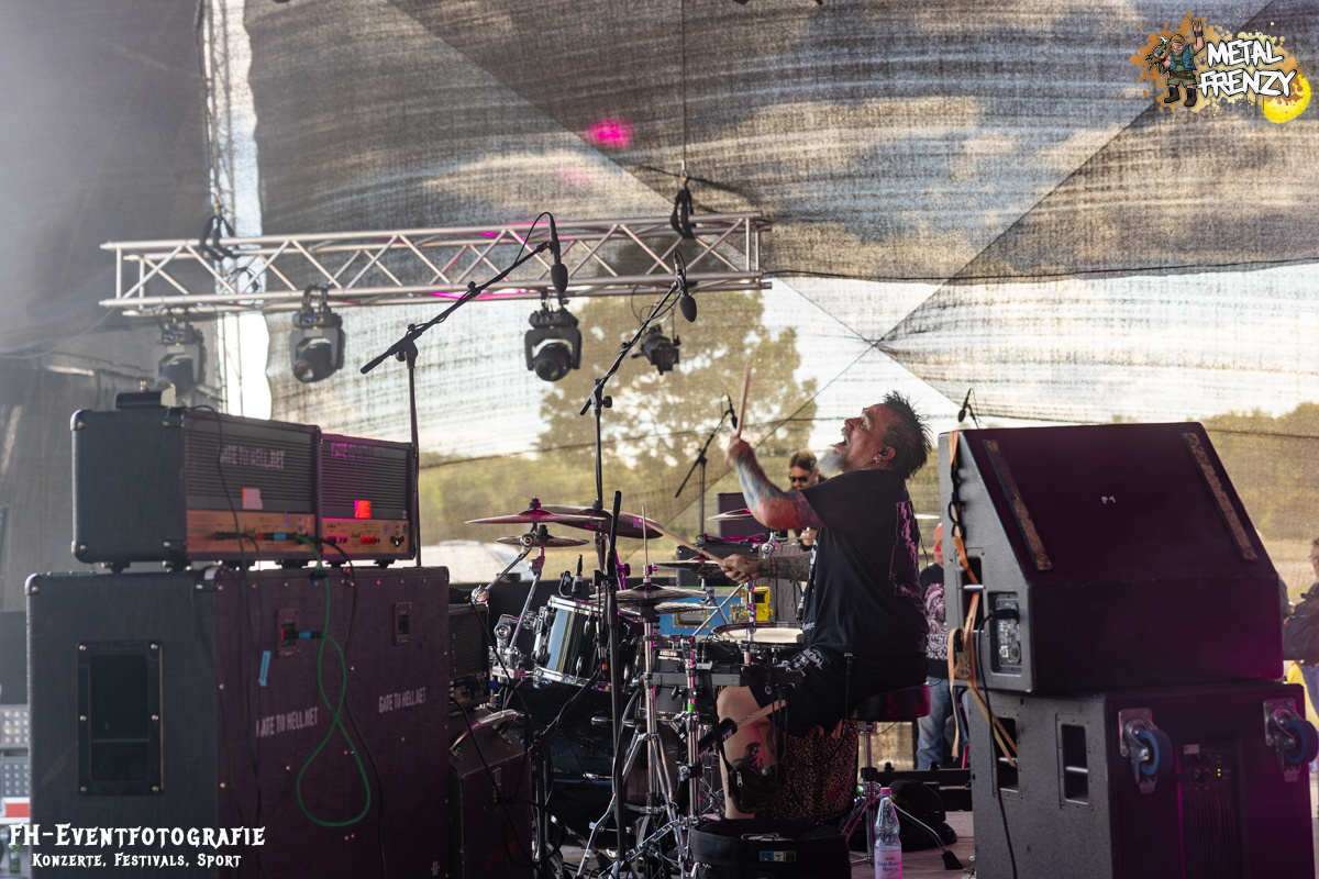 Im Anschluss spielten eine Band, die inklusive 2024 ihren 3. Auftritt auf dem Metal Frenzy hatten. Milking The Goatmachine spielen Todesgrind. Das ist eine Musikrichtung, die von weit über 1500 Fans vor der Bühne hart abgefeiert wurde. Meiner einer hielt sich aus der tobenden Menge raus und gab lieber weiter Geld für Essen und Trinken aus. Für derartige Eskalationen bin ich einfach zu kaputt und zu alt. Zumal danach noch eine Steigerung auf das Festival wartete.