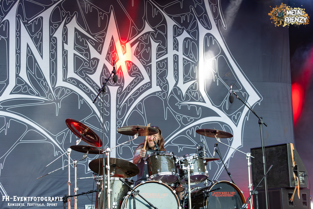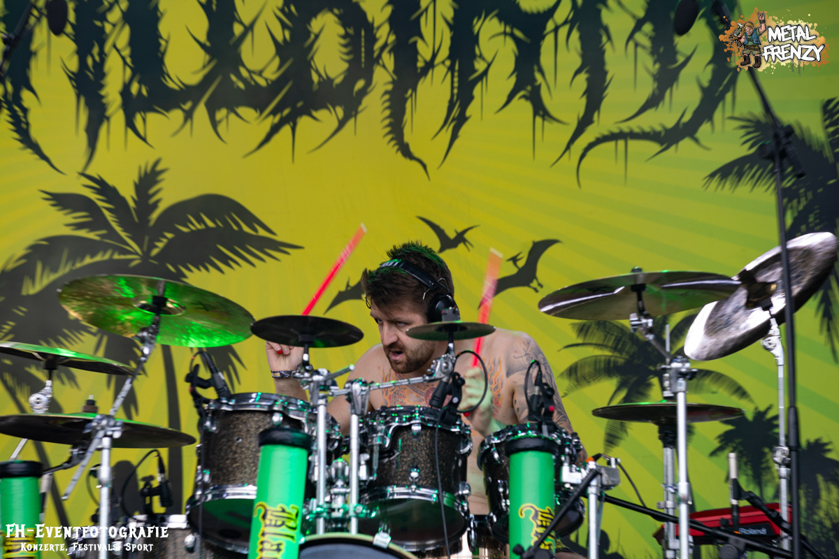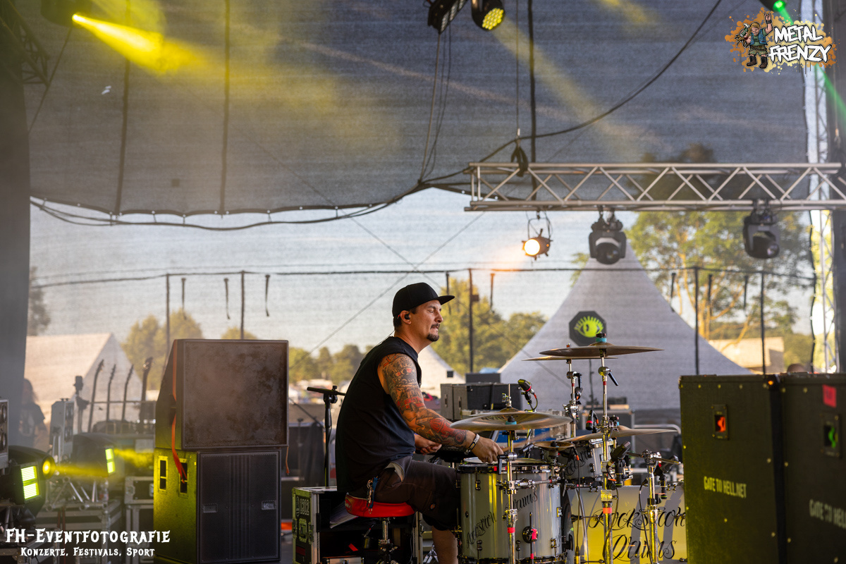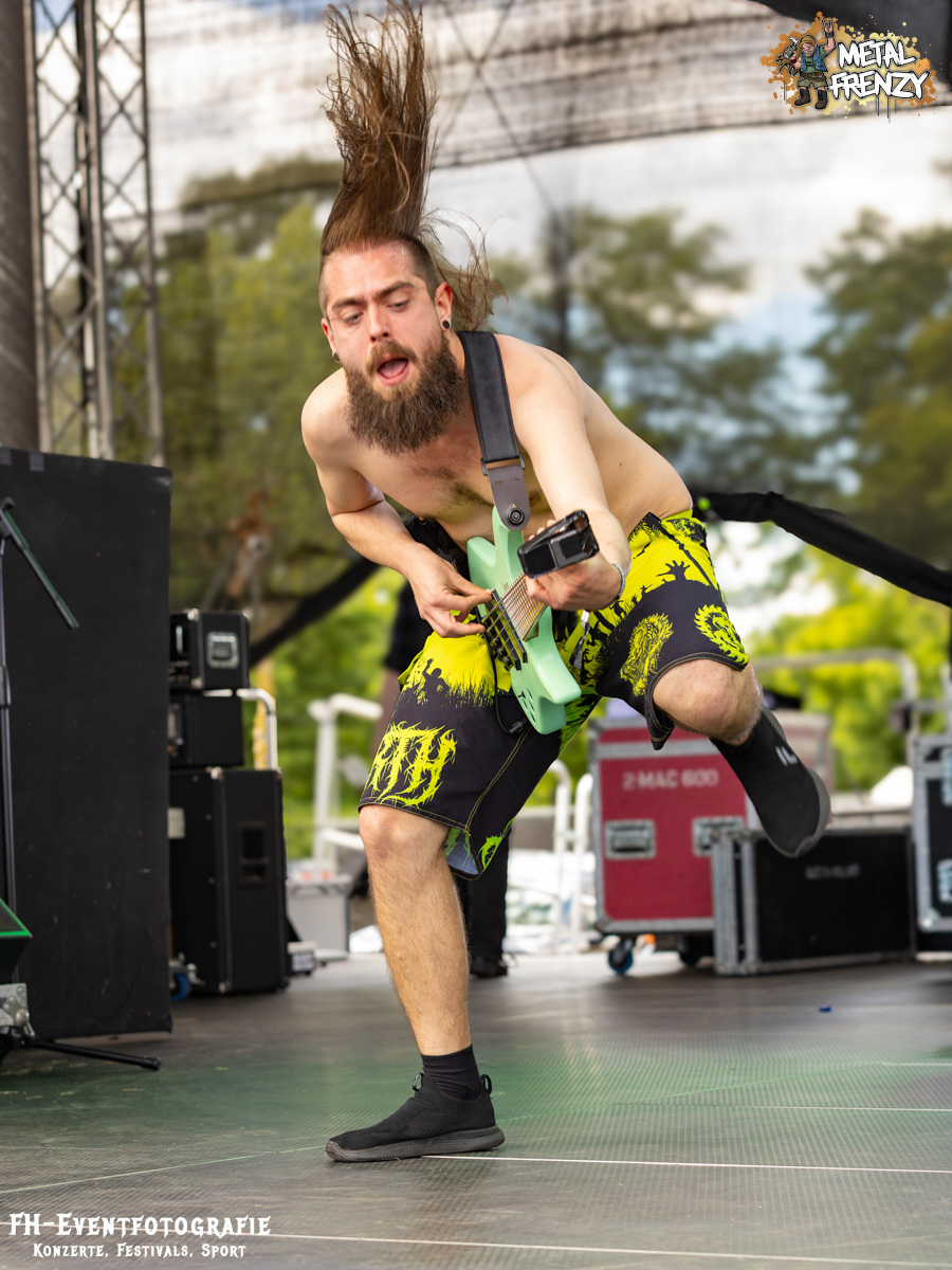 Im Anschluss spielten eine Band, die inklusive 2024 ihren 3. Auftritt auf dem Metal Frenzy hatten. Milking The Goatmachine spielen Todesgrind. Das ist eine Musikrichtung, die von weit über 1500 Fans vor der Bühne hart abgefeiert wurde. Meiner einer hielt sich aus der tobenden Menge raus und gab lieber weiter Geld für Essen und Trinken aus. Für derartige Eskalationen bin ich einfach zu kaputt und zu alt. Zumal danach noch eine Steigerung auf das Festival wartete.
