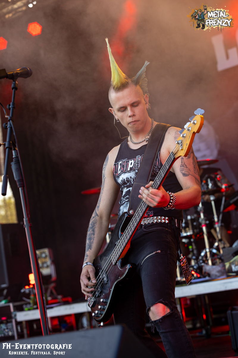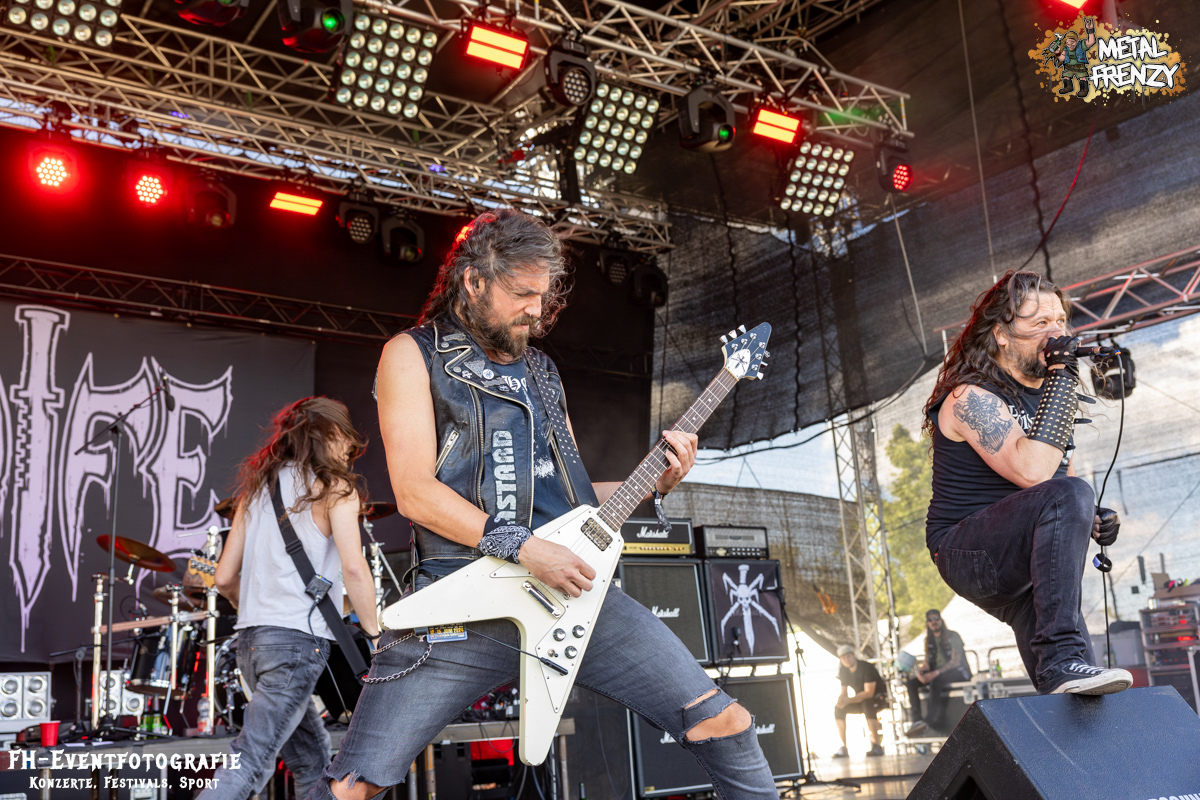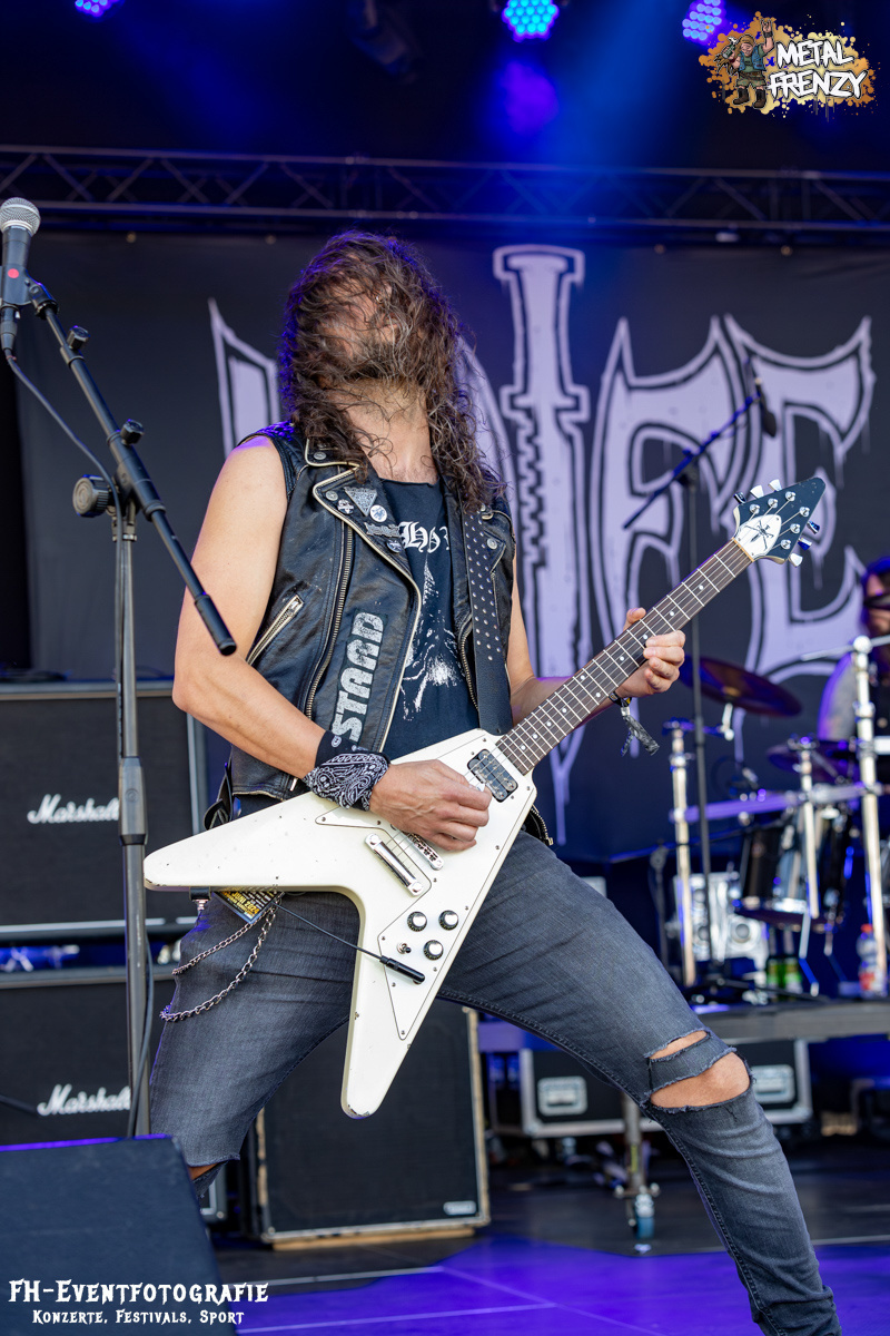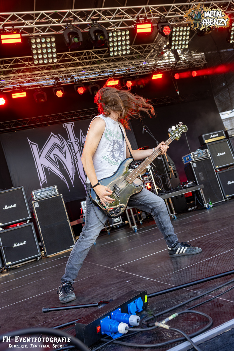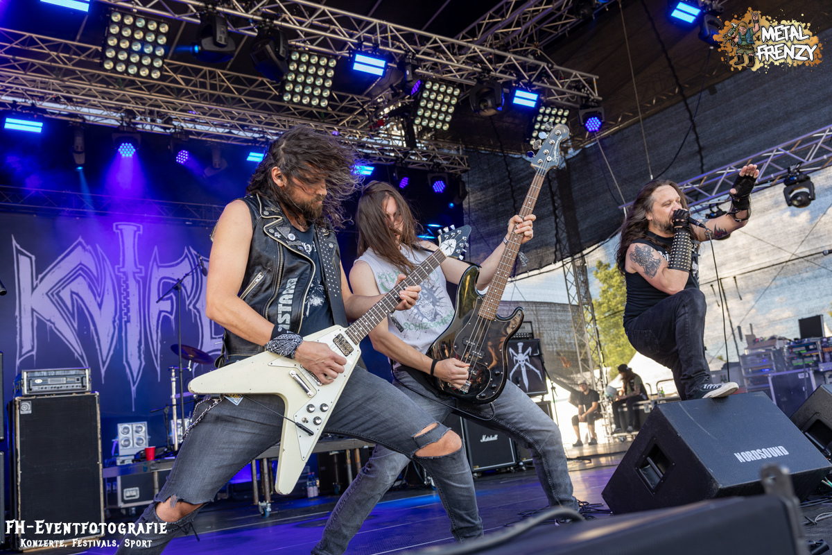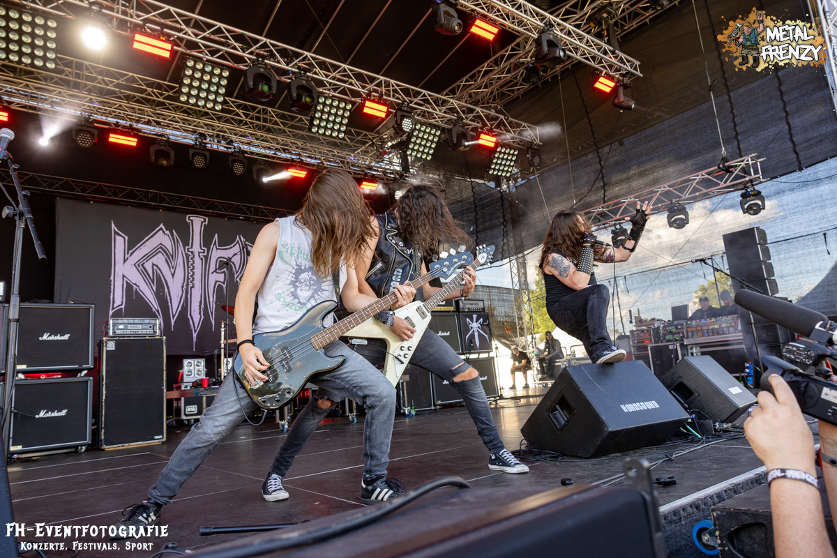 Nach DAMPFMASCHINE gab es auf der Bühne wieder eine Band, die sich ihre eigene Musikrichtung zusammengestellt hatte. Gemäß dem Motto, mach das, was sich für dich richtig und gut anfühlt, spielten KNIFE mit ihrem Blackspeedmetalpunk auf. Glaubt mir einfach, wenn ich euch im Nachhinein sage, dass das eine der beeindruckendsten Musikstile war, die ich 2024 auf dem Metal Frenzy habe neu kennenlernen dürfen. Dazu kam die schiere Begeisterung der Band ab, gehen zu dürfen, ohne dass da, wer stopp ruft. Selbst die kurze Klettereinlage des Sängers passte dazu einfach super. Kleine Ausflüge der Musiker ins Publikum inklusive