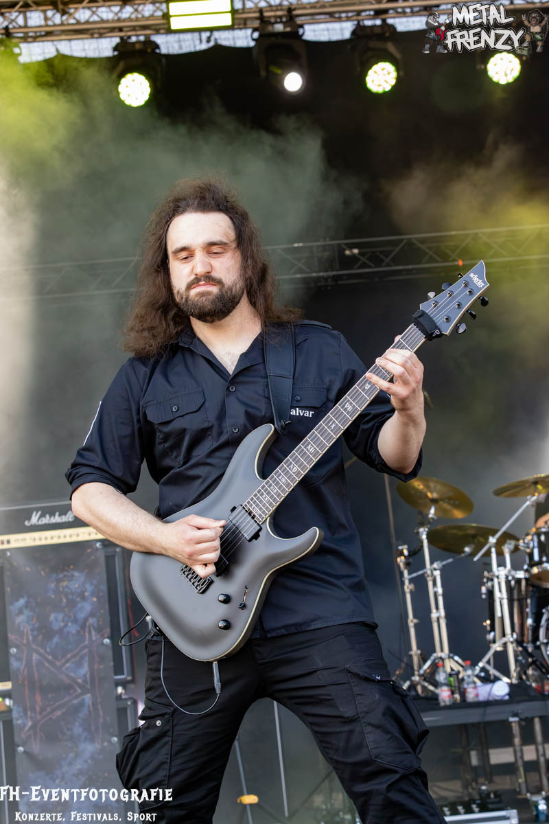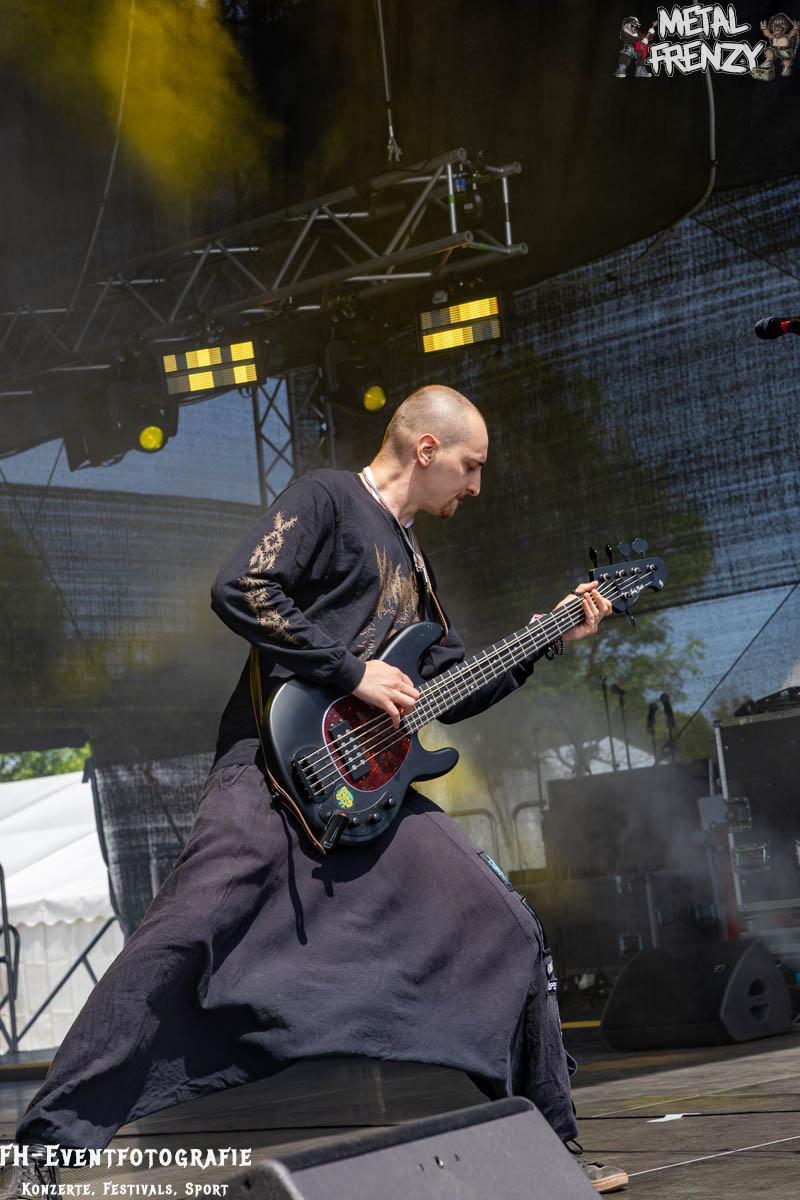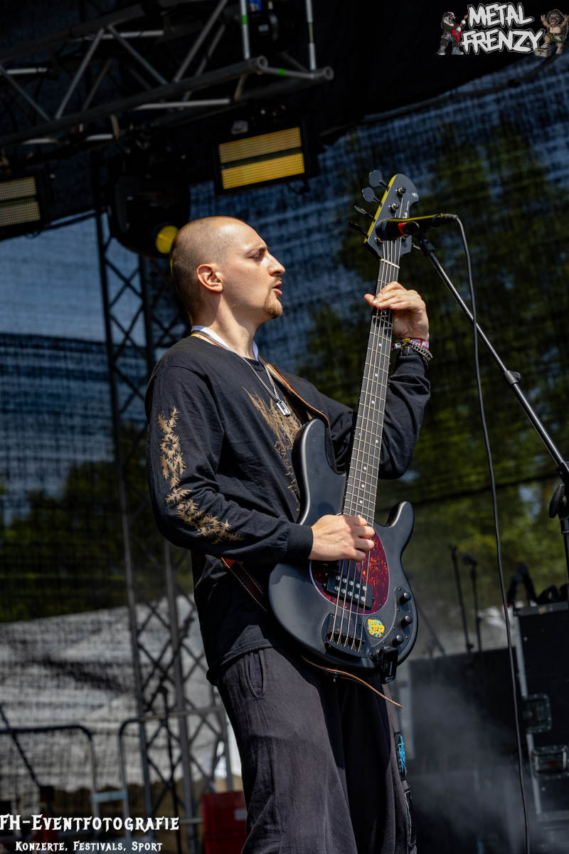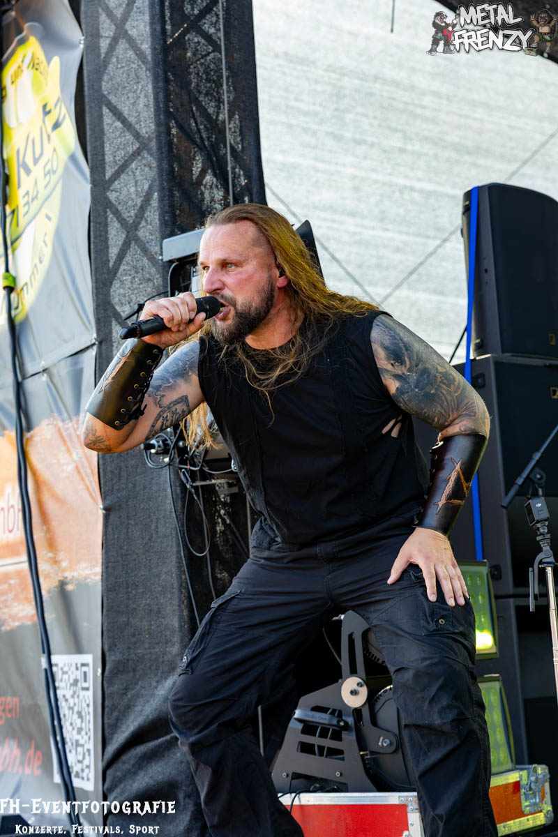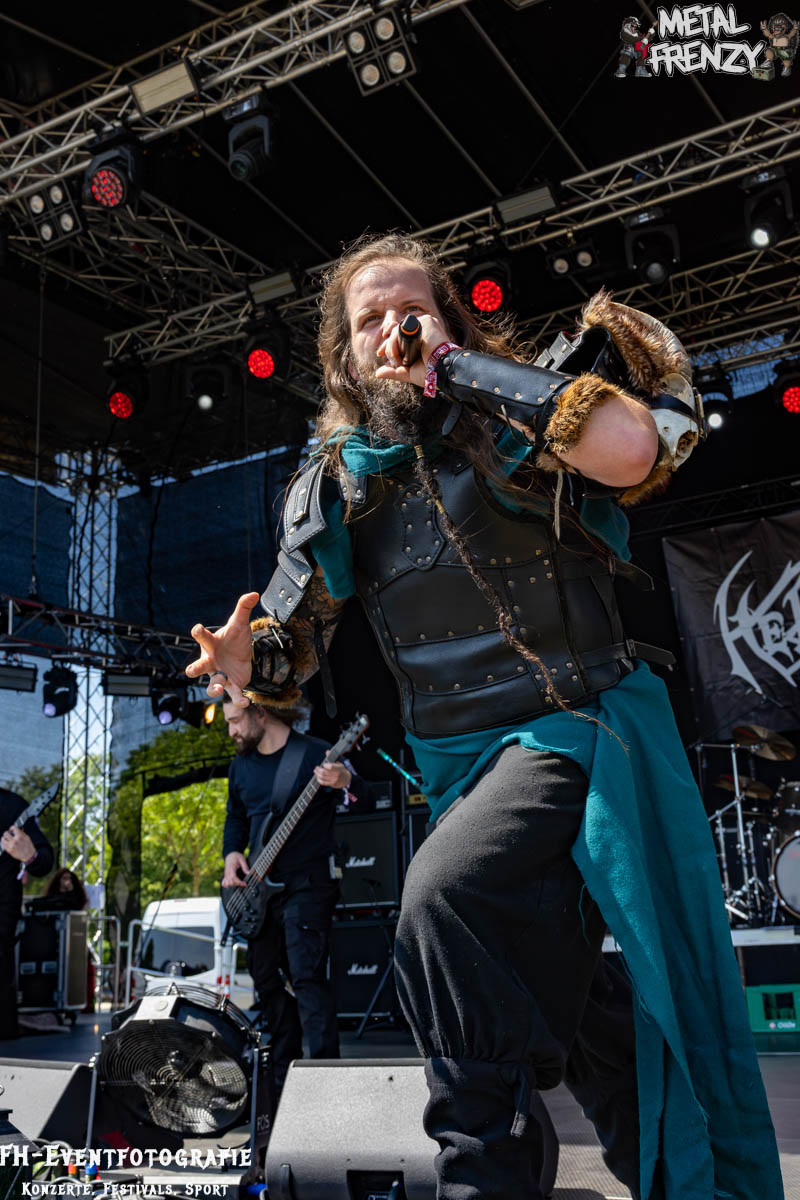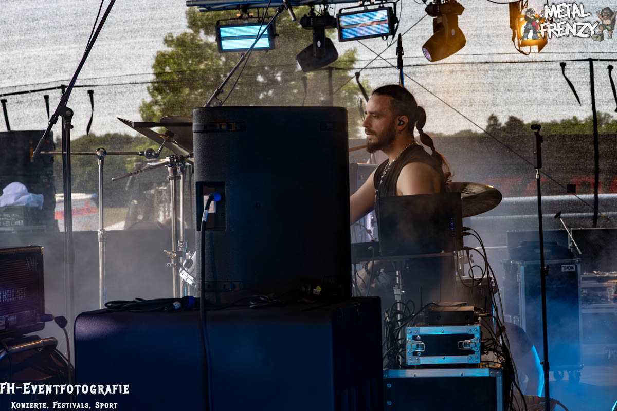 Bei mittlerweile gefühlten 35 Grad ging es mit Helgrindur aus Solingen weiter. Der Sänger der Pagan-Metal-Band hat unter seinem Gewand bestimmt gut geschwitzt, aber die Fans feierten die Band. Da es auf dem Metal Frenzy Festival kostenfrei Wasser zu trinken gab, konnte man sich zwischen den anderen Kaltgetränken wieder etwas Flüssigkeit zuführen und gegen die Hitze ankämpfen.
