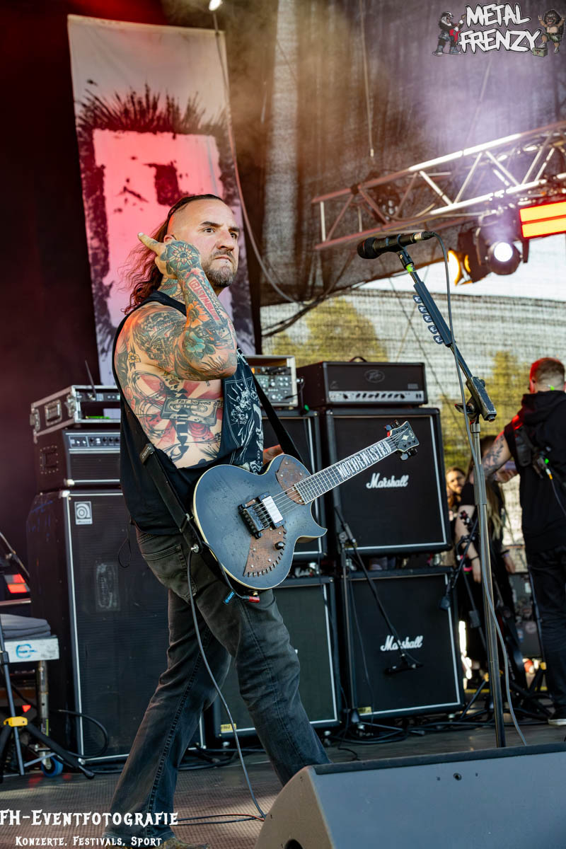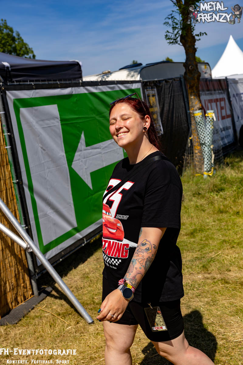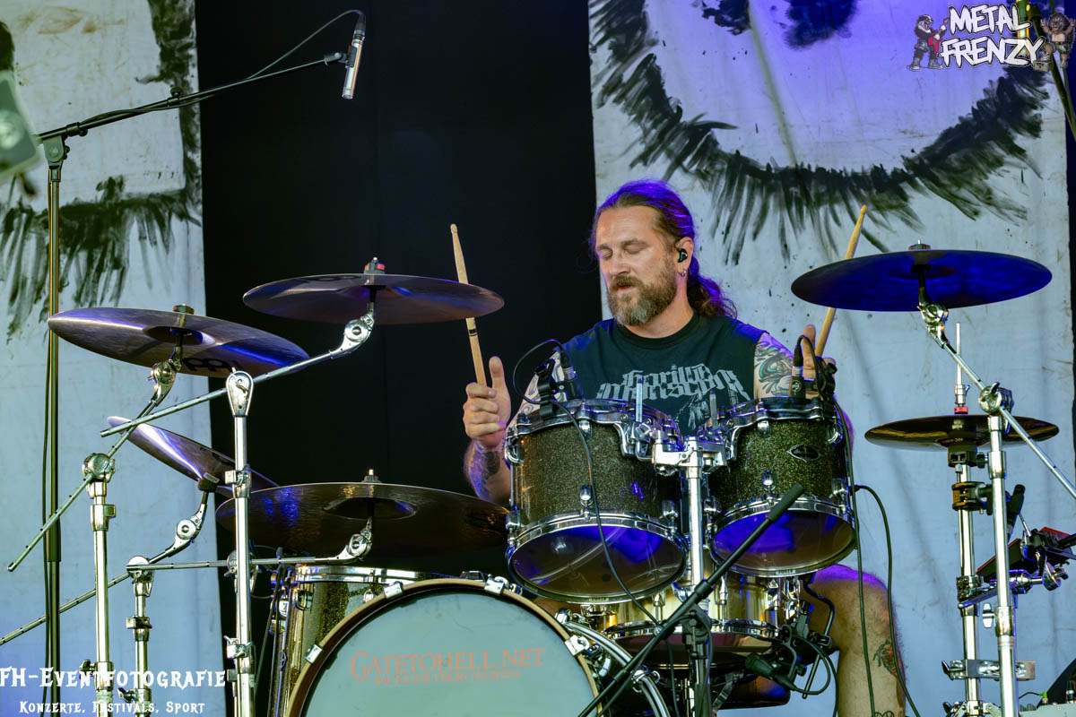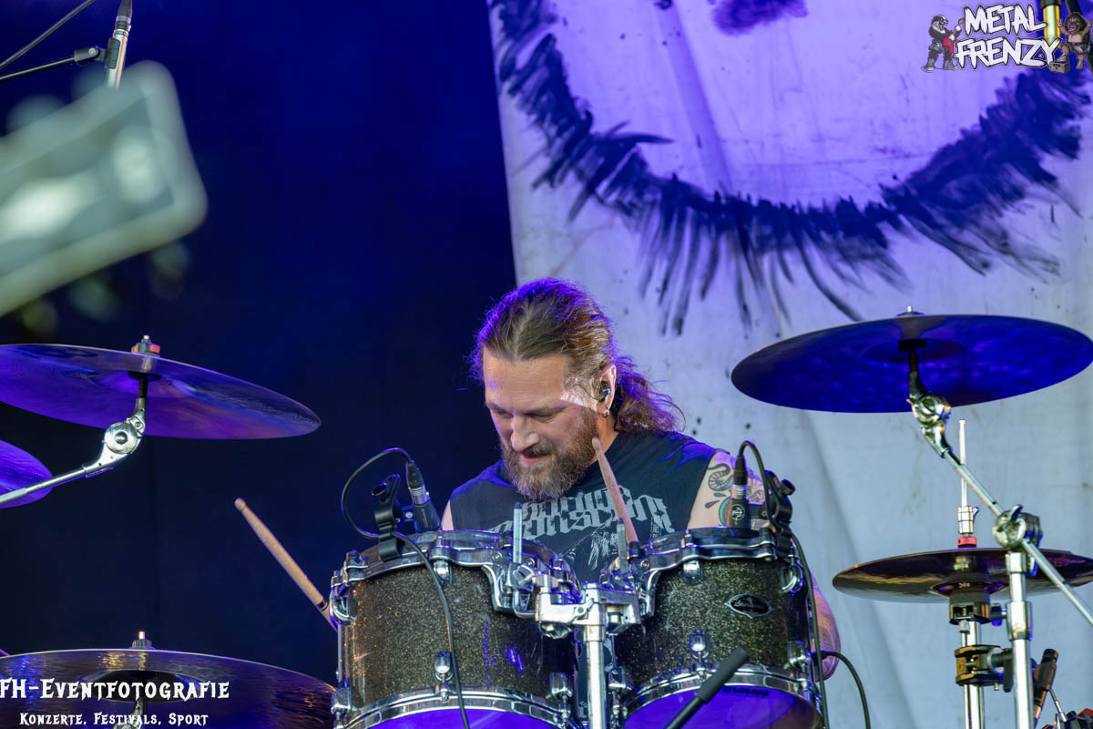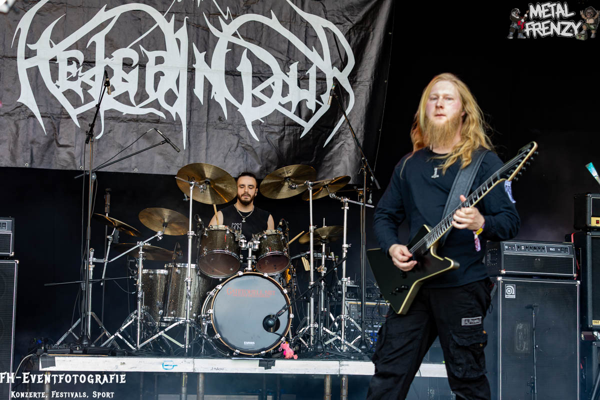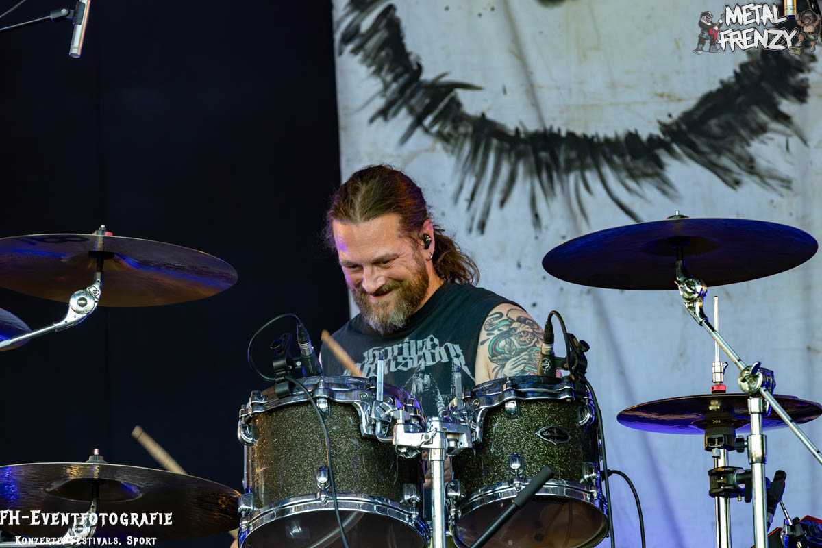Bei mittlerweile gefühlten 35 Grad ging es mit Helgrindur aus Solingen weiter. Der Sänger der Pagan-Metal-Band hat unter seinem Gewand bestimmt gut geschwitzt, aber die Fans feierten die Band. Da es auf dem Metal Frenzy Festival kostenfrei Wasser zu trinken gab, konnte man sich zwischen den anderen Kaltgetränken wieder etwas Flüssigkeit zuführen und gegen die Hitze ankämpfen.
