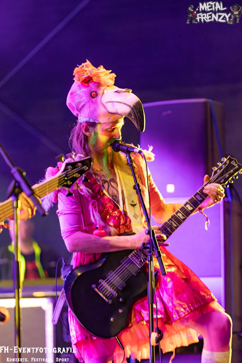 Nach ihrer Show gab’s eine ungeplante Pause – Technikprobleme. Trollfest mussten fast 30 Minuten warten, aber der Flamingo-Backdrop sorgte für gute Laune. Und ja, mein Moderations-Outfit hatte ebenfalls Flamingos – völlig unbeabsichtigt.