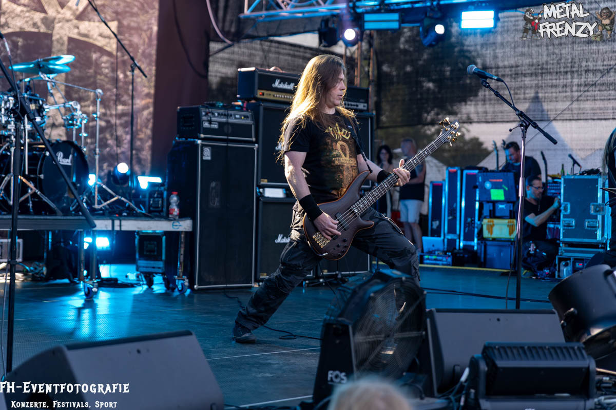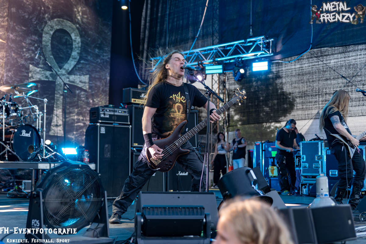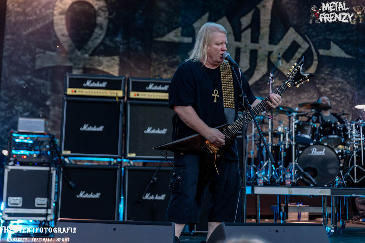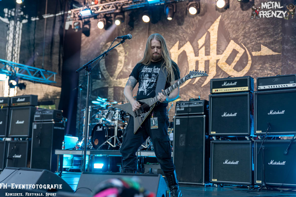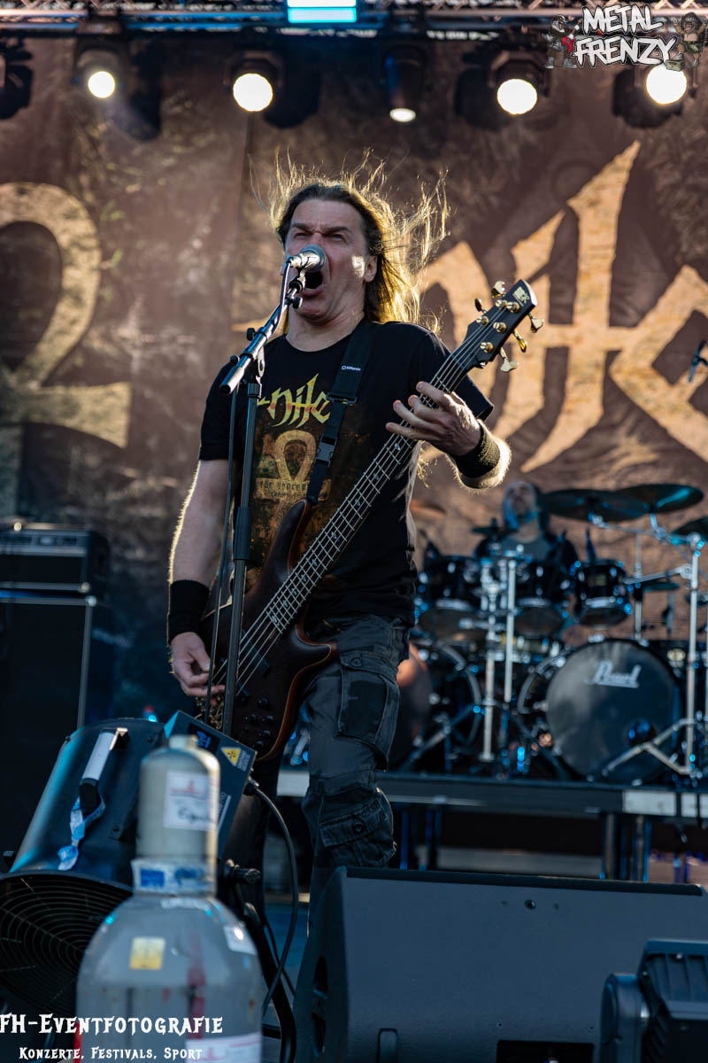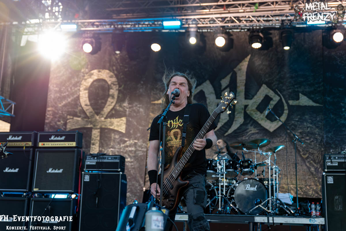 Als vorletzte Band des MFOA 2025 spielten die für mich insgeheimen Headliner des Samstags auf. Ich habe »Nile« bisher zweimal live erleben dürfen, aber immer nur eher am Rande. Die Herren aus South-Carolina sind einfach geil. Technical-Death-Metal mag sicher nicht jedermanns Fall sein, aber ich und so ziemlich alle Besucher des Festivals schienen da einer Meinung zu sein. Was war das für ein musikalisches Geschenk. Da hat das Team vom Metal-Frenzy mal wieder was ganz Feines auf die Bühne geholt.