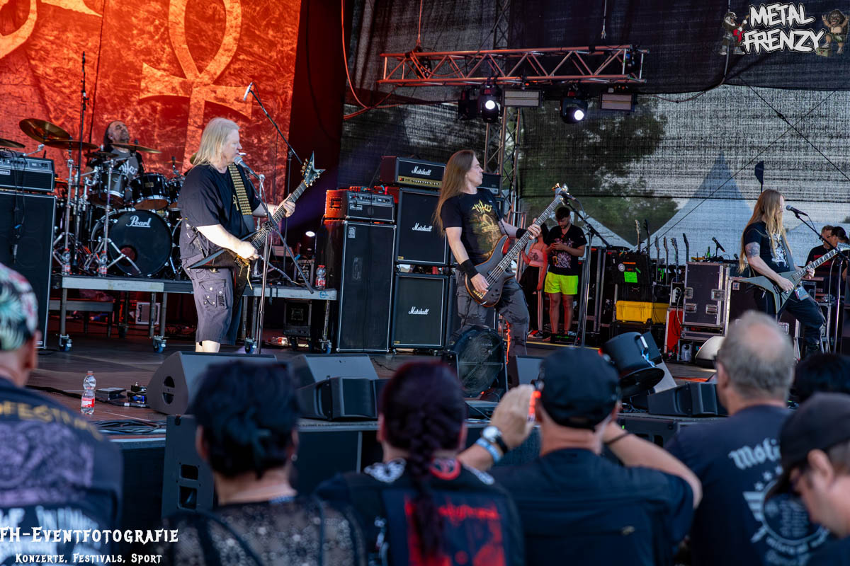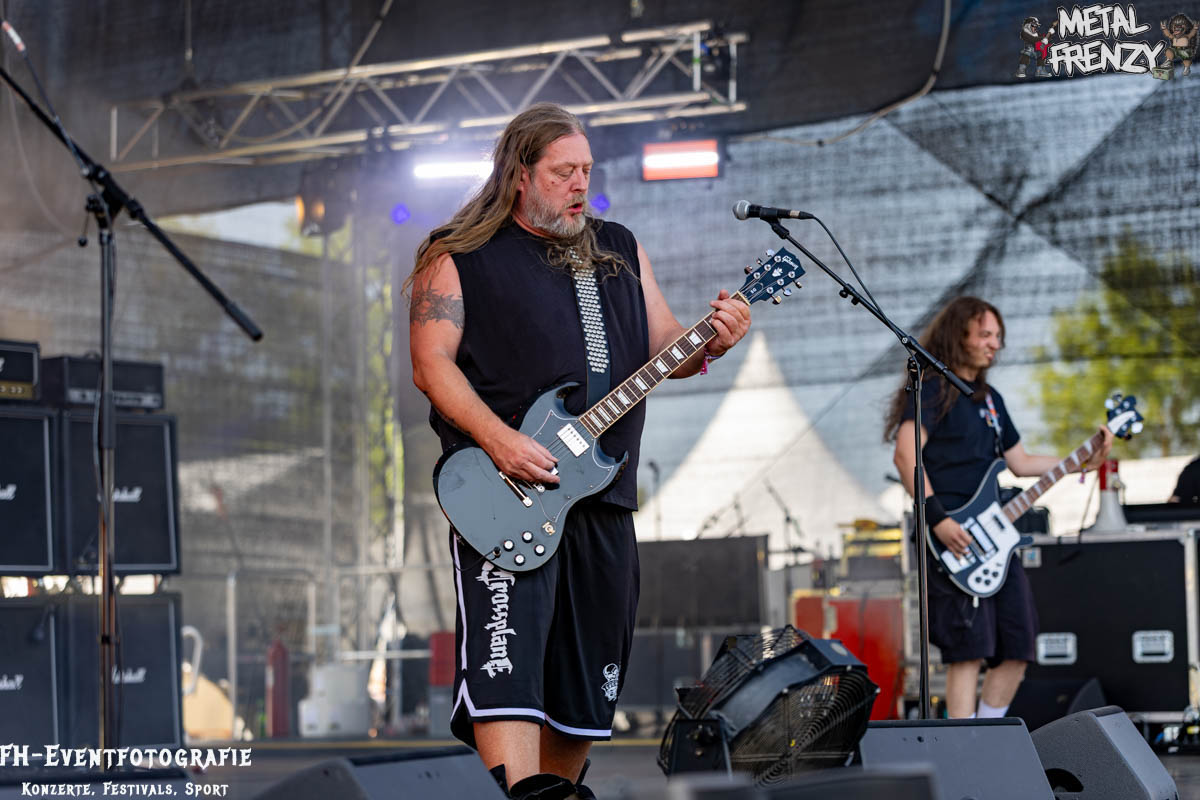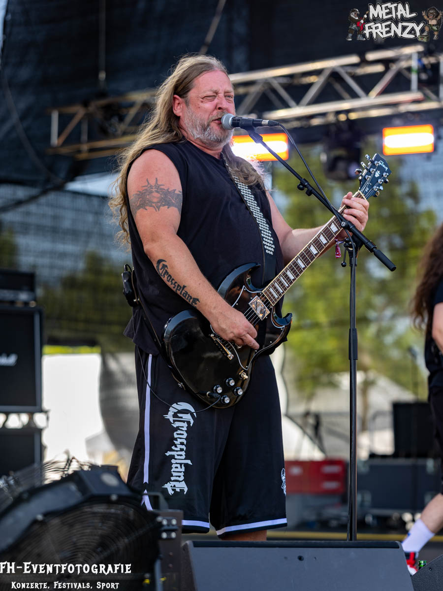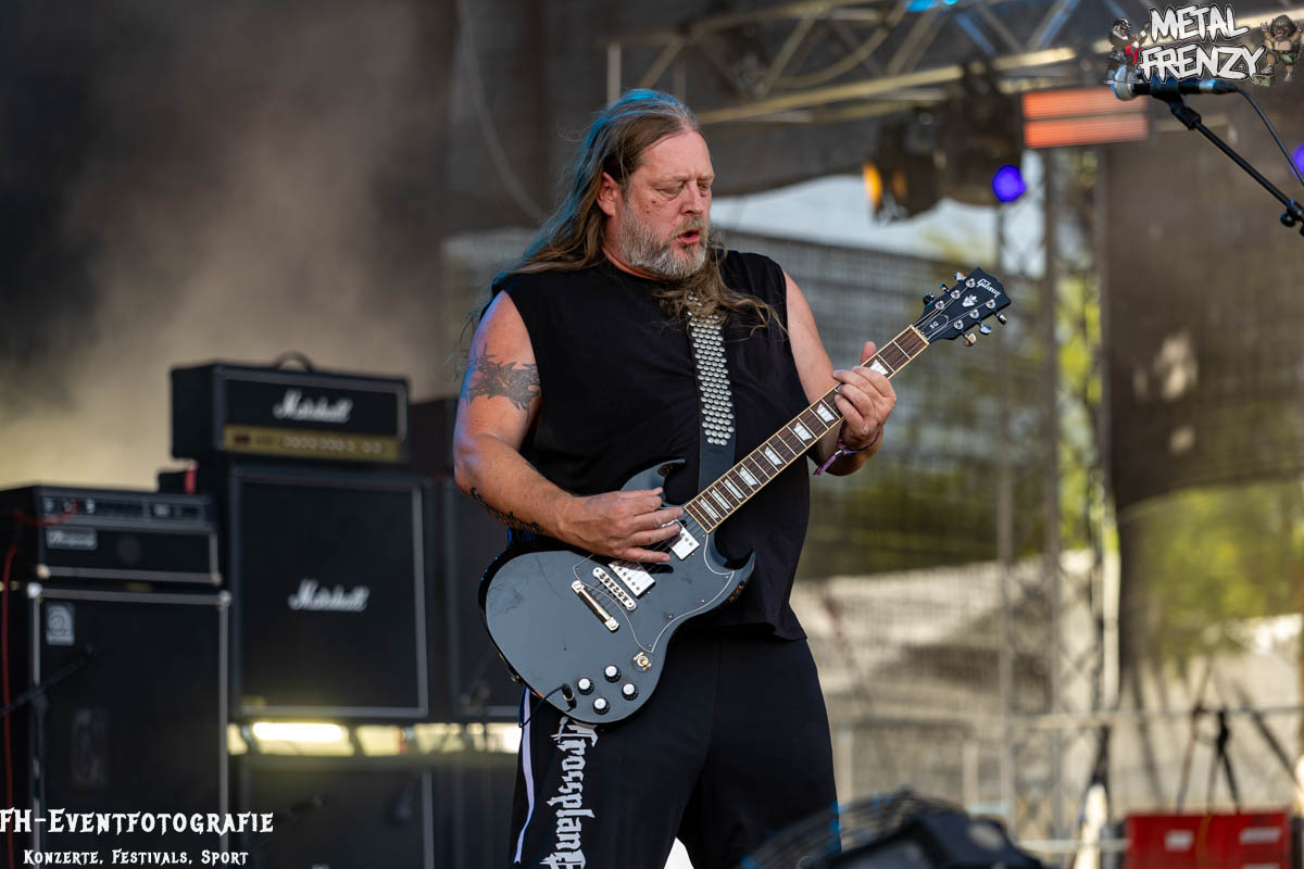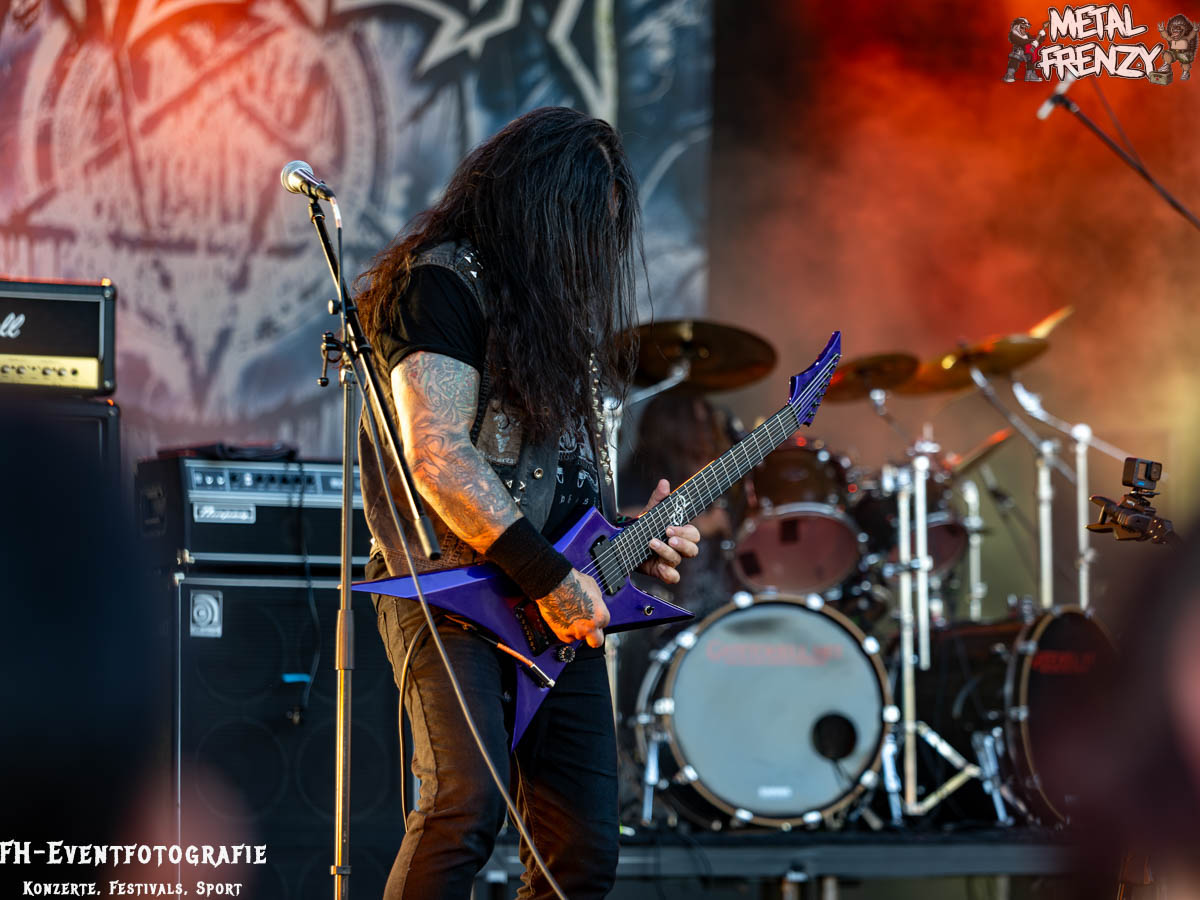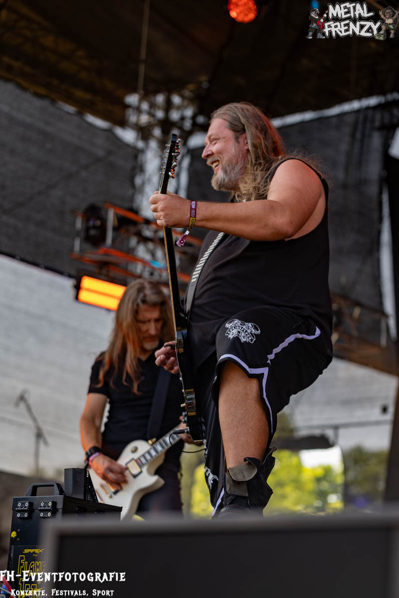 Als vorletzte Band des MFOA 2025 spielten die für mich insgeheimen Headliner des Samstags auf. Ich habe »Nile« bisher zweimal live erleben dürfen, aber immer nur eher am Rande. Die Herren aus South-Carolina sind einfach geil. Technical-Death-Metal mag sicher nicht jedermanns Fall sein, aber ich und so ziemlich alle Besucher des Festivals schienen da einer Meinung zu sein. Was war das für ein musikalisches Geschenk. Da hat das Team vom Metal-Frenzy mal wieder was ganz Feines auf die Bühne geholt.