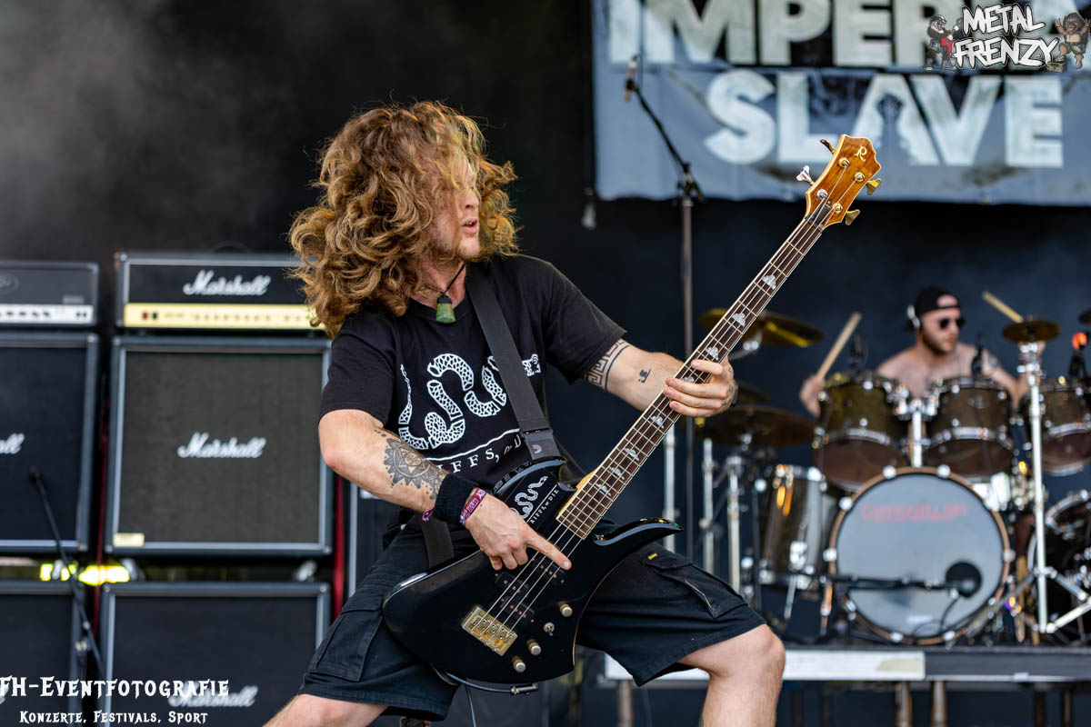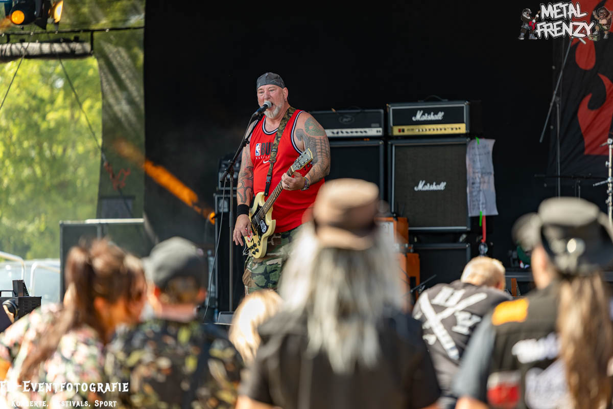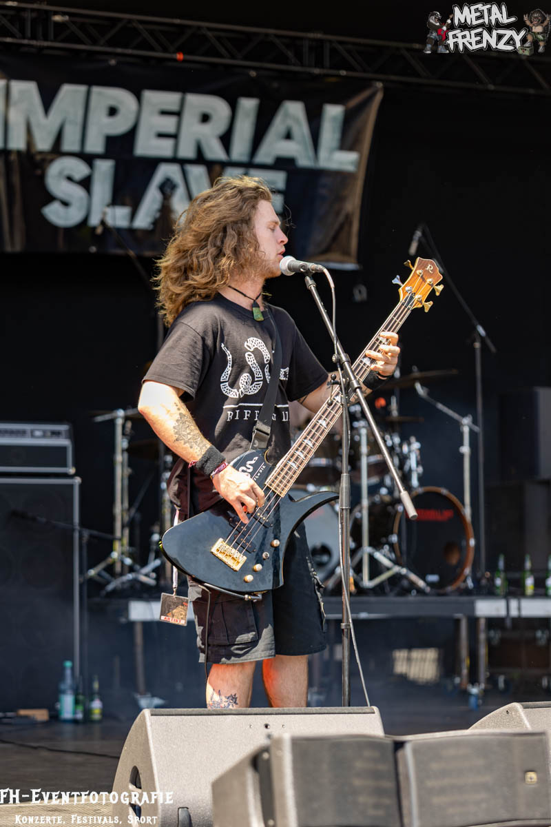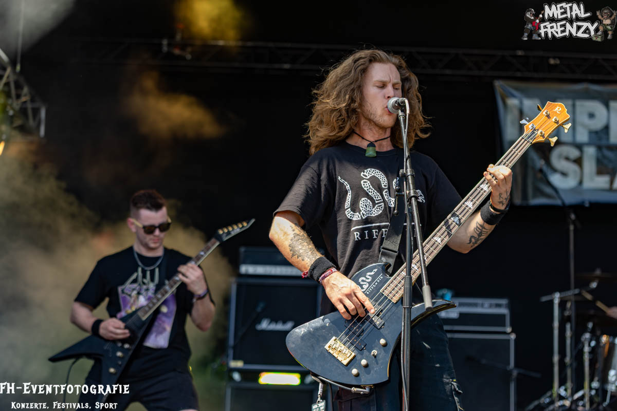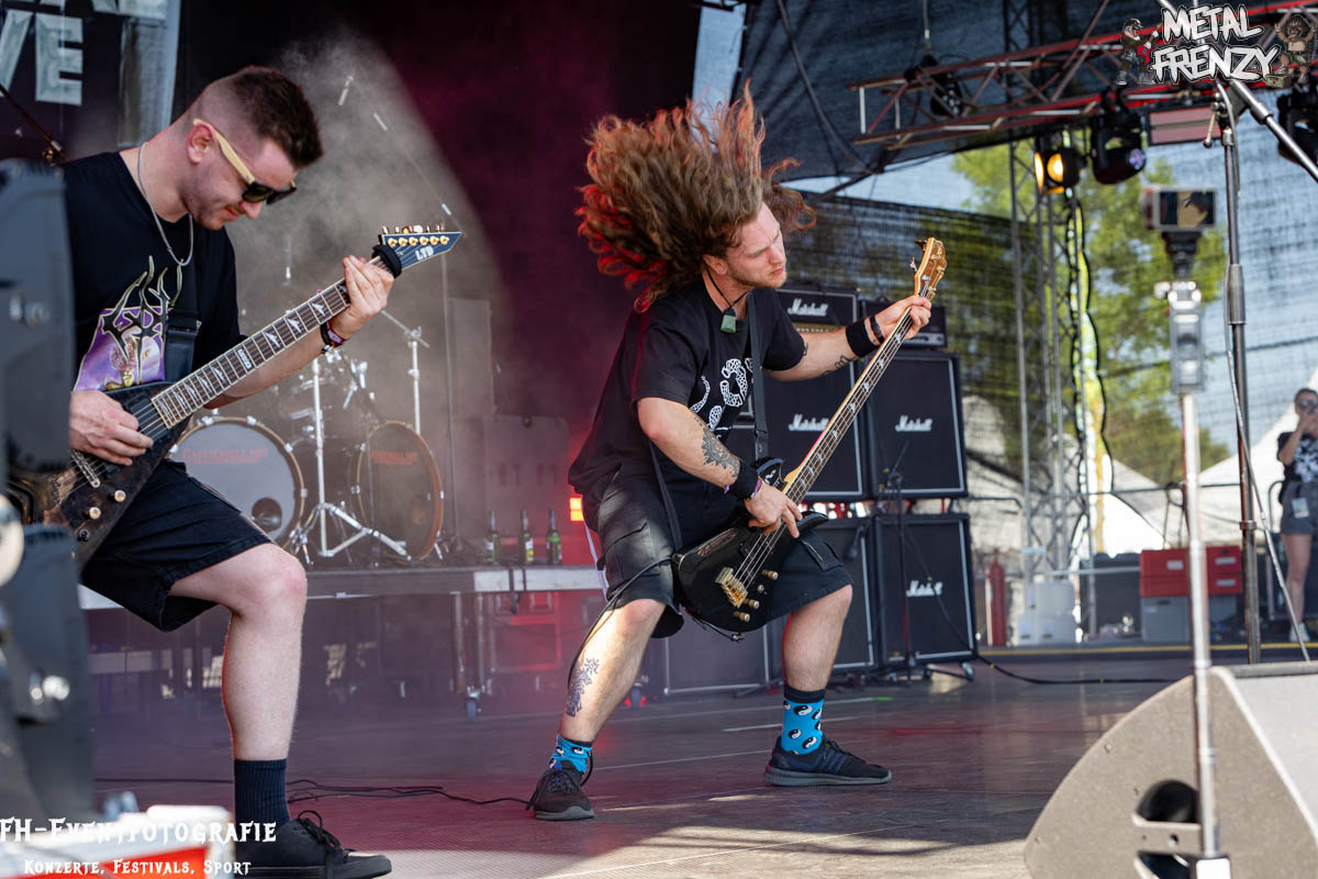 Die kommende Band hatte ganz sicher den weitesten Weg, um nach Gardelegen zu gelangen. »Imperial Slave« aus Neuseeland waren den unglaublichen Weg für beide Seiten absolut wert. Die Band hatte sichtlich Spaß und auch die, die hitzeresistent genug waren, sich in den Glutofen vor die Bühne zu wagen, hatten eine richtig geile Zeit. Die Herren von der anderen Seite der Erde haben einen einfachen, aber wunderbar druckvoll geradlinigen Sound. Da lohnt es sich, die Chance zu nutzen, die Neuseeländer mal live zu erleben. Also schaut, was geht und wo ihr sie finden könnt. Die kommenden Bands hatten deutlich mehr Menschen direkt vor der Bühne. Dank unserer beiden Aquaman Fredi und Dustin gab es Abkühlungen aus dem Wasserschlauch. Die Abkühlung war auch bitter nötig, da die Hitze ohne diese Abkühlung wirklich nur noch bedingt ertragbar war.