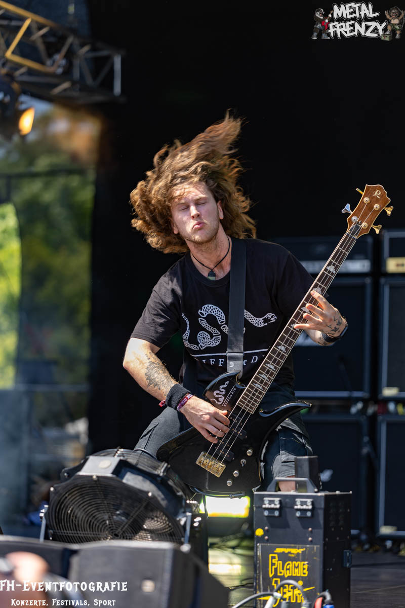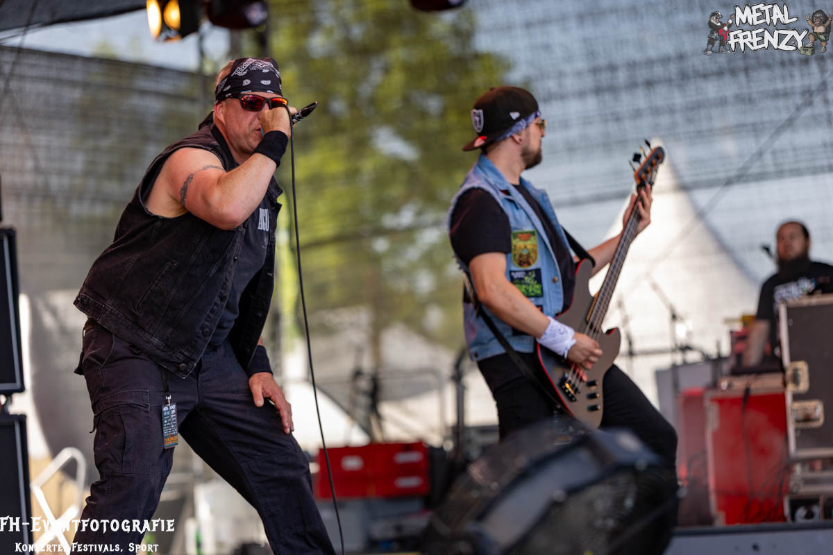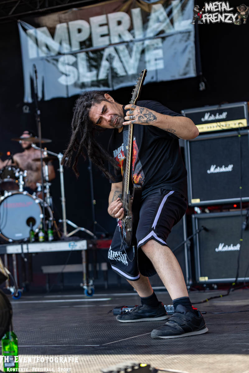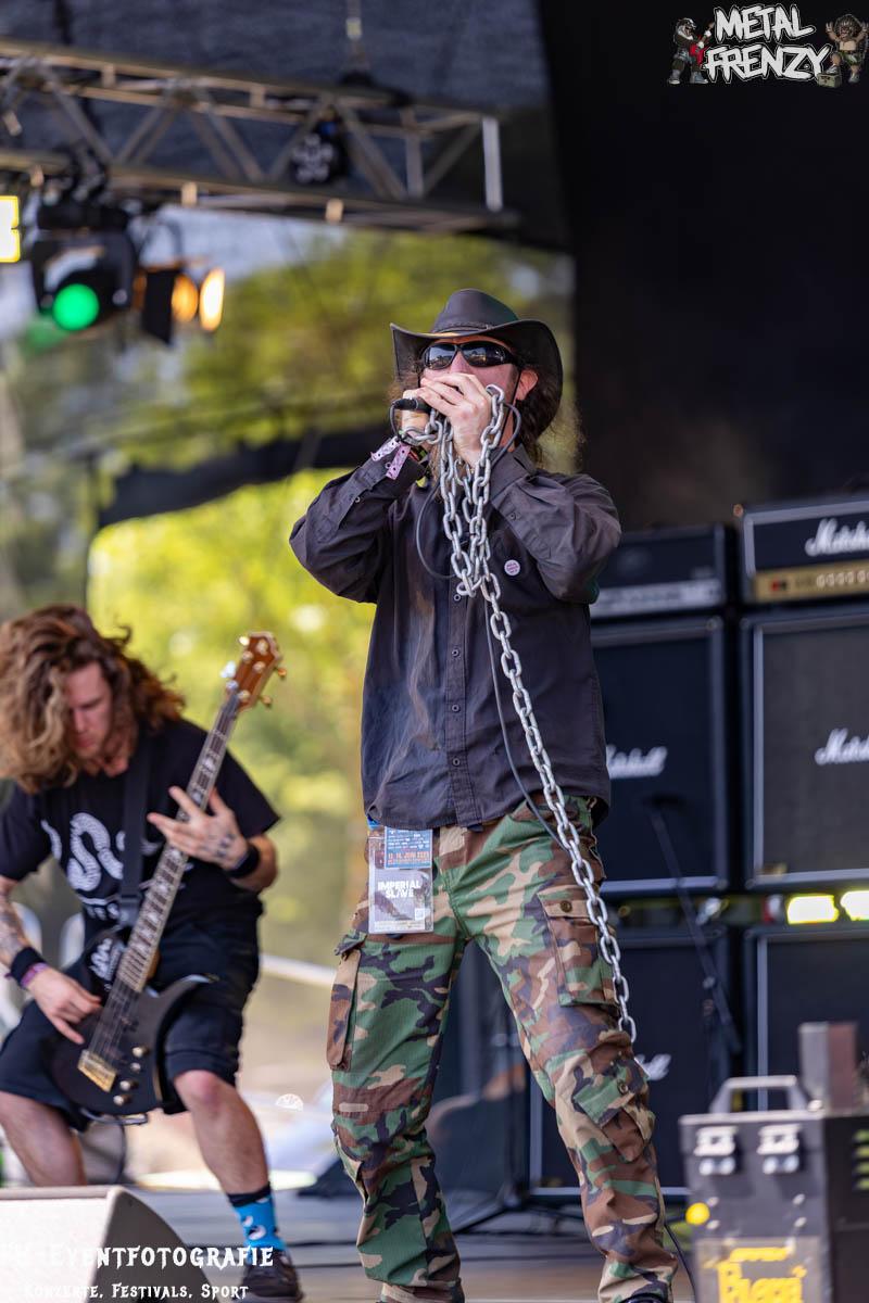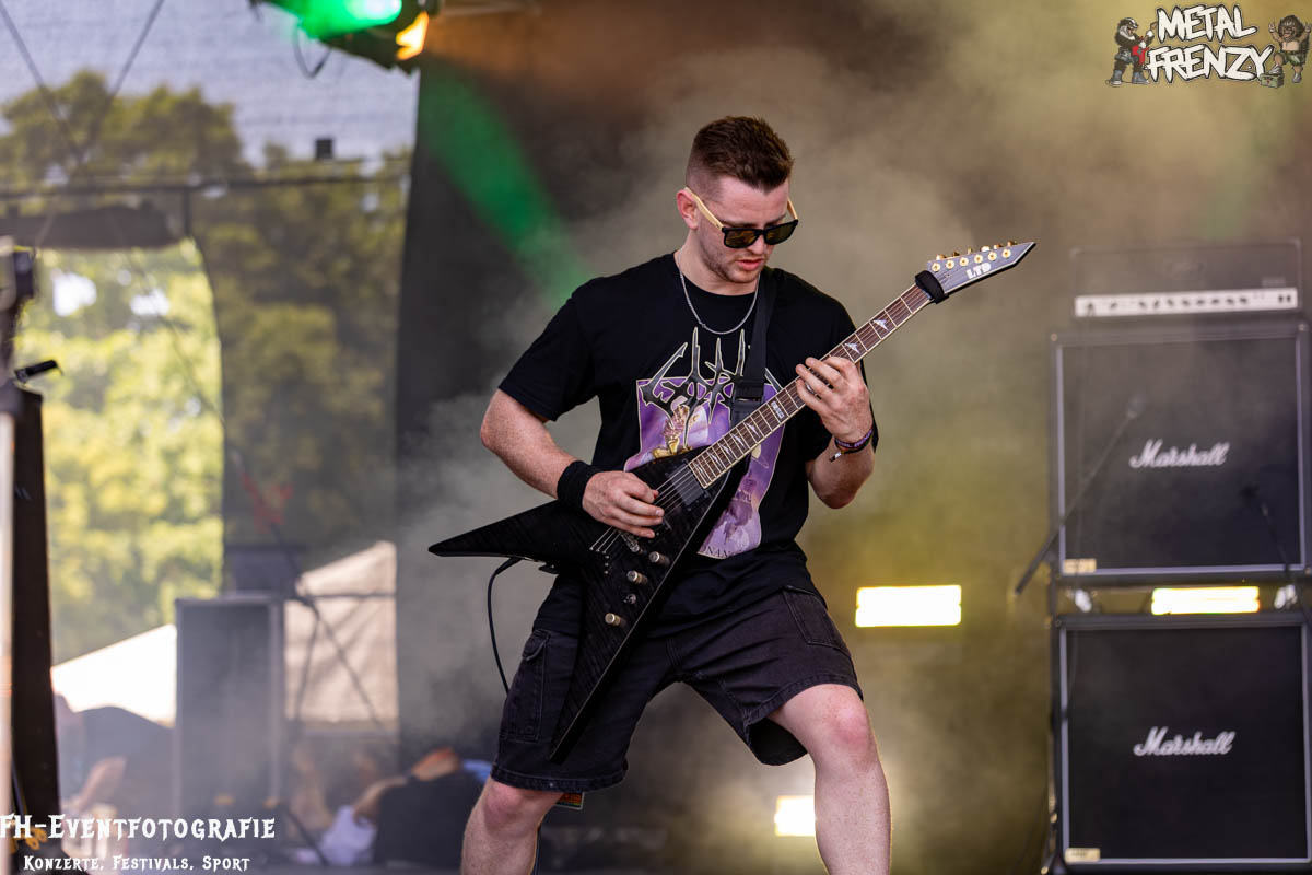 Die kommende Band hatte ganz sicher den weitesten Weg, um nach Gardelegen zu gelangen. »Imperial Slave« aus Neuseeland waren den unglaublichen Weg für beide Seiten absolut wert. Die Band hatte sichtlich Spaß und auch die, die hitzeresistent genug waren, sich in den Glutofen vor die Bühne zu wagen, hatten eine richtig geile Zeit. Die Herren von der anderen Seite der Erde haben einen einfachen, aber wunderbar druckvoll geradlinigen Sound. Da lohnt es sich, die Chance zu nutzen, die Neuseeländer mal live zu erleben. Also schaut, was geht und wo ihr sie finden könnt. Die kommenden Bands hatten deutlich mehr Menschen direkt vor der Bühne. Dank unserer beiden Aquaman Fredi und Dustin gab es Abkühlungen aus dem Wasserschlauch. Die Abkühlung war auch bitter nötig, da die Hitze ohne diese Abkühlung wirklich nur noch bedingt ertragbar war.