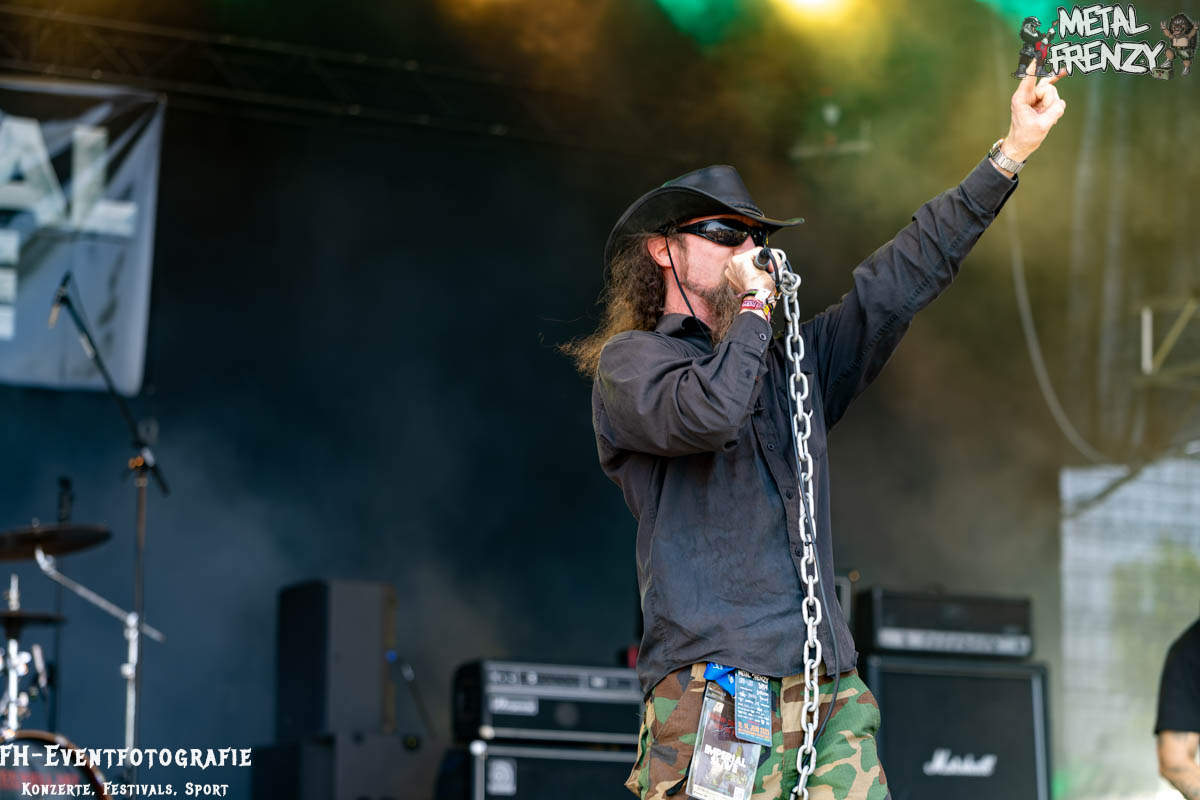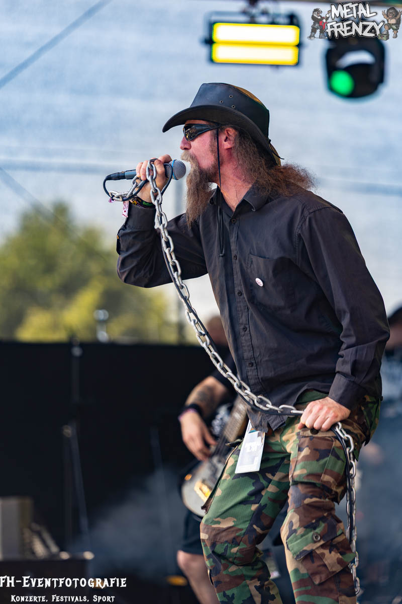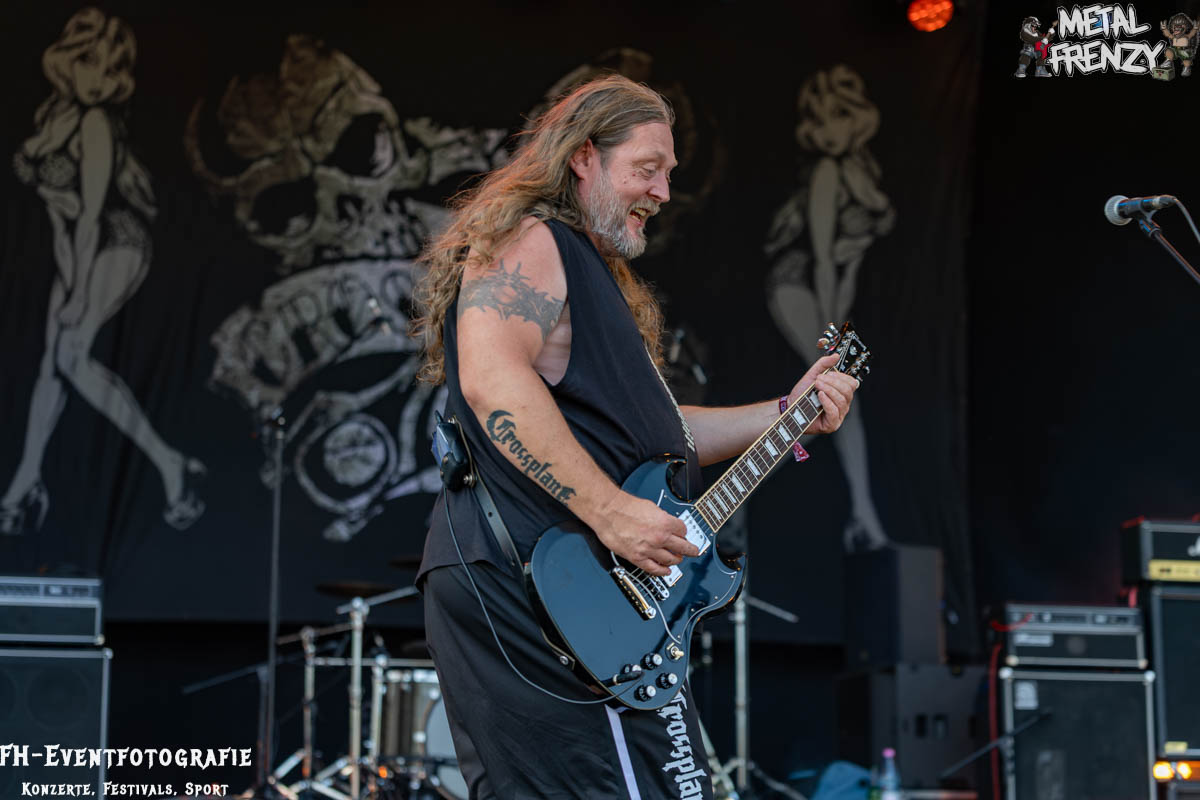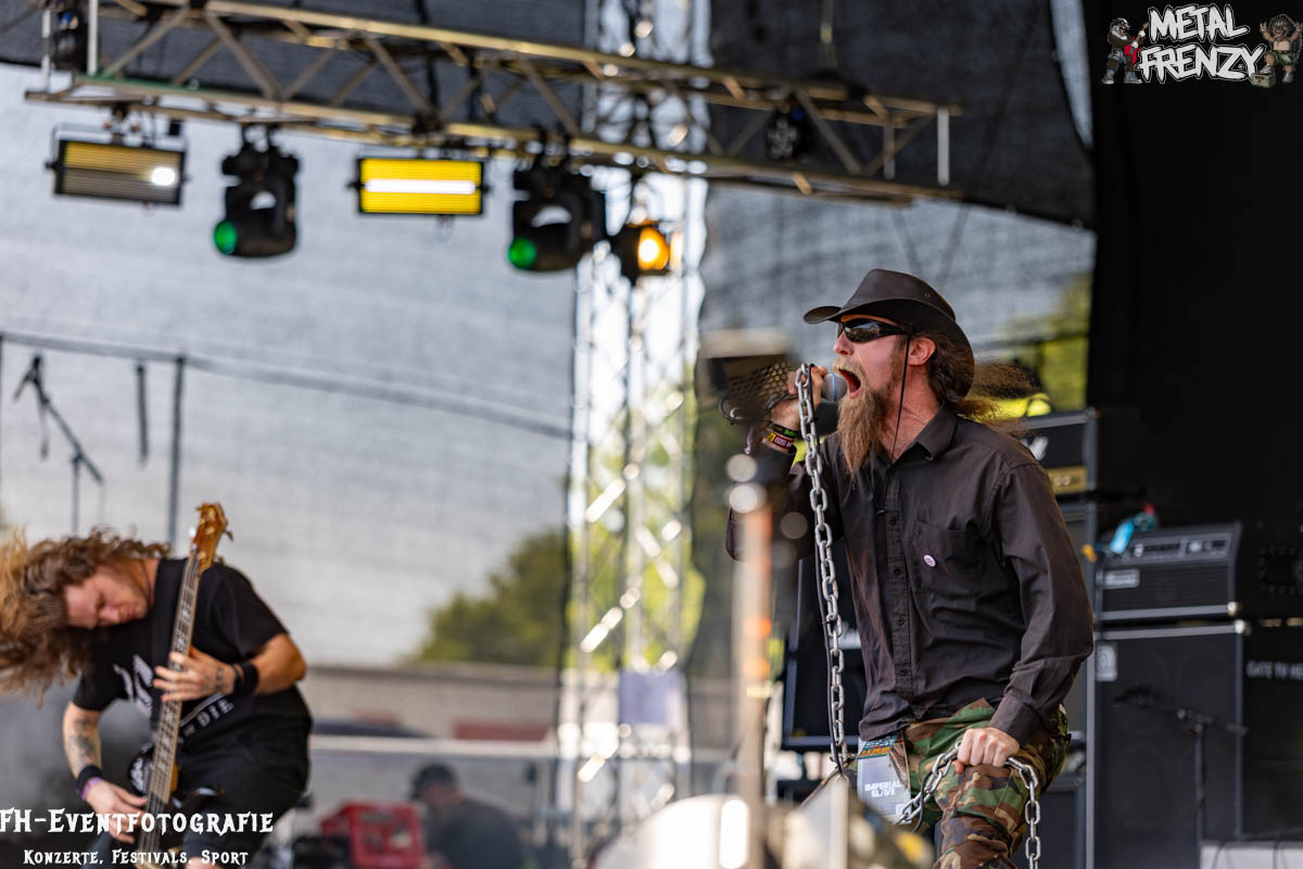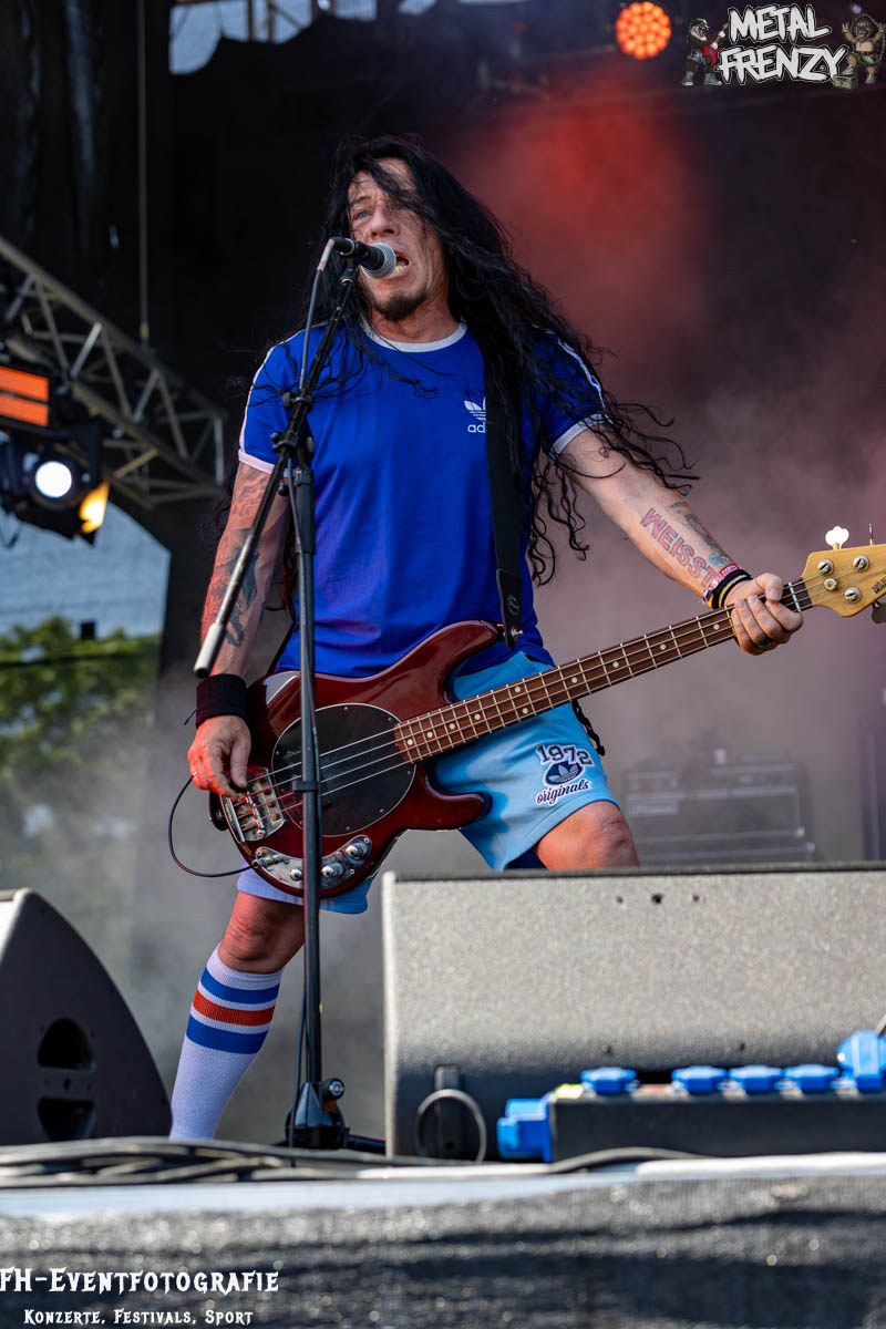 Die kommende Band hatte ganz sicher den weitesten Weg, um nach Gardelegen zu gelangen. »Imperial Slave« aus Neuseeland waren den unglaublichen Weg für beide Seiten absolut wert. Die Band hatte sichtlich Spaß und auch die, die hitzeresistent genug waren, sich in den Glutofen vor die Bühne zu wagen, hatten eine richtig geile Zeit. Die Herren von der anderen Seite der Erde haben einen einfachen, aber wunderbar druckvoll geradlinigen Sound. Da lohnt es sich, die Chance zu nutzen, die Neuseeländer mal live zu erleben. Also schaut, was geht und wo ihr sie finden könnt. Die kommenden Bands hatten deutlich mehr Menschen direkt vor der Bühne. Dank unserer beiden Aquaman Fredi und Dustin gab es Abkühlungen aus dem Wasserschlauch. Die Abkühlung war auch bitter nötig, da die Hitze ohne diese Abkühlung wirklich nur noch bedingt ertragbar war.