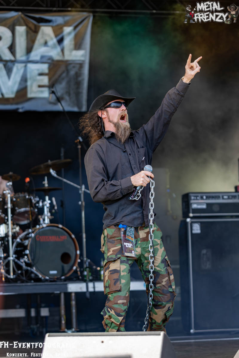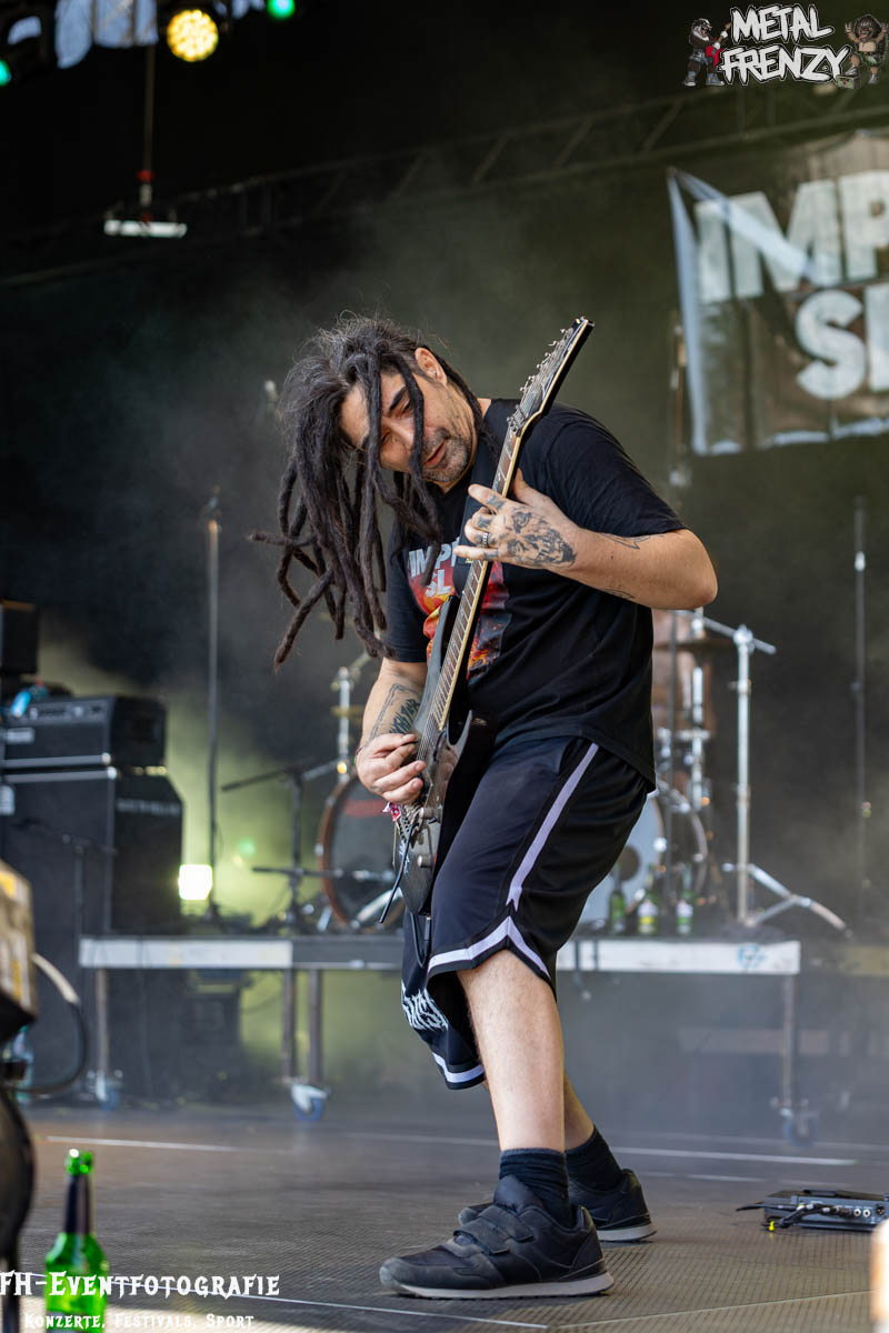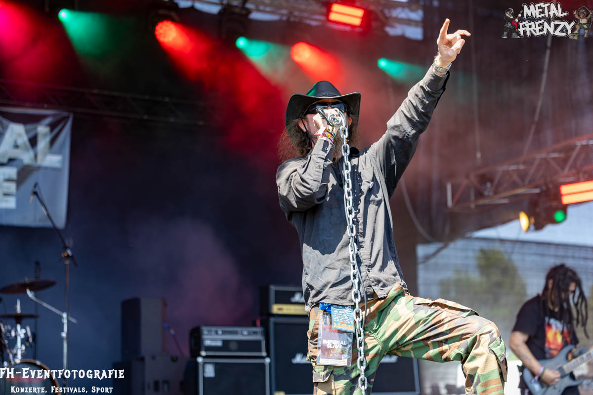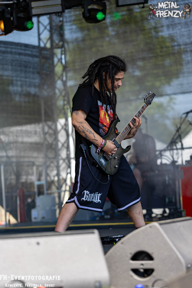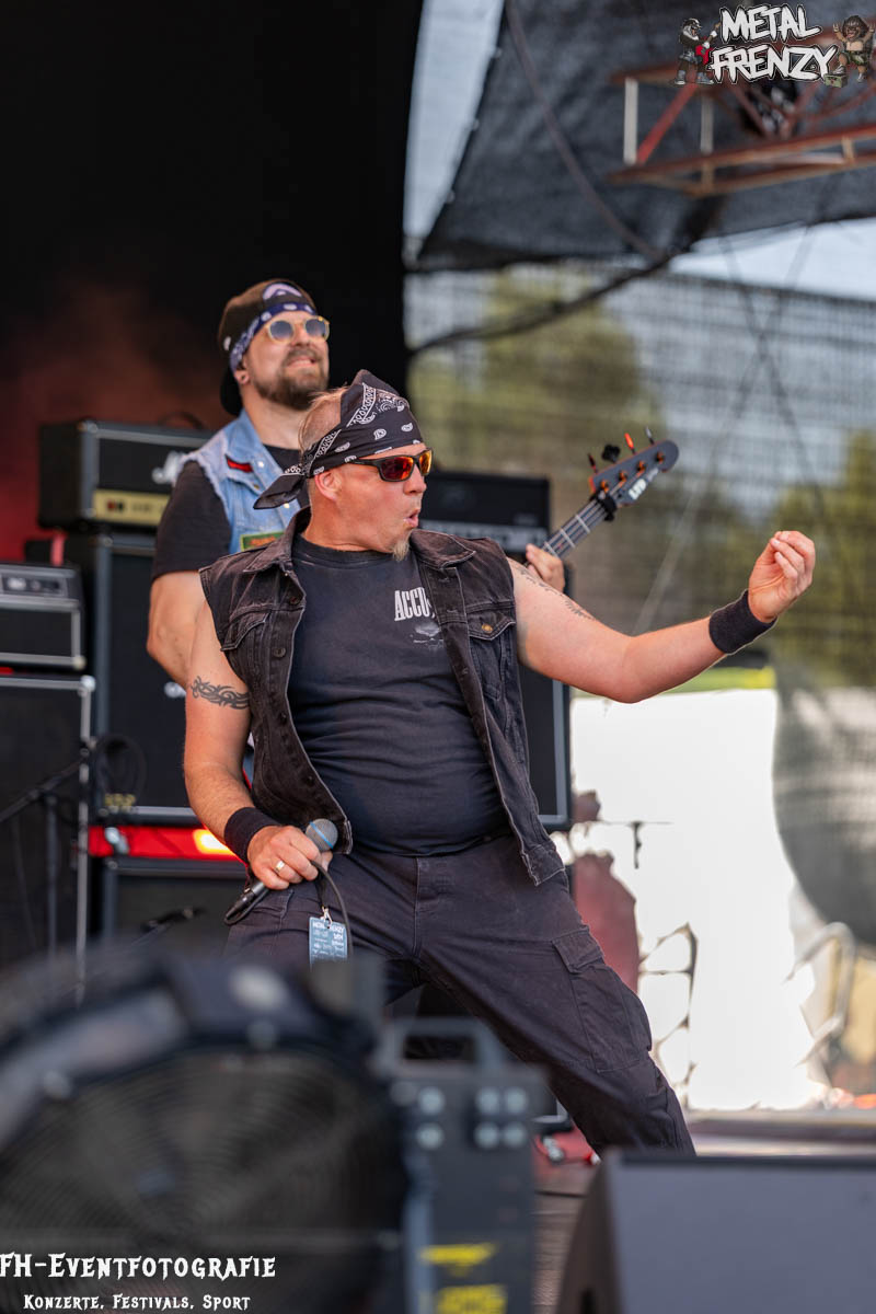 Die kommende Band hatte ganz sicher den weitesten Weg, um nach Gardelegen zu gelangen. »Imperial Slave« aus Neuseeland waren den unglaublichen Weg für beide Seiten absolut wert. Die Band hatte sichtlich Spaß und auch die, die hitzeresistent genug waren, sich in den Glutofen vor die Bühne zu wagen, hatten eine richtig geile Zeit. Die Herren von der anderen Seite der Erde haben einen einfachen, aber wunderbar druckvoll geradlinigen Sound. Da lohnt es sich, die Chance zu nutzen, die Neuseeländer mal live zu erleben. Also schaut, was geht und wo ihr sie finden könnt. Die kommenden Bands hatten deutlich mehr Menschen direkt vor der Bühne. Dank unserer beiden Aquaman Fredi und Dustin gab es Abkühlungen aus dem Wasserschlauch. Die Abkühlung war auch bitter nötig, da die Hitze ohne diese Abkühlung wirklich nur noch bedingt ertragbar war.