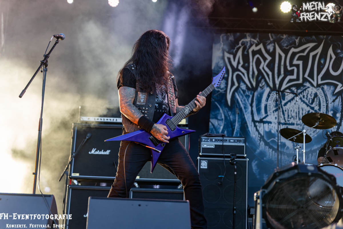 Nach diesem Auftritt kamen die wohl am besten an die Hitze gewöhnten Musiker dieses Tages. Es gab Deathmetal aus Brasilien. »Krisium« hatten die Bühne und sie nutzten sie ohne Gnade. Was ein Mörder-Sound. Laut, richtig, druckvoll und krass. Selbst hinter der Bühne war ein miteinander Reden nur bedingt möglich