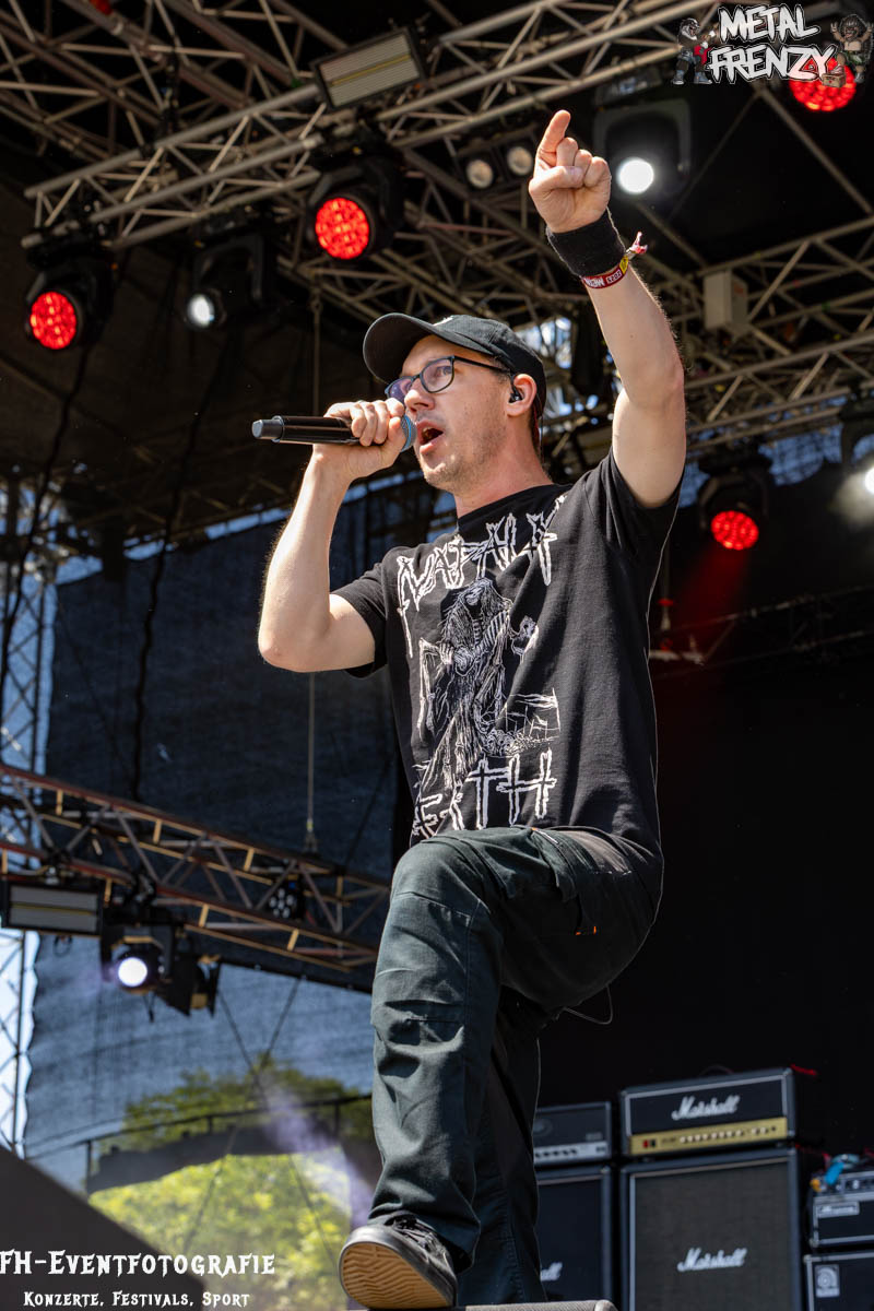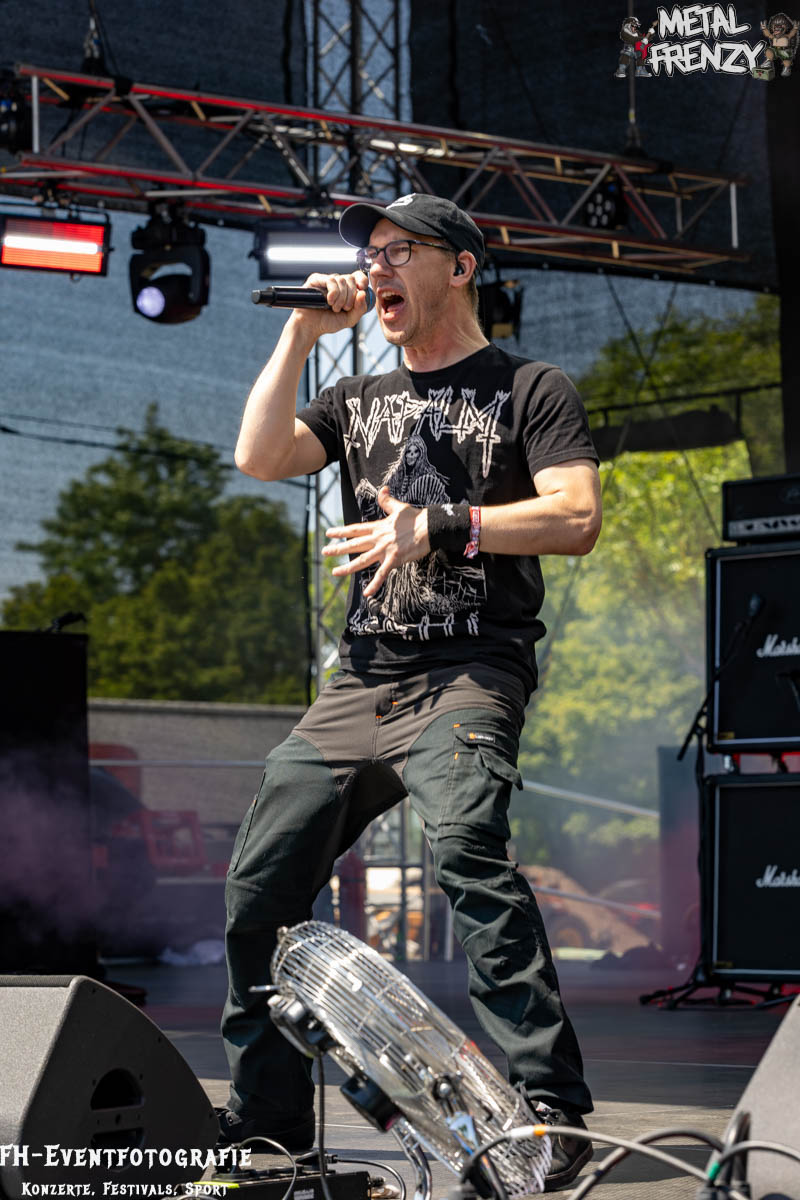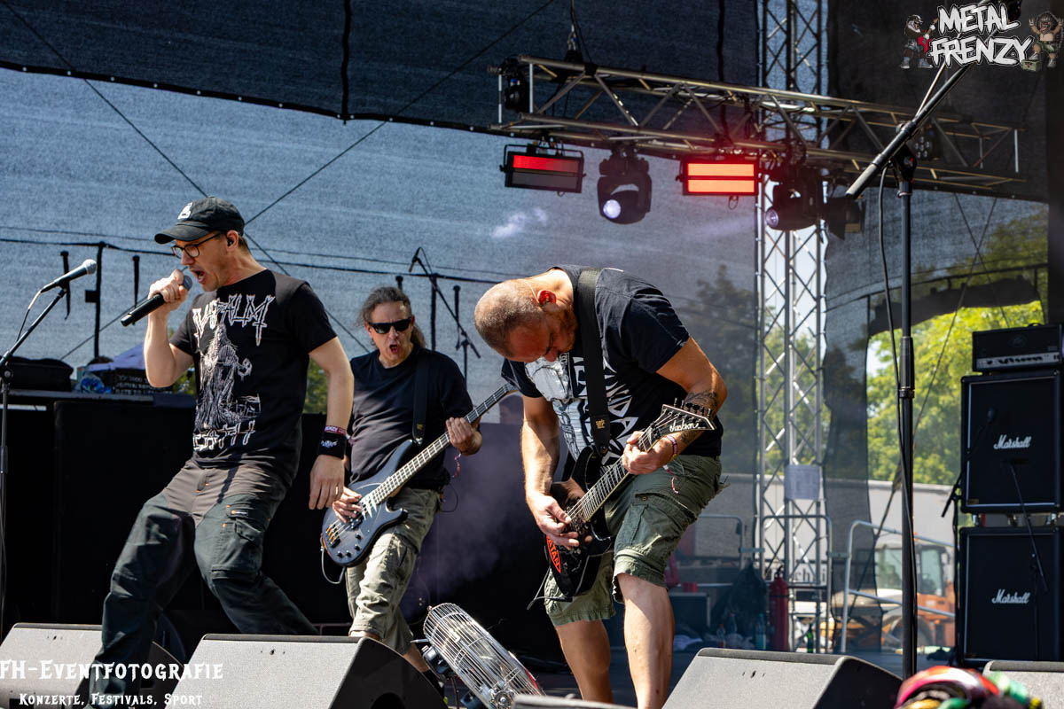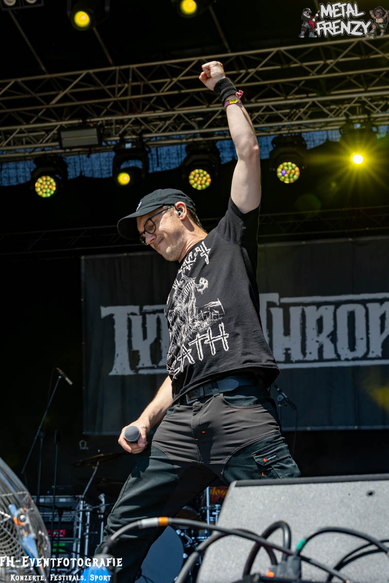 Egal, was es war, es hat sie reichlich angetrieben und so für einen richtig geilen Start in den Tag gesorgt. Der Tag war dabei von einer Hitzewelle erfasst worden, dass es als bald kaum noch ohne Schattenplatz erträglich wurde. Die kommende, sich anbahnende Hitzeschlacht wurde von »Tyranthrope« bestritten. Dank der niederländischen Verstärkung vollzählig und mit fast noch mehr Power als Band Nummer eins des Tages. Die wunderbare Mischung aus Thrashmetal und Crossover lockte die Menschen aus den Schatten.