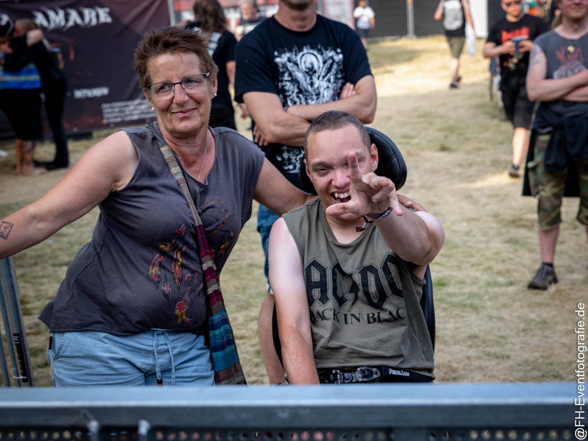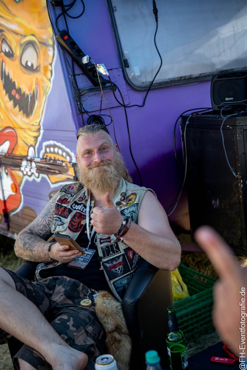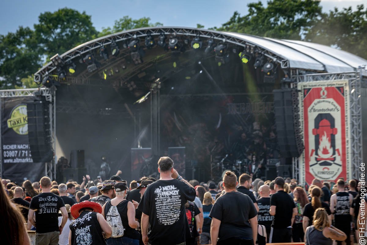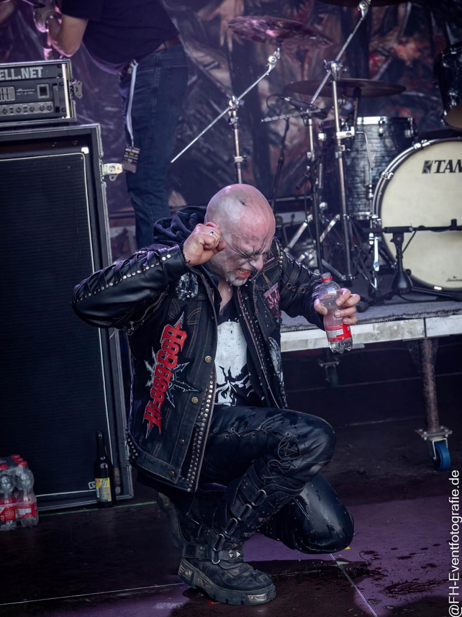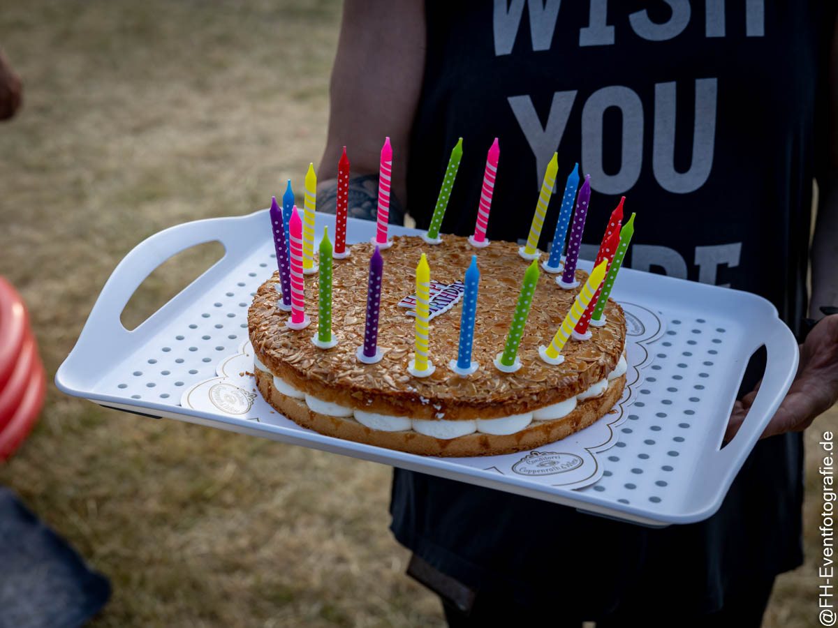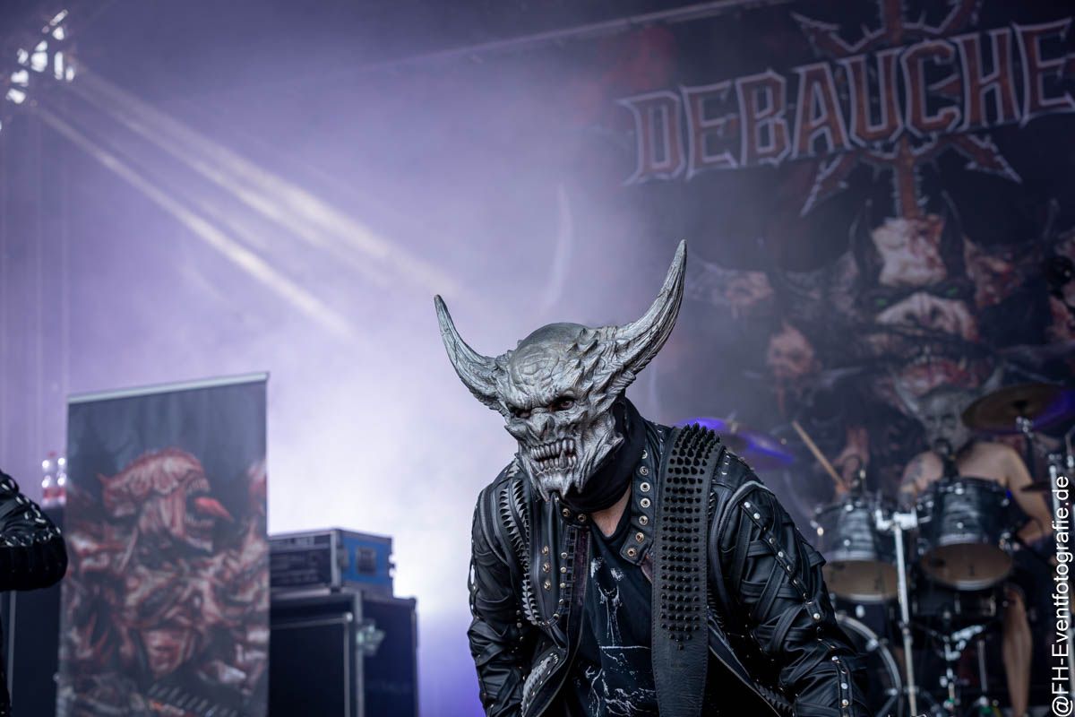 Es folgen noch vier Kracher. Als erstes kommt Death Metal aus Deutschem Lande. Debauchery, die ihr 20-jähriges Bestehen Feier, stürmen die Bühne. Ich habe selten so viele Leute mit passendem Shirt auf einem Festival gesehen. Selbst bei den Parsauern am Camp war das die Garderobe von einigen der Damen dort. Das wird ne geile Show, so hoffte ich und ich werde nicht enttäuscht. Wilde Maskerade und fetter Sound und im Anschluss gab das ganze Frenzy ein Happy Birthday zum Besten, inklusive einer Torte.