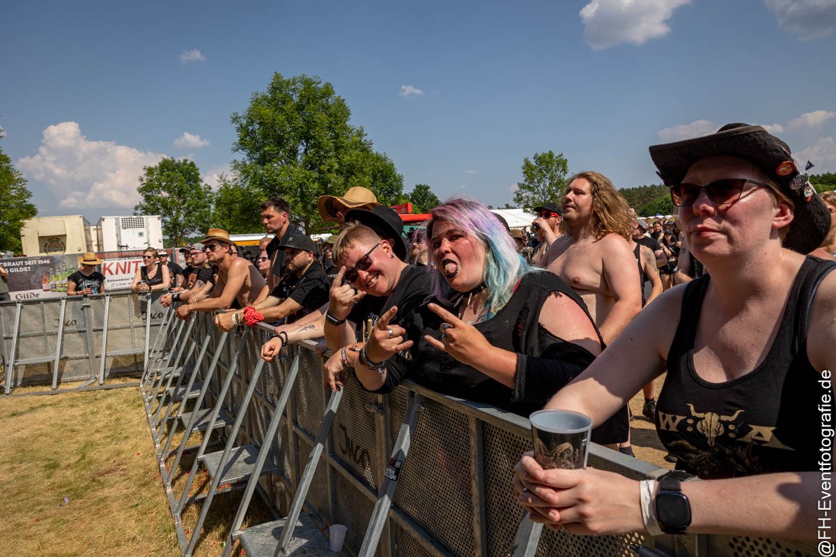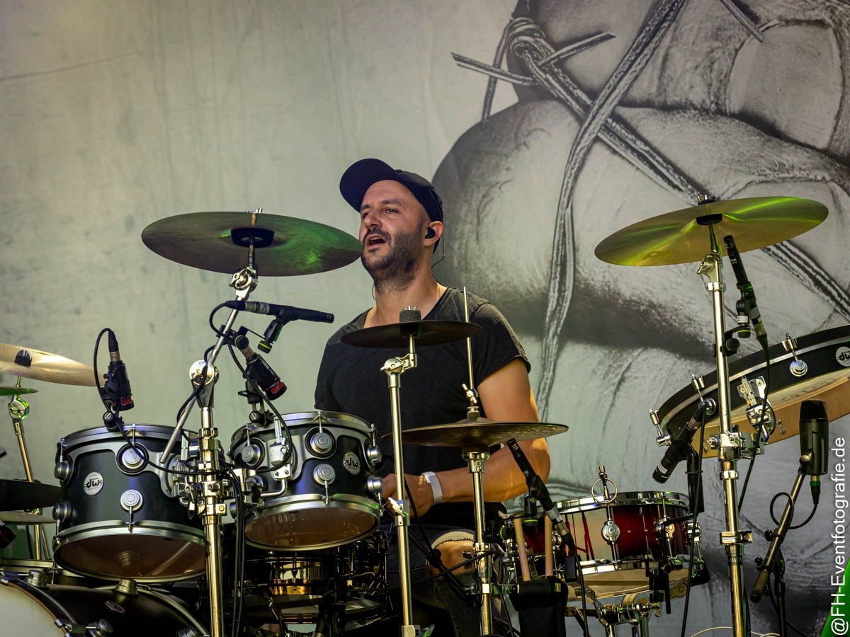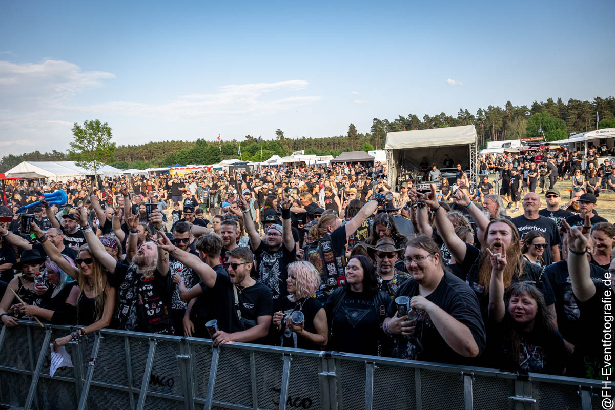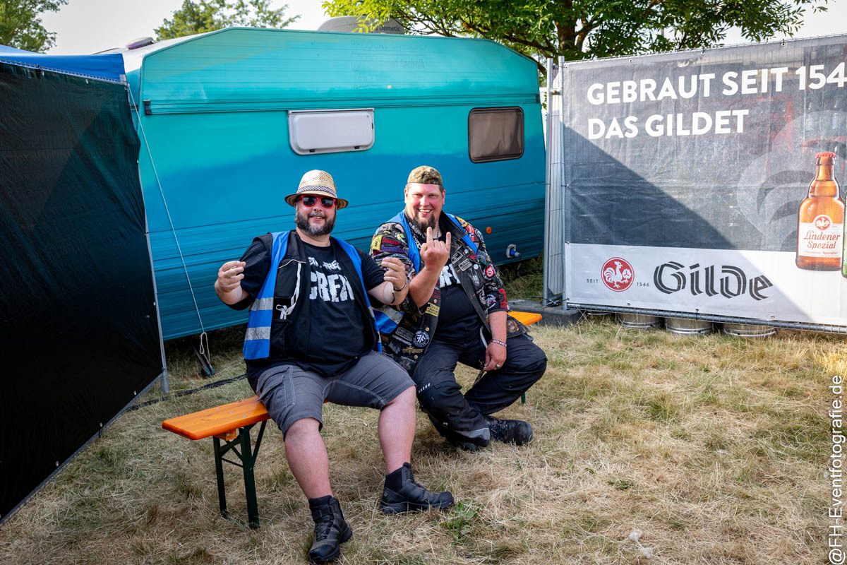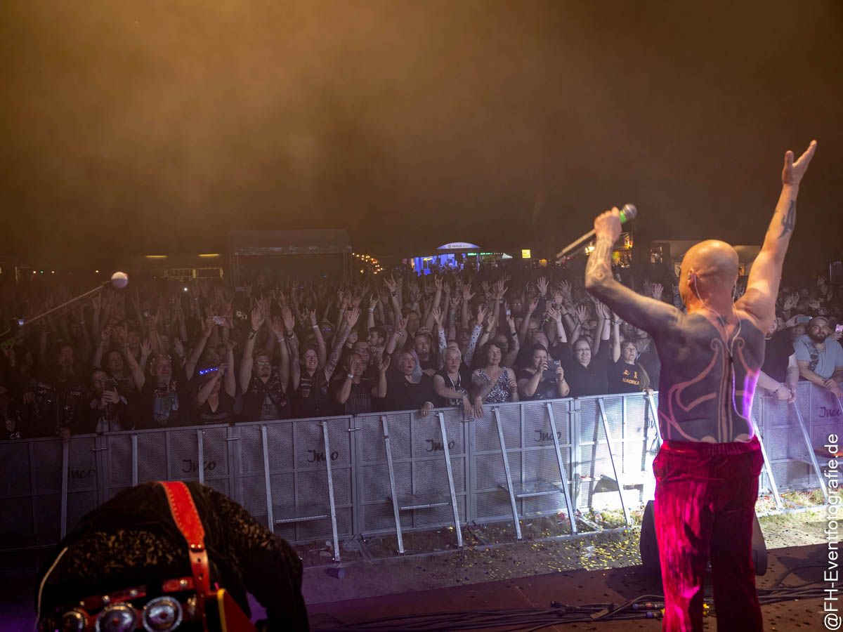 Aus der PA schallen im Wechsel melodische Klänge, dann martialischer Metal unterbrochen von Aufnahmen aus der Kaiserzeit. Ich lese mich verwirrt ob der ganzen Eindrücke erstmal schnell schlauer. Die erinnerlich ihrer konzepttreue ordentlich an Sabaton. Man möge es mir verzeihen. Aber die Jungs haben sich halt den ersten Weltkrieg als Basis ausgesucht und das mit viel Recherche und Aufwand zu ihrer Musik gemacht und ehrlich gesagt machen die da ihren Job echt gut. Die Menge an Fans sehen das sicher genauso, die trotz immer noch Monster Hitze vor die Bühne gestürmt sind und teils echt ausgelassen pogen.