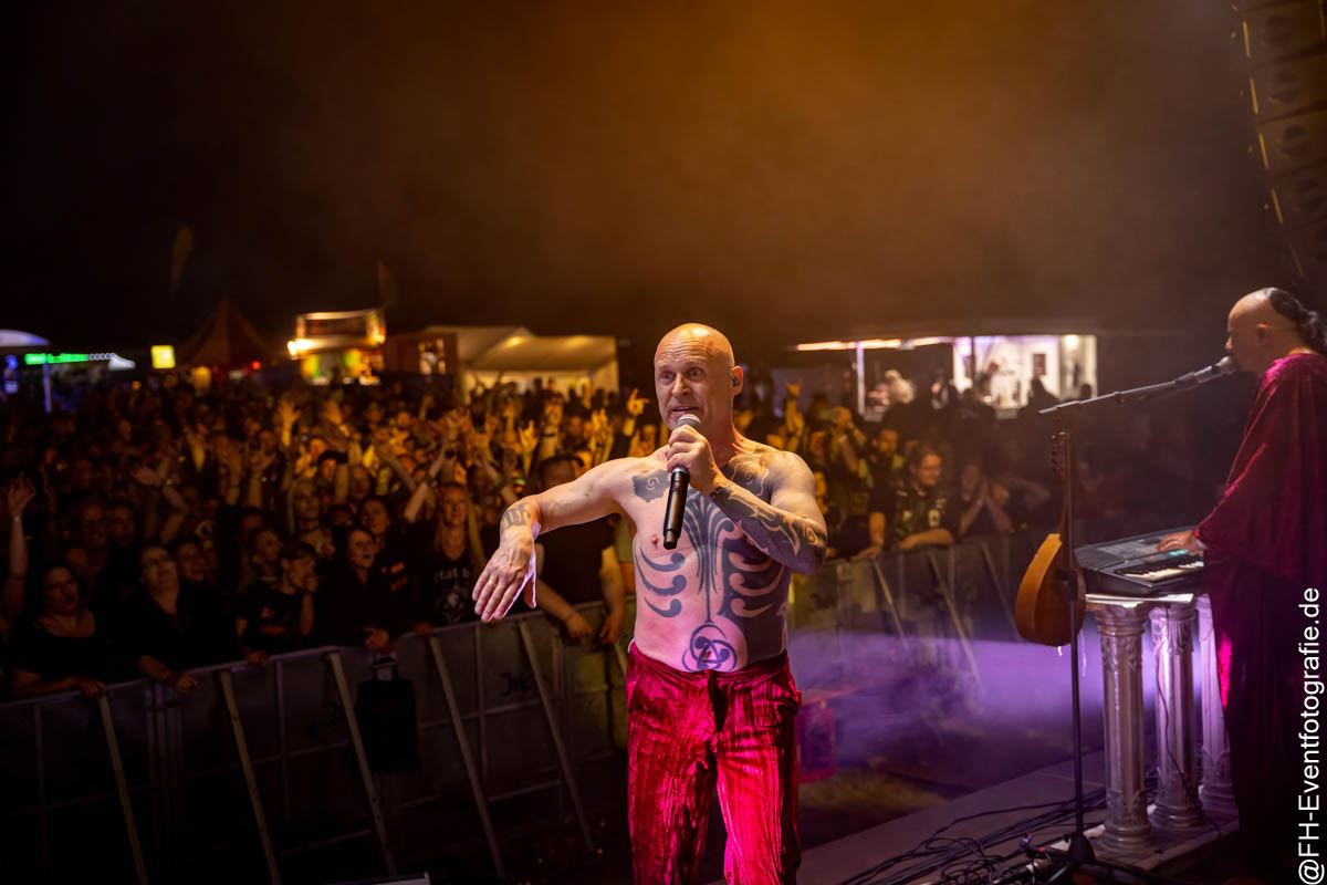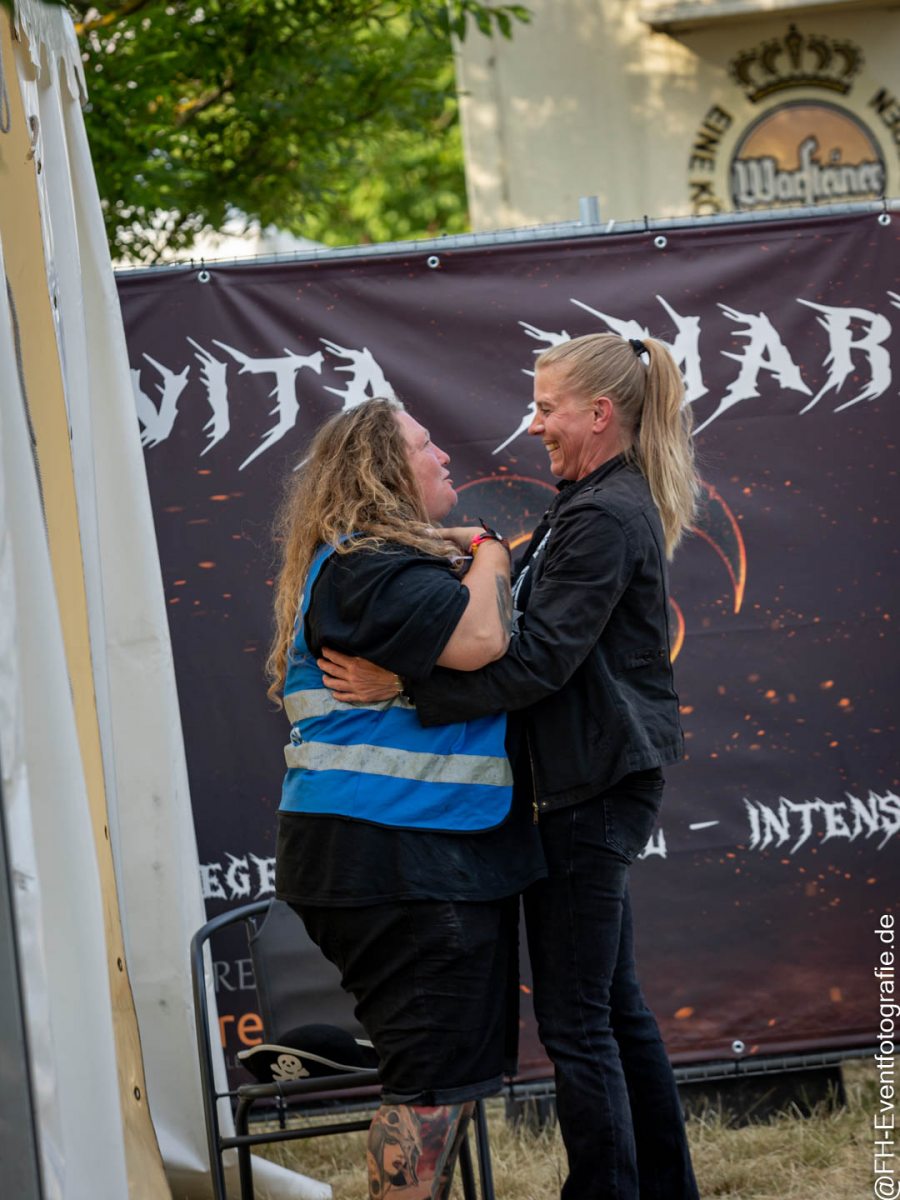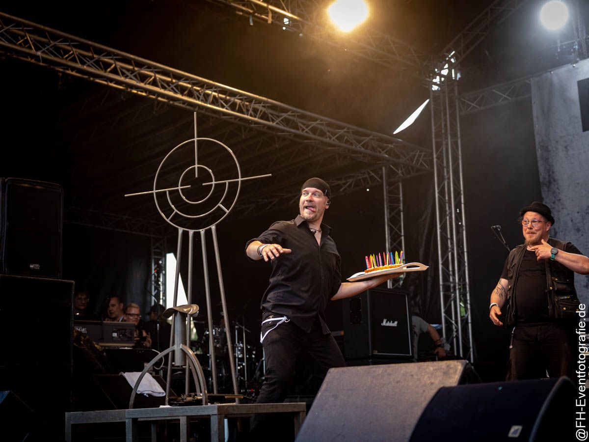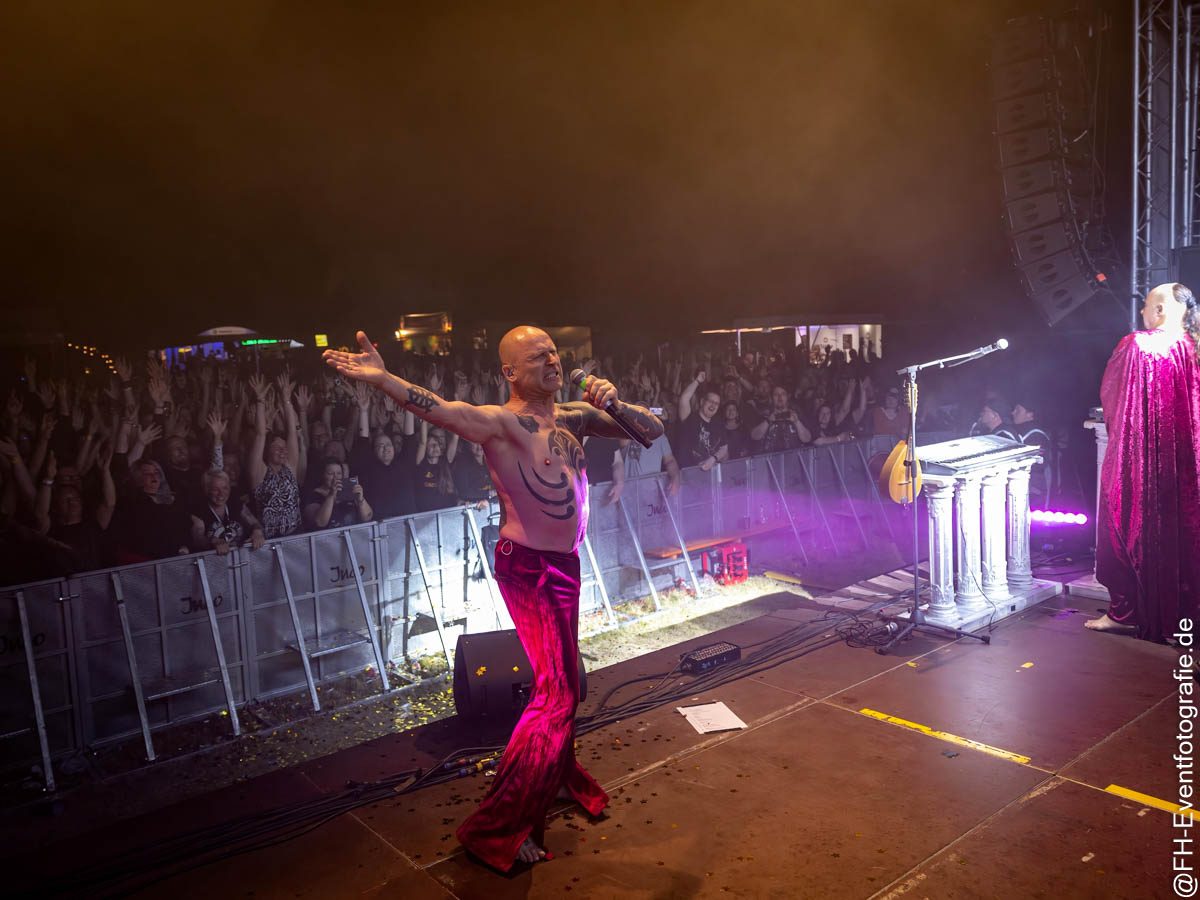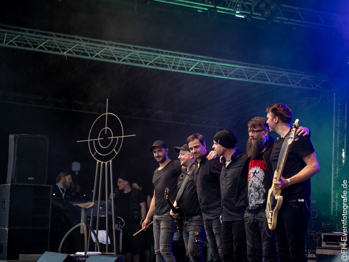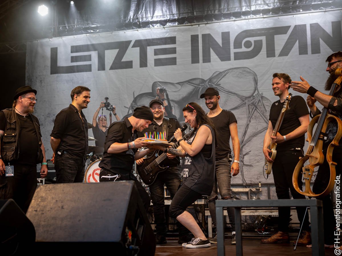 Dieselbe Zeremonie durfte im Anschluss auch die Letzte Instanz erleben. Diese feierten allerdings ihren 25ten Geburtstag. Es war auch diesmal ein toller Break im Frenzy Programm, diese Altmeister des Dark und Violinen Rock zu buchen. Die Letzte Instanz ist und bleibt einfach eine Instanz. Als ich den Herrn Sänger dieser fantastischen Combo später zufällig auf dem Infield traf könnte ich mir ein Hallo und ein kurzes Gespräch einfach nicht verkneifen. Es gibt auch was, was Hoffnung macht. Auf die Frage, ob es als bald die alten Alben auf Vinyl geben könnte, kam ein ja die Bandmitglieder sind fast alle überzeugt. Basisdemokratie ist halt manchmal ein weiter weg, aber es gibt Hoffnung, zumindest eine kleine. Ich für meinen Teil würde sofort zuschlagen.