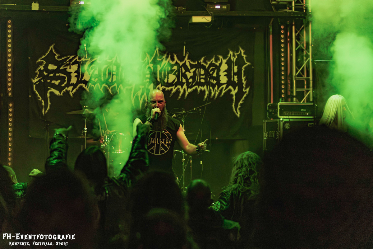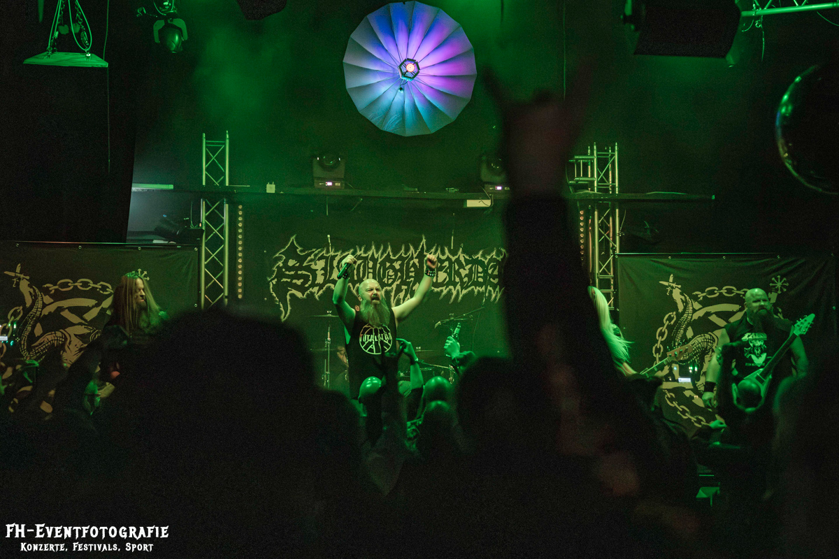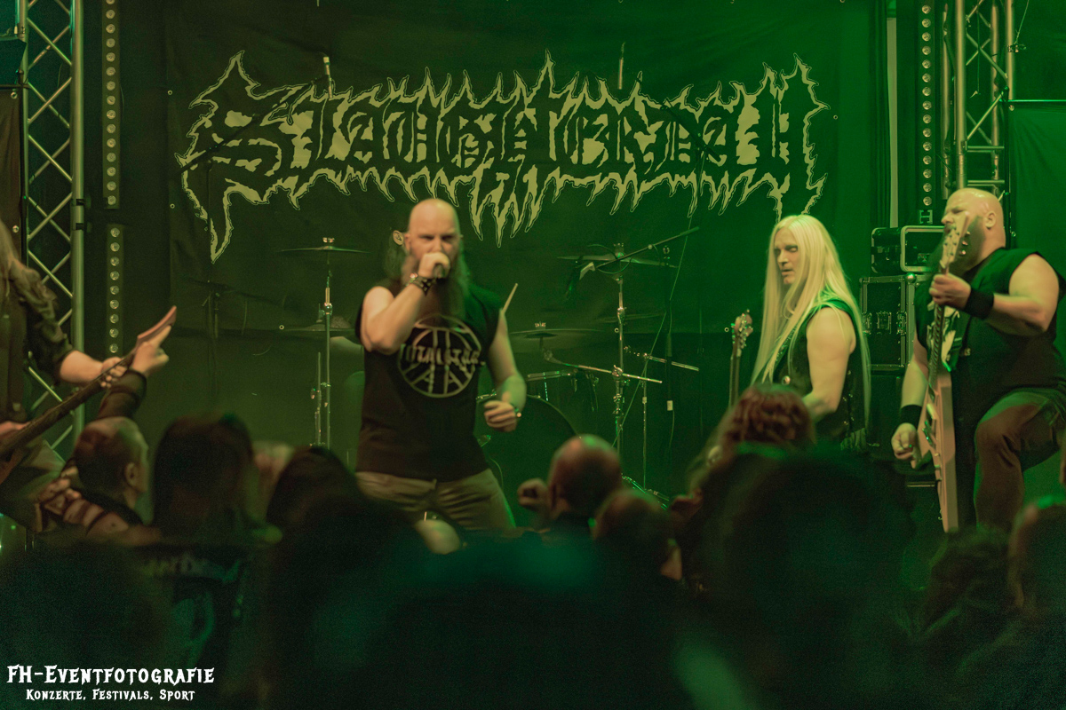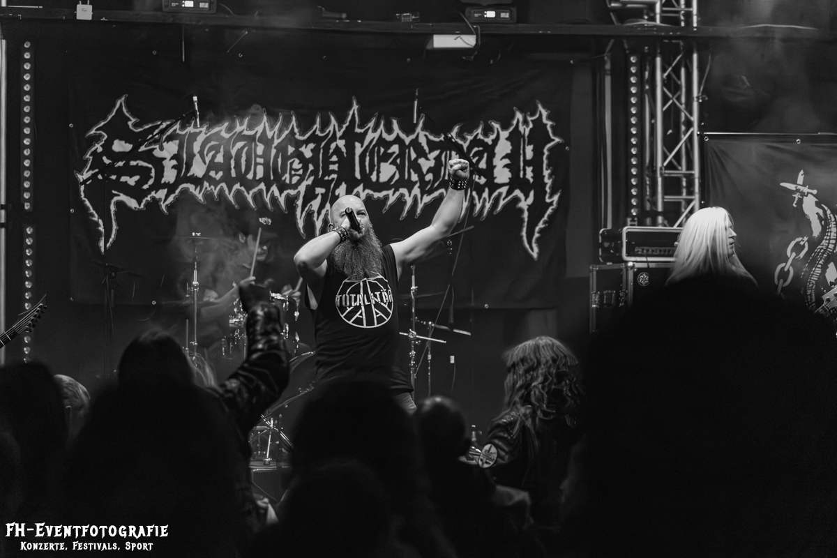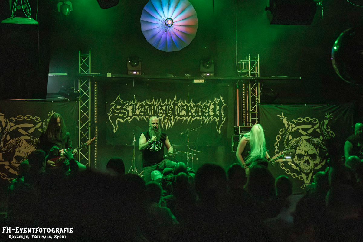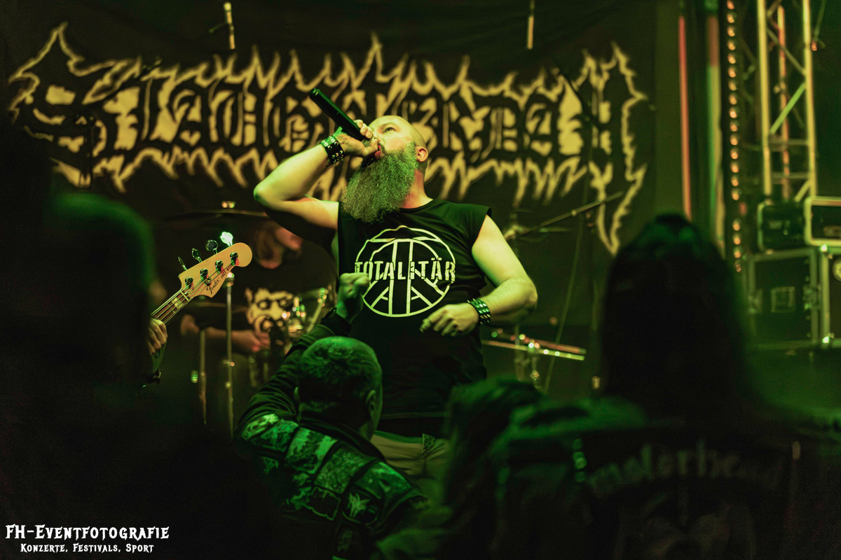 Die Dunkelheit des Morgens, zumindest unter der Woche, ist das Einreihen in den Wahnsinn namens Berufsverkehr. Man kann ihm nur leider nicht entgehen, außen man nutzt sehr unchristliche Zeiten. Übertragen wir das wieder und die unchristlichen Zeiten werden zu äußerst reduzierter Bühnenbeleuchtung mit ein klein wenig Nebel. Dazu das Dekonstruieren der Realität in die brutale Realität und Gore, fertig ist der Hauptakt des Abends. Als Headliner hatten sich die Beteiligten auf das Freilassen von »Slaughterday« geeinigt. Man war das düster, aber, ich glaube nach dem zweiten Song, war das wohl selbst einem der Bandmitglieder zu düster. Mit »wir brauchen doch etwas mehr Licht, ich sehe meine Finger fast nicht…« wurde die Bühne dann doch ein klein wenig aus den Schatten gerissen.