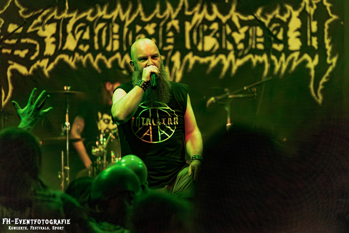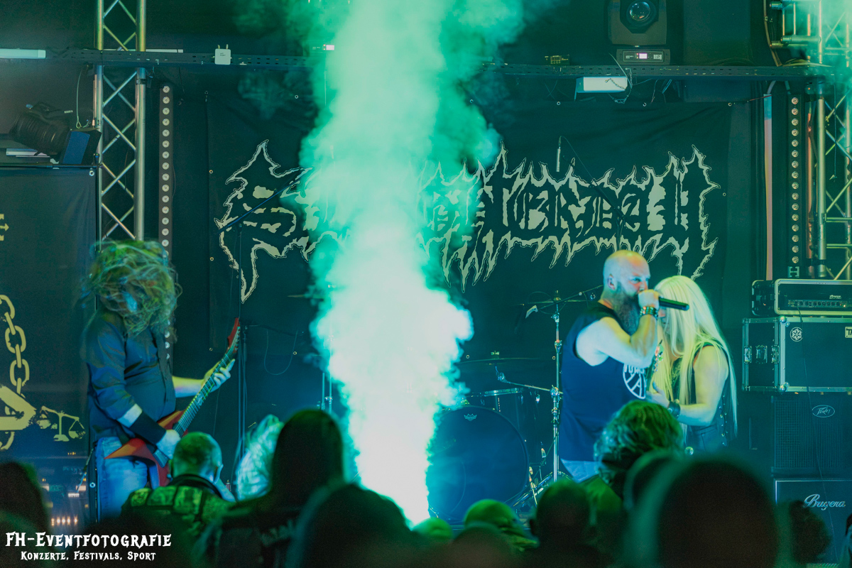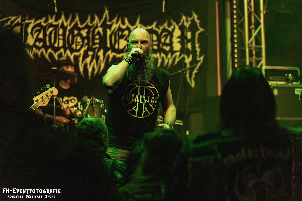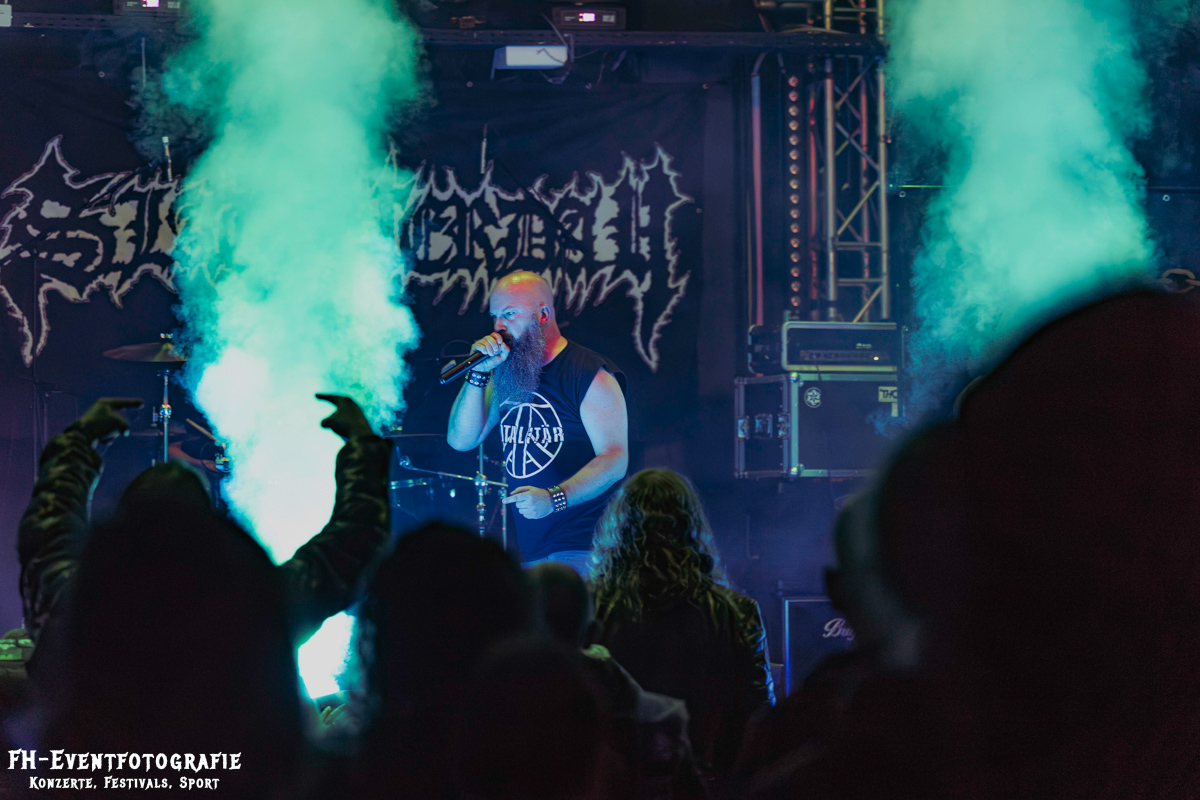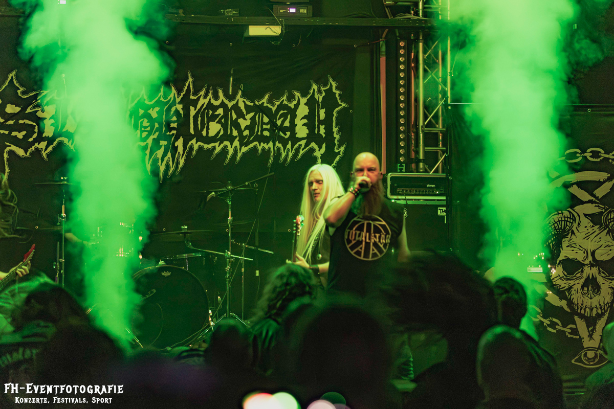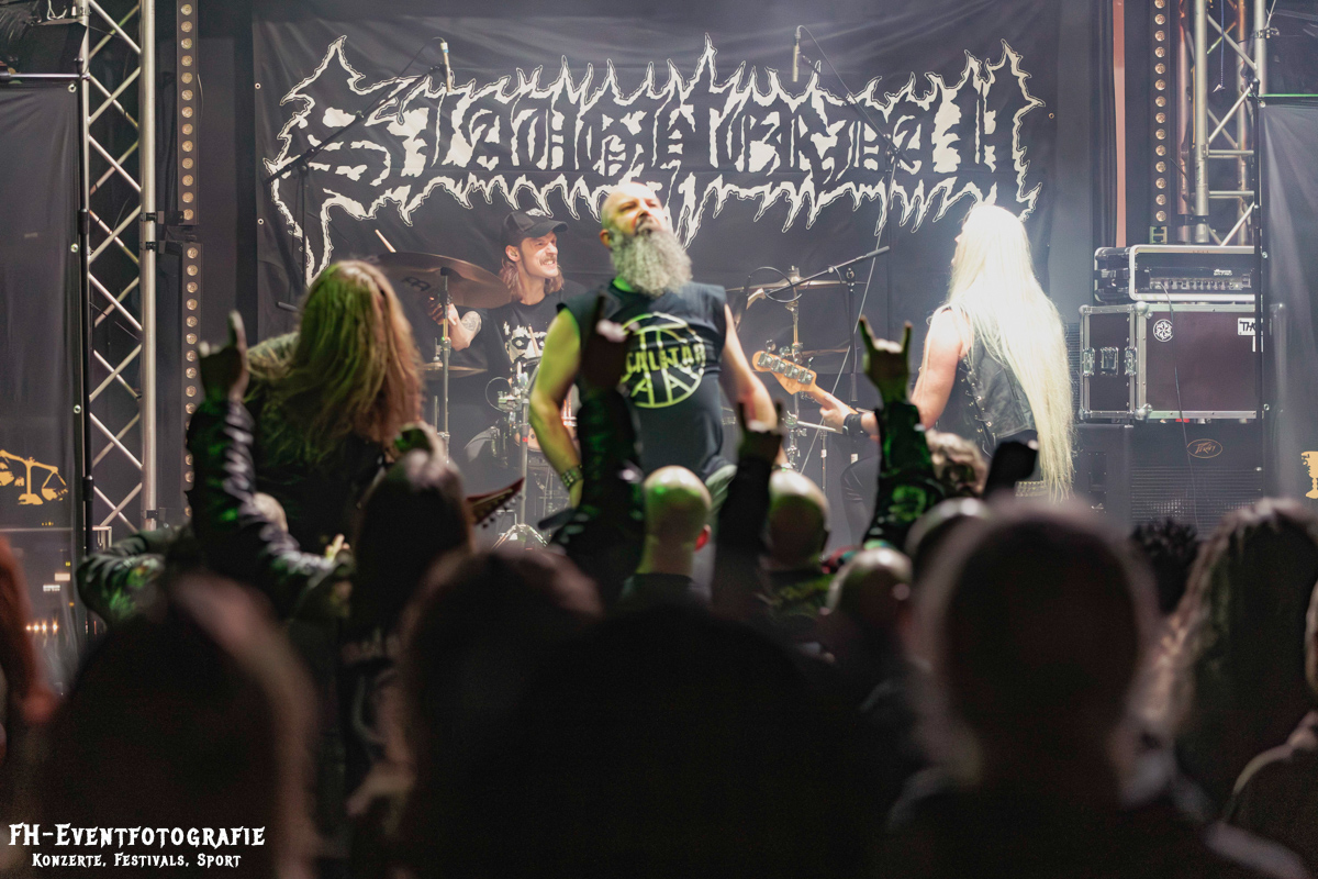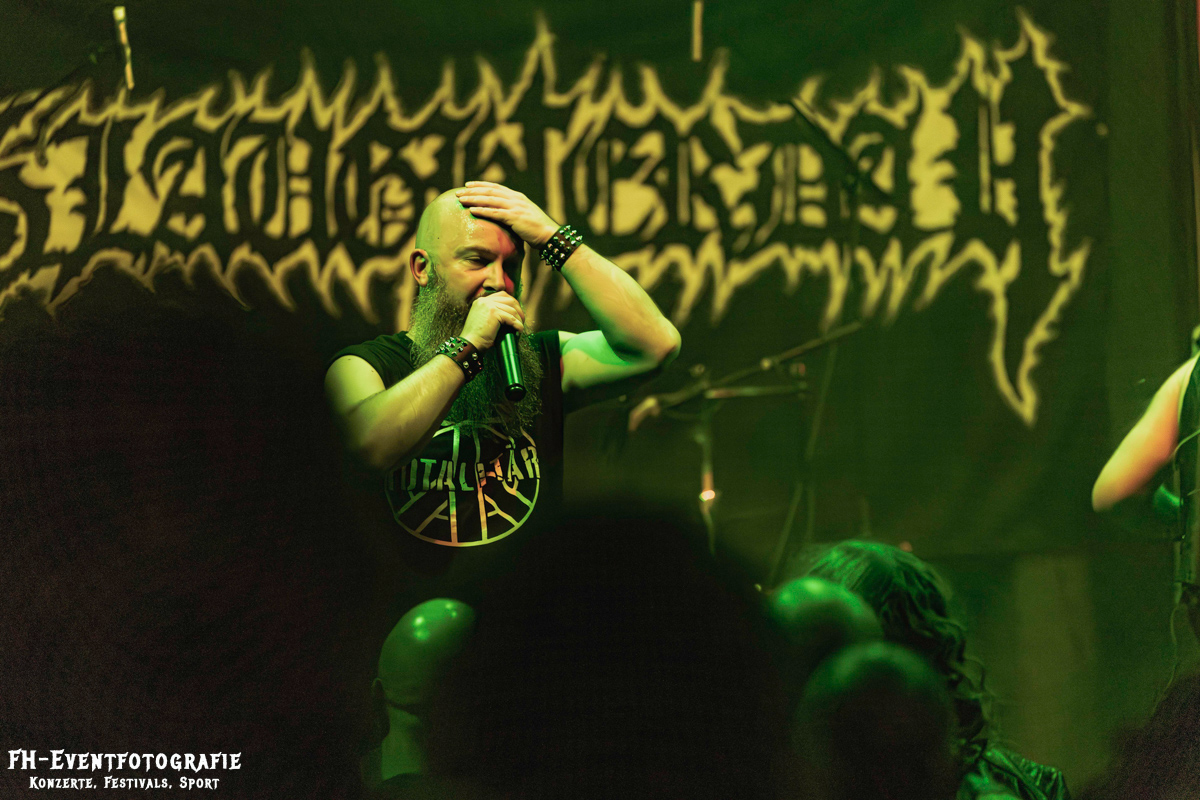 Die Dunkelheit des Morgens, zumindest unter der Woche, ist das Einreihen in den Wahnsinn namens Berufsverkehr. Man kann ihm nur leider nicht entgehen, außen man nutzt sehr unchristliche Zeiten. Übertragen wir das wieder und die unchristlichen Zeiten werden zu äußerst reduzierter Bühnenbeleuchtung mit ein klein wenig Nebel. Dazu das Dekonstruieren der Realität in die brutale Realität und Gore, fertig ist der Hauptakt des Abends. Als Headliner hatten sich die Beteiligten auf das Freilassen von »Slaughterday« geeinigt. Man war das düster, aber, ich glaube nach dem zweiten Song, war das wohl selbst einem der Bandmitglieder zu düster. Mit »wir brauchen doch etwas mehr Licht, ich sehe meine Finger fast nicht…« wurde die Bühne dann doch ein klein wenig aus den Schatten gerissen.