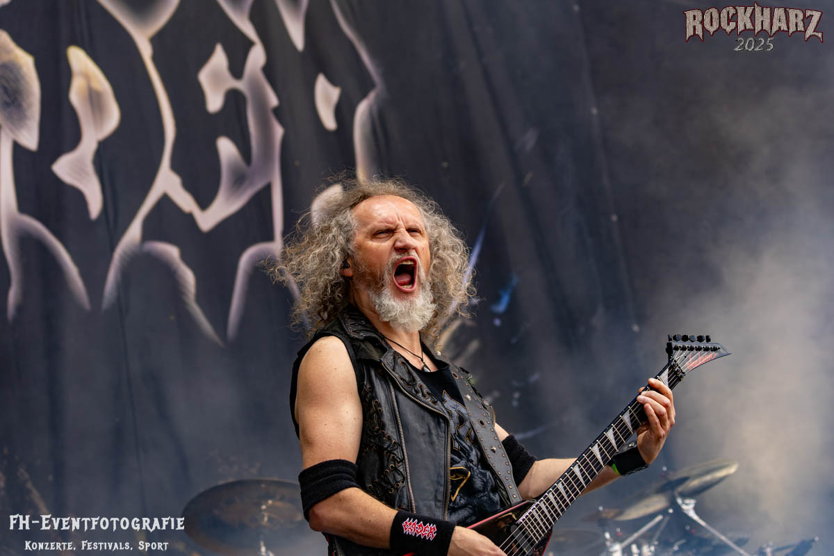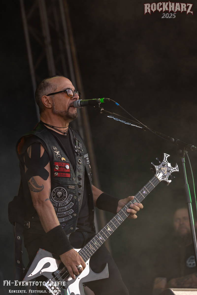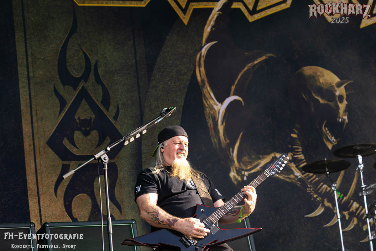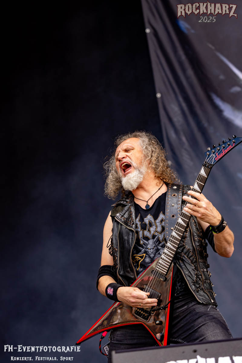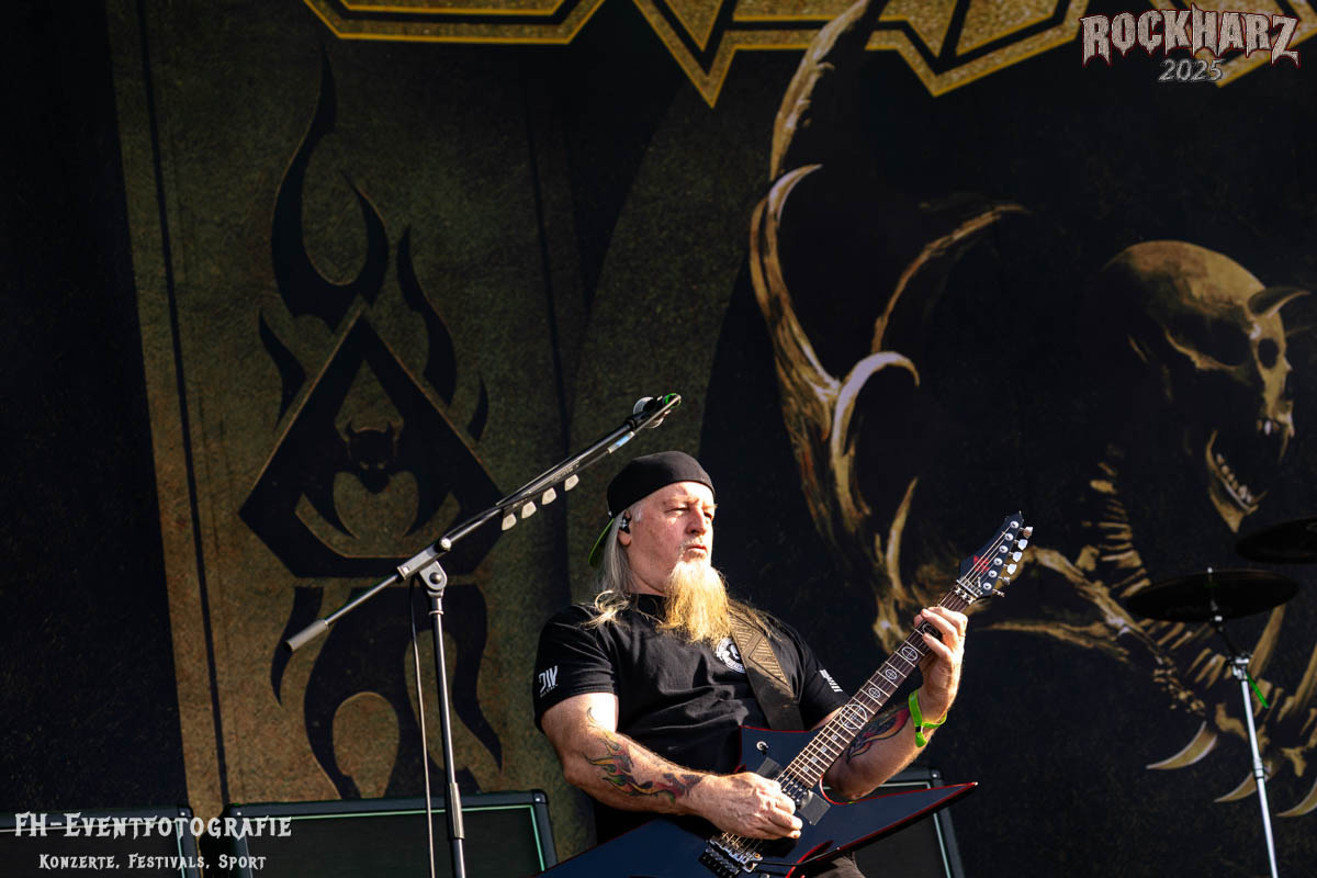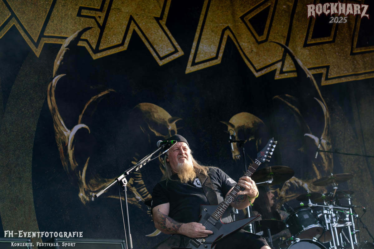 Band Nummer drei ist Overkill. Im Tageskalender die 11. Band des Tages. Mit 45 Jahren Bühnenerfahrung stehen die New Yorker schon als Band auf der Bühne. Deren Thrash Metal ist so stabil und gut, dass sie einfach wenig bis gar nichts falsch machen können. Und das haben sie auf dem RHZ 2025 wirklich und solide bewiesen. Ich habe dieses Konzert zum Kaffee und Quark beschaffen und genutzt. Der Quark war eine Empfehlung einer lieben Kollegin und der Kaffee ist auf dem RHZ immer richtig gut. Also was Leckeres zu essen und zu trinken und dazu geile Musik.