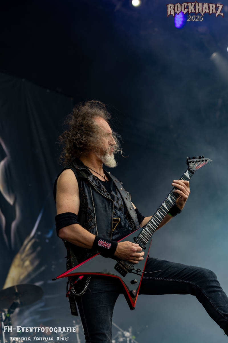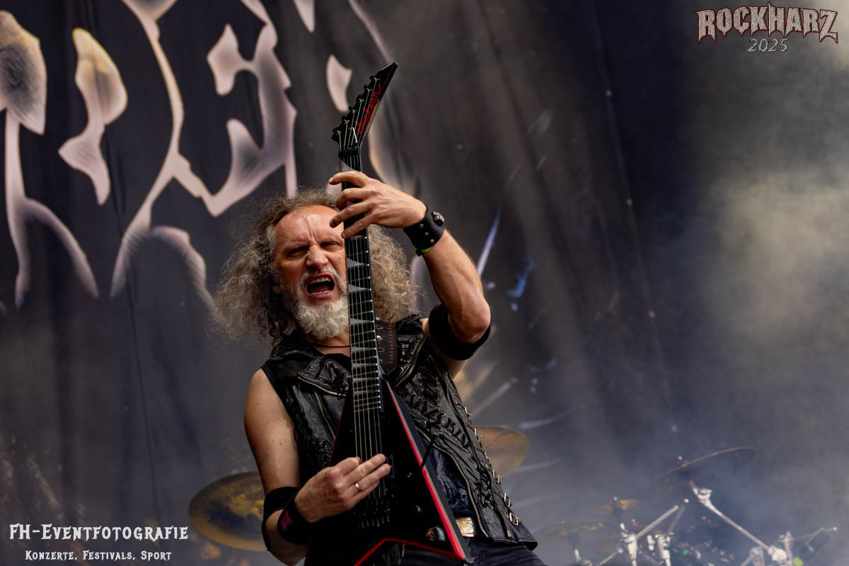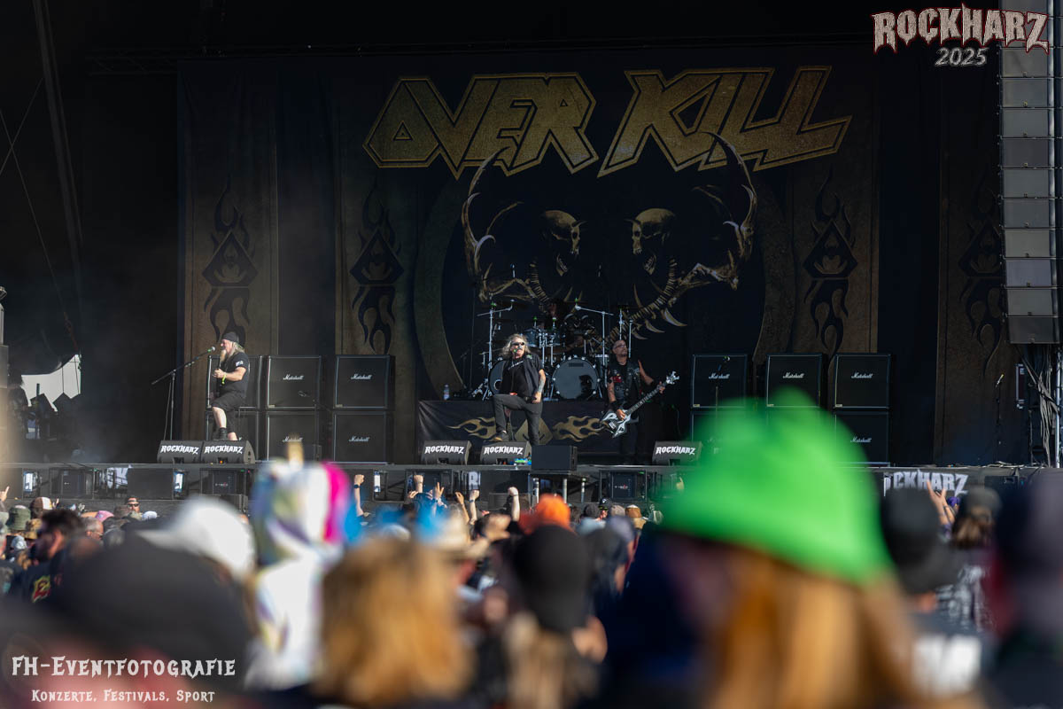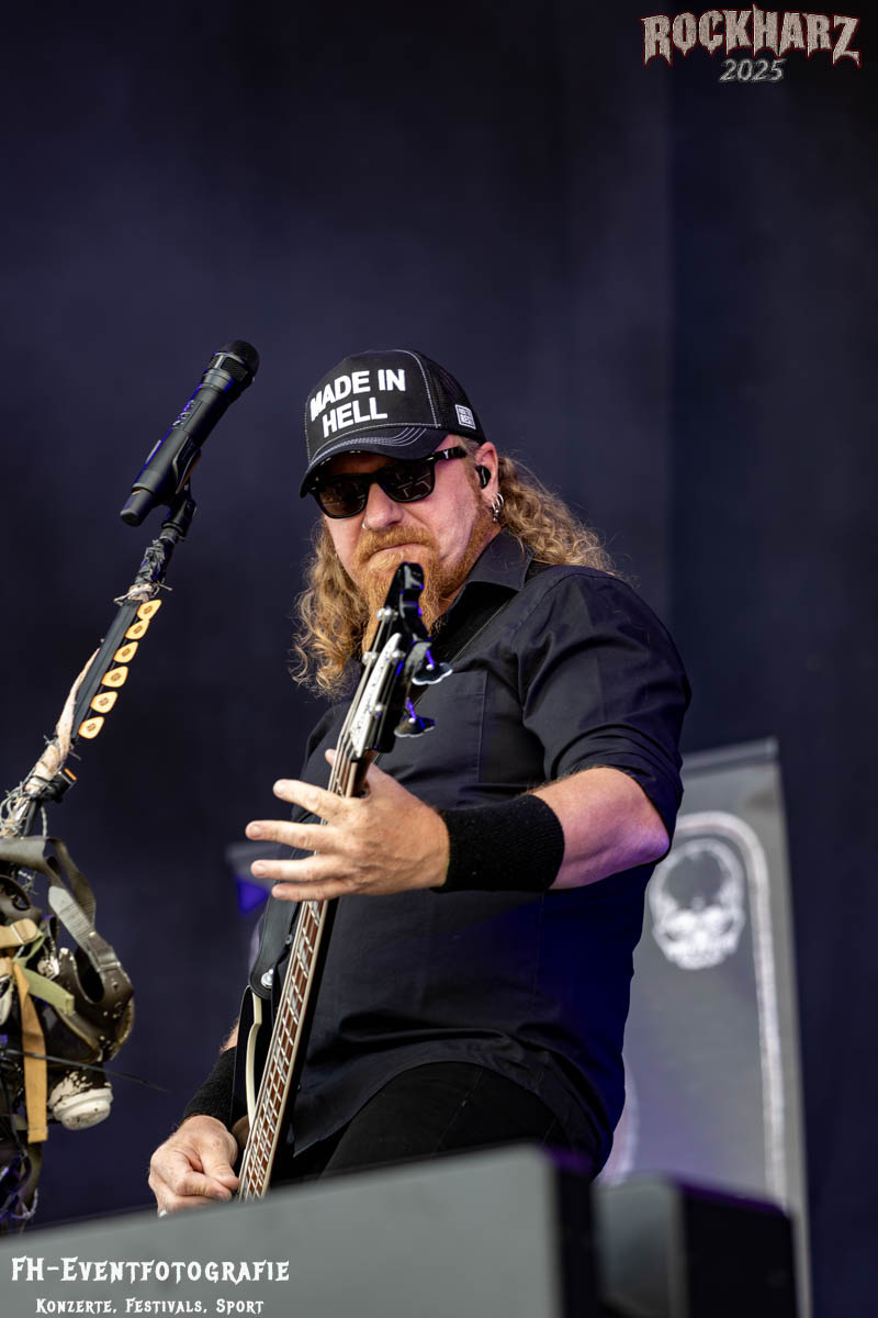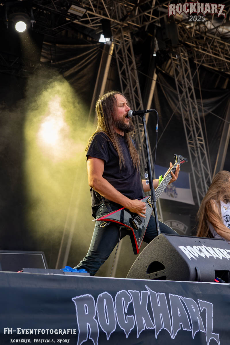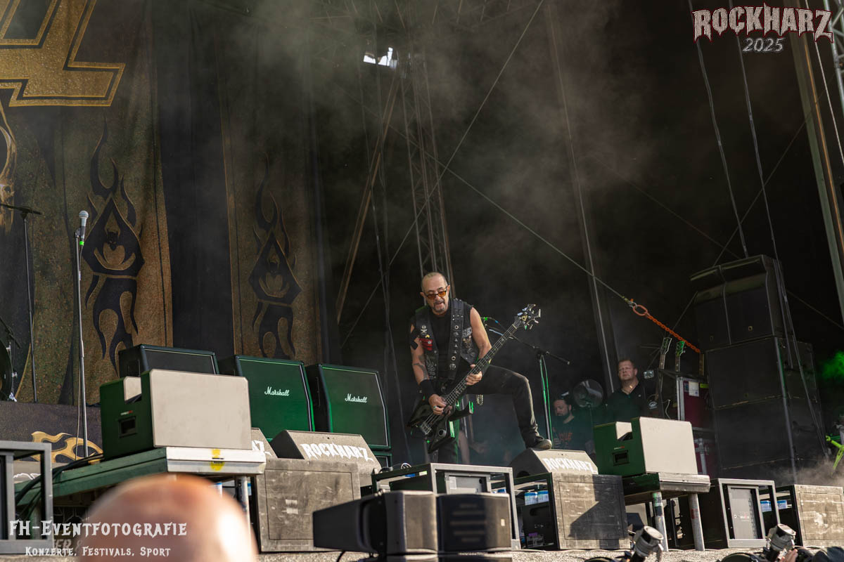 Band Nummer drei ist Overkill. Im Tageskalender die 11. Band des Tages. Mit 45 Jahren Bühnenerfahrung stehen die New Yorker schon als Band auf der Bühne. Deren Thrash Metal ist so stabil und gut, dass sie einfach wenig bis gar nichts falsch machen können. Und das haben sie auf dem RHZ 2025 wirklich und solide bewiesen. Ich habe dieses Konzert zum Kaffee und Quark beschaffen und genutzt. Der Quark war eine Empfehlung einer lieben Kollegin und der Kaffee ist auf dem RHZ immer richtig gut. Also was Leckeres zu essen und zu trinken und dazu geile Musik.
