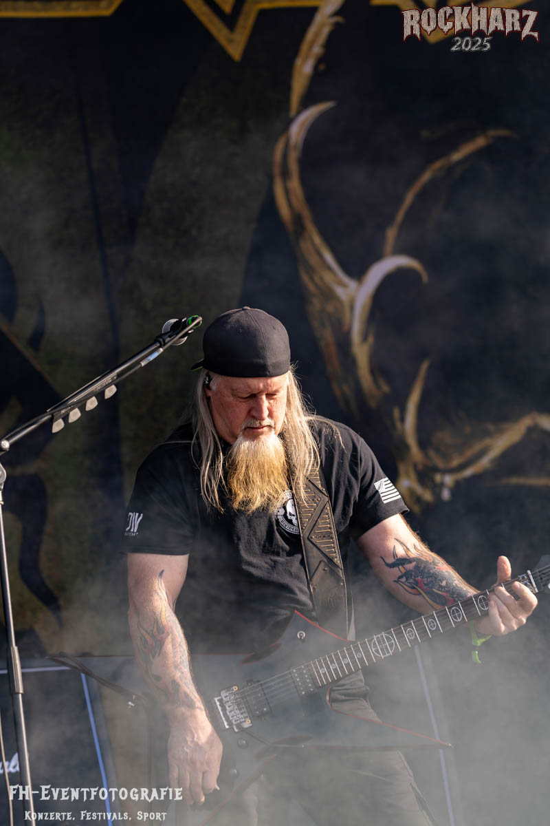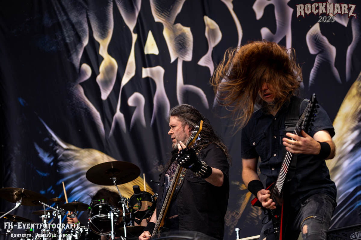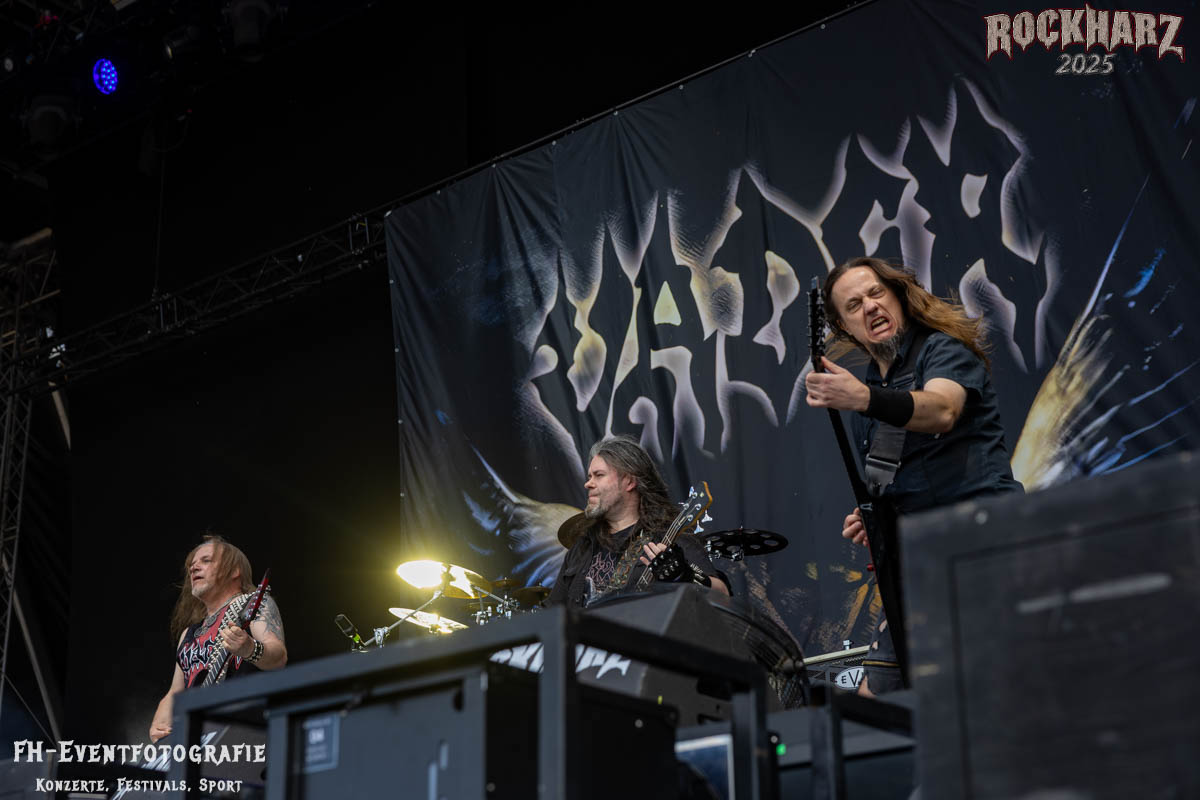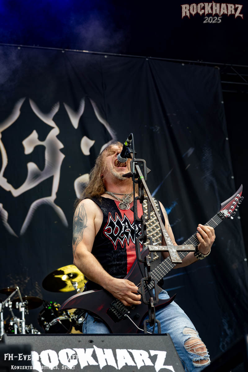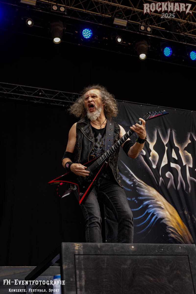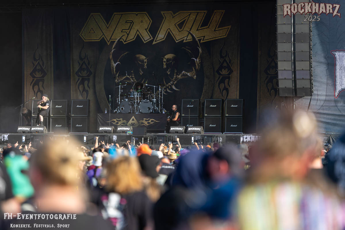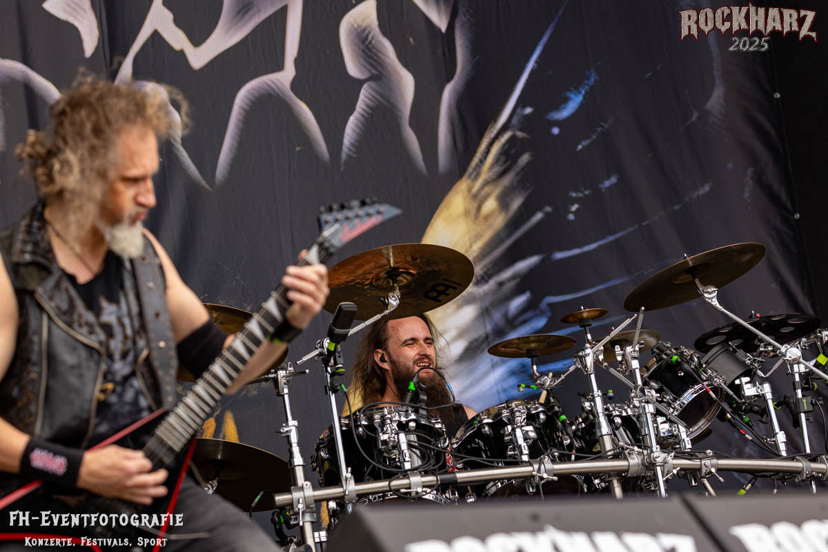 Band Nummer drei ist Overkill. Im Tageskalender die 11. Band des Tages. Mit 45 Jahren Bühnenerfahrung stehen die New Yorker schon als Band auf der Bühne. Deren Thrash Metal ist so stabil und gut, dass sie einfach wenig bis gar nichts falsch machen können. Und das haben sie auf dem RHZ 2025 wirklich und solide bewiesen. Ich habe dieses Konzert zum Kaffee und Quark beschaffen und genutzt. Der Quark war eine Empfehlung einer lieben Kollegin und der Kaffee ist auf dem RHZ immer richtig gut. Also was Leckeres zu essen und zu trinken und dazu geile Musik.