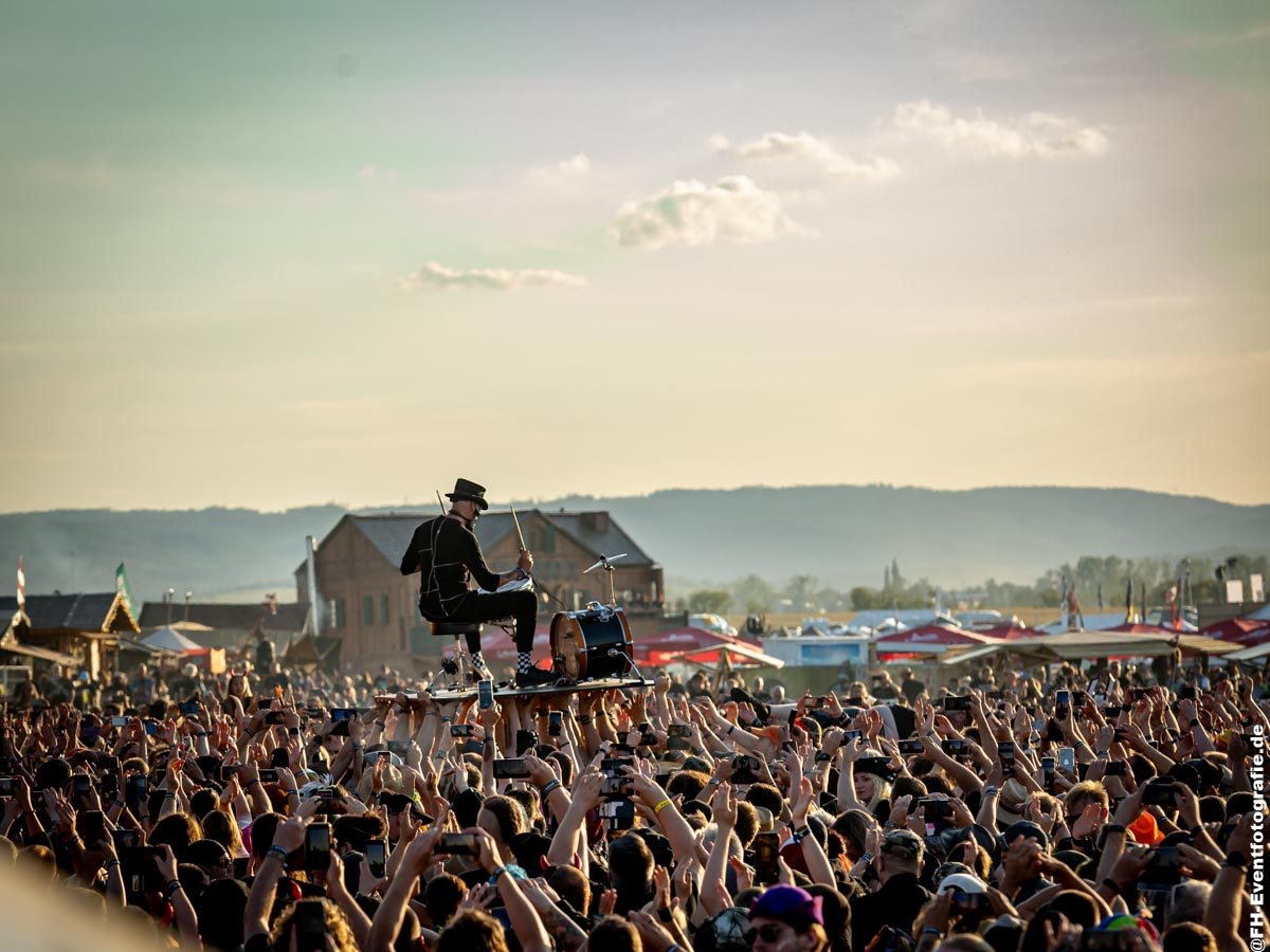 Fiddler’s Green ist wie immer eine einzige Partymeile. Das überlasse ich doch gerne den vielen jungen Festivalbesuchern, bevor ich mich und meine alternden Knochen da in den Weg stelle. Ich genieße die Musik einfach bei einem wunderbar kühlen Bier.