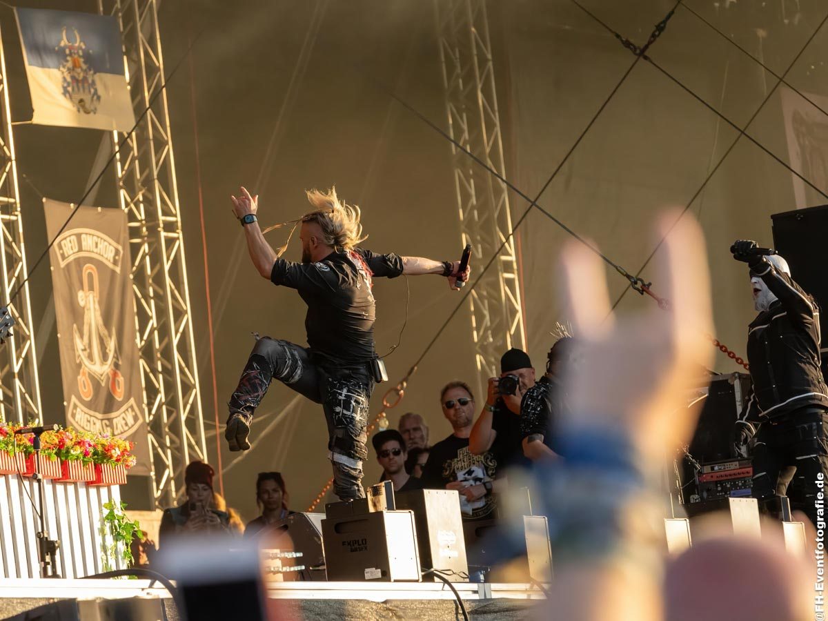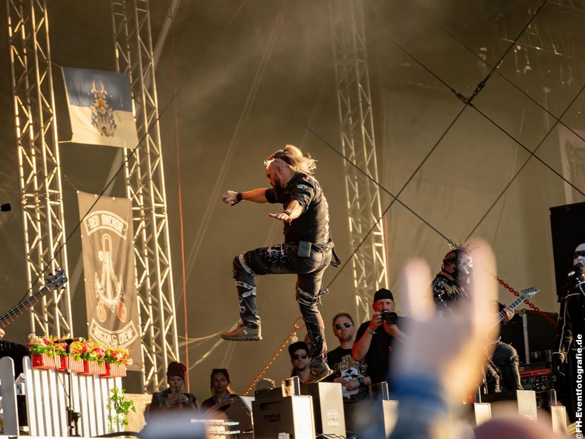 Schweren Herzens mussten mein Kollege und ich nun kurz zum Lager, um Platz für weitere Kollegen zu machen. So haben wir leider kaum eine Chance gehabt, eine Legende zu genießen. Unter gleißender Sonne konnten wir die Ankunft, Die Apokalyptischen Reiter nur kurz genießen und sie als Soundtrack benutzen, um die nötigen Umzugsarbeiten auf dem Campingplatz zu beschleunigen. Hat geklappt. Die Reiter hauten ein Best of raus. Ich persönlich liebe ja deren Akustikalbum Tiefer, aber hier auf dem Rockharz 2023 ist es natürlich und richtig, die Fans ausschließlich mit deren harten und härtesten Seite zu beglücken.