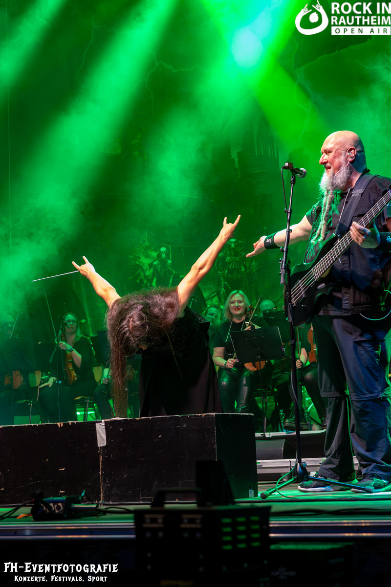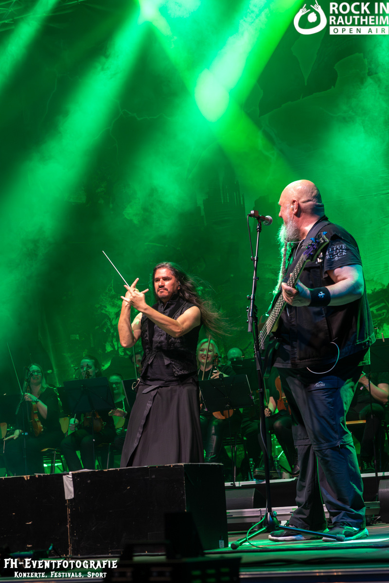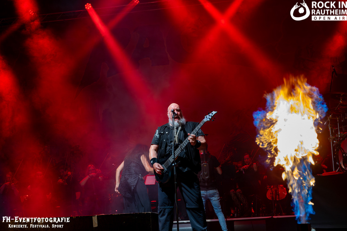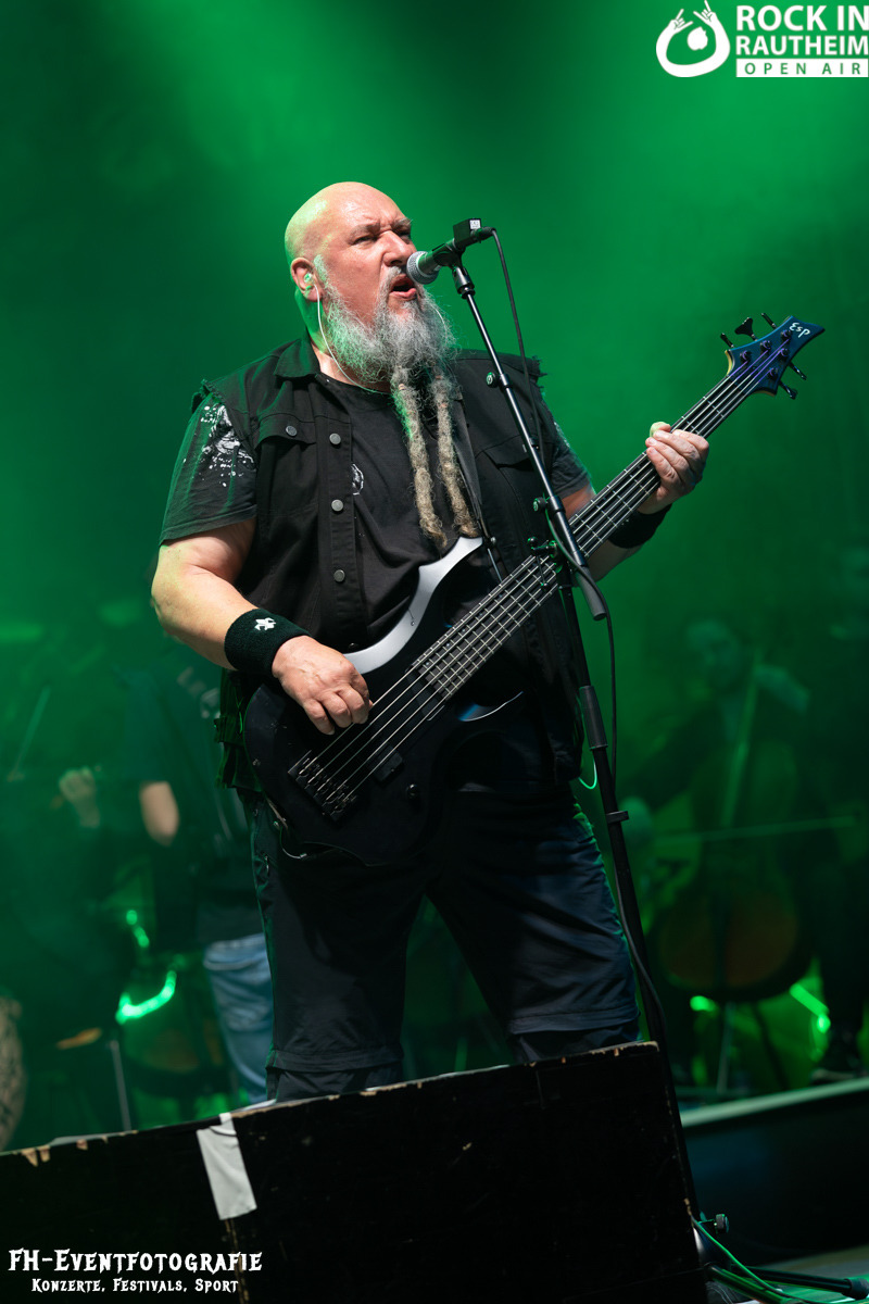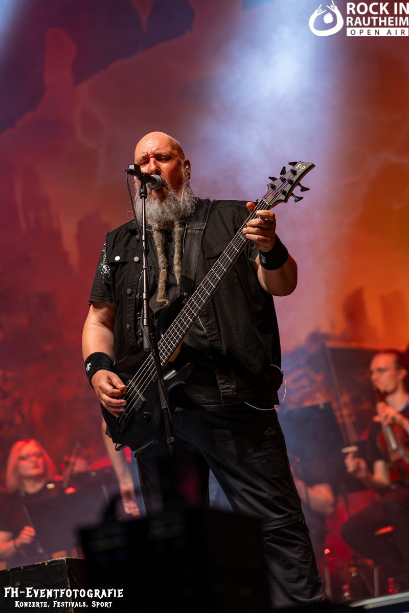 Nun kam der grandiose Abschluss des ersten Tages des Rock in Rautheim. Es betraten Rage und das Lingua Mortis Orchester der TU Braunschweig die Bühne. Über eine Stunde spielten sich die Herren aus Herne durch Nebel, Licht und Feuer in die Herzen der rund 2000 Fans vor der Bühne. Zum Glück für uns alle war Peavy bei bester Stimme. Kein Anzeichen mehr von einer Unbill, die Rage den Tourauftakt etwas eingetrübt hatte. Er spielte und er sang so großartig, wie ihn wohl alle in Erinnerung hatten. Diese Urgesteine gibt es bereits seit rund 40 Jahren und das zelebrierten sie aus vollen Zügen. Sie spielten fast schon eine Werkshow. Vieles, womit sie zu der Größe der deutschen Metal-Szene geworden sind, wurde dank des unterstützenden Orchesters geradezu zelebriert. Einige absolute Perlen der frühen Jahre dieser einzigartigen Band blieben bei der „Kürze“ des Slots leider auf der Strecke. Aber gleichwohl war das ein wirklich großartiges Konzert und kann als Dank für den ersten Tag dieses Festivals auch für alle Beteiligten gesehen werden. Wenn sich alle wohlfühlen, läuft es einfach.