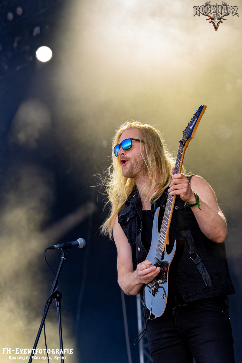 Beim Essen wurde ich glatt wie magisch zurück zur Bühne gezogen. Eine unglaublich gute Gesangsstimme mit einer riesigen Range, die so spielerisch abgerufen wurde, dass alleine der Gesang schon für den Perlenstatus ausgereicht hätte. Dynazty spielten sich nicht nur in meinen Synapsen. Die Sonne hatte sich mittlerweile wieder dazu entschieden, die Reste des Wolkenbruchs weg zu dampfen. Zu diesem Auftritt kann ich nur sagen, alles, was ich bisher in meiner Playliste von denen hatte, wurde dem Auftritt nicht gerecht. Was eine großartige Band.