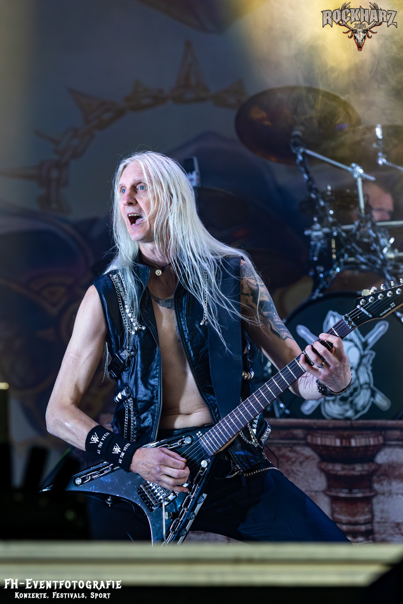 Als Erstes spielten HammerFall. Solide, routiniert und kompromisslos auf die eigenen Altbewerten-Bandwerte konzentrierend, war das eine Show, die voll auf die Fanbase von »Hammerfall« abgestimmt war. Das sorgte bei einigen Festivalbesuchern für eine Bier- und Shoppingpause, bevor es im Anschluss so richtig laut wurde.